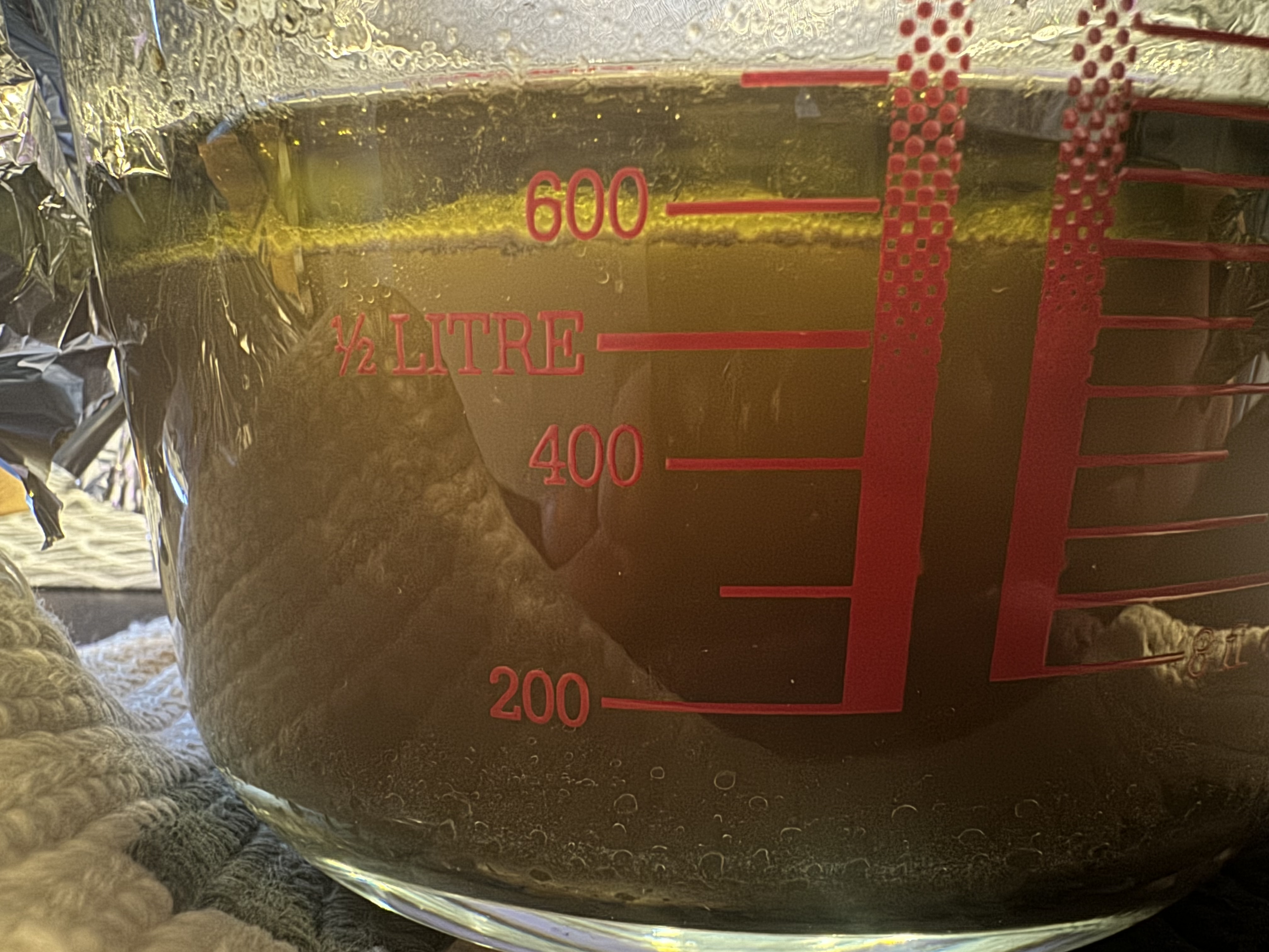 Habe jetzt aus 125g Gee, was noch da war, und 125g Butter (plus den Pflanzenabschnitten, die ich leider vergessen habe zu wiegen , waren zwei halbe 3L Gefriertüten) anscheinend 100g Fett übrig, was gerade abkühlt.