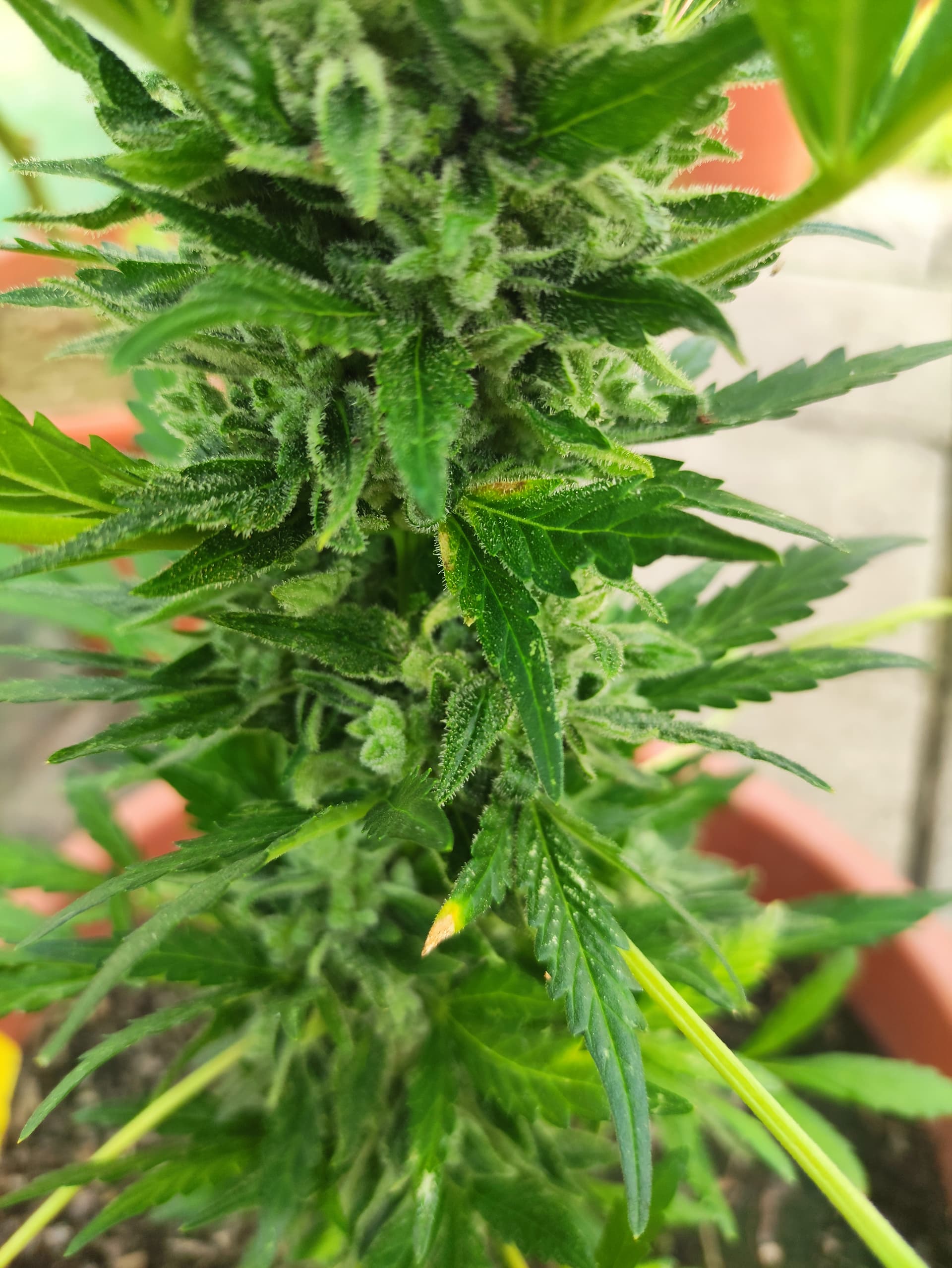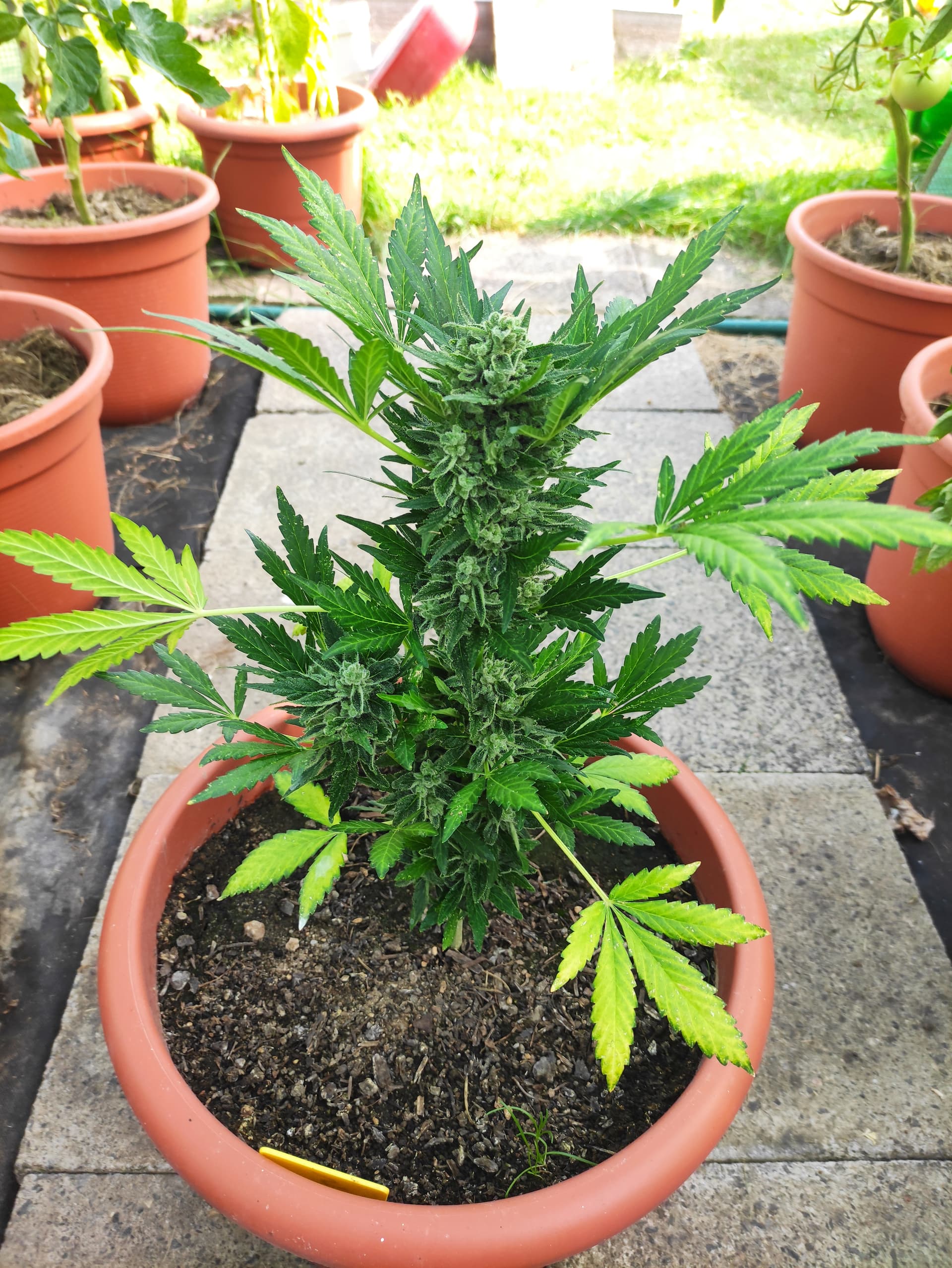 bin zwar schon ein Oldie hinsichtlich meines Alters, aber noch ein ziemlicher Anfänger was Cannabisanbau betrifft (2. Grow, outdoor, Gewächshaus). Habe unter meinen Ladys aktuelle eine Royal Creamatic auto von RQS. Sie wächst in einem 12-Liter-Topf mit einer 1:1 Mischung aus vorgedüngter Bio-Kübelpflanzenerde (Baumarkt) und Gartenkompost, aufgepeppt mit Bio-Pferdedung und Perlit. Außerdem haben alle Pflanzen vor 10 Tagen eine Gabe EM sowie ein bisschen Flüssigdünger aus meinem Bokashi-Eimer (natürlich alles verdünnt) erhalten. Die Pflanze ist am 10.6. gekeimt und 3 Wochen später in den jetzigen Topf umgepflanzt worden. Gegossen wird je nach Wetterlage meist alle 2 Tage (teils Regen-, teils Brunnenwasser: um Fragen vorzubeugen: PH-Wert ist im Grünen Bereich). Laut Breeder-Angaben sollte mit einer Ernte 12-13 Wochen nach Keimung gerechnet werden, also ab 2.9. oder 9.9. Doch nun sind seit gestern die Hauptblätter gelblich geworden, und auch einige Blätter am Hauptbud weisen erste gelbliche Stellen bzw. vertrocknete Ränder auf. Sie sitzen aber noch fest - habe vorhin dran gezupft und sie nicht rausziehen können - also keine Budfäule