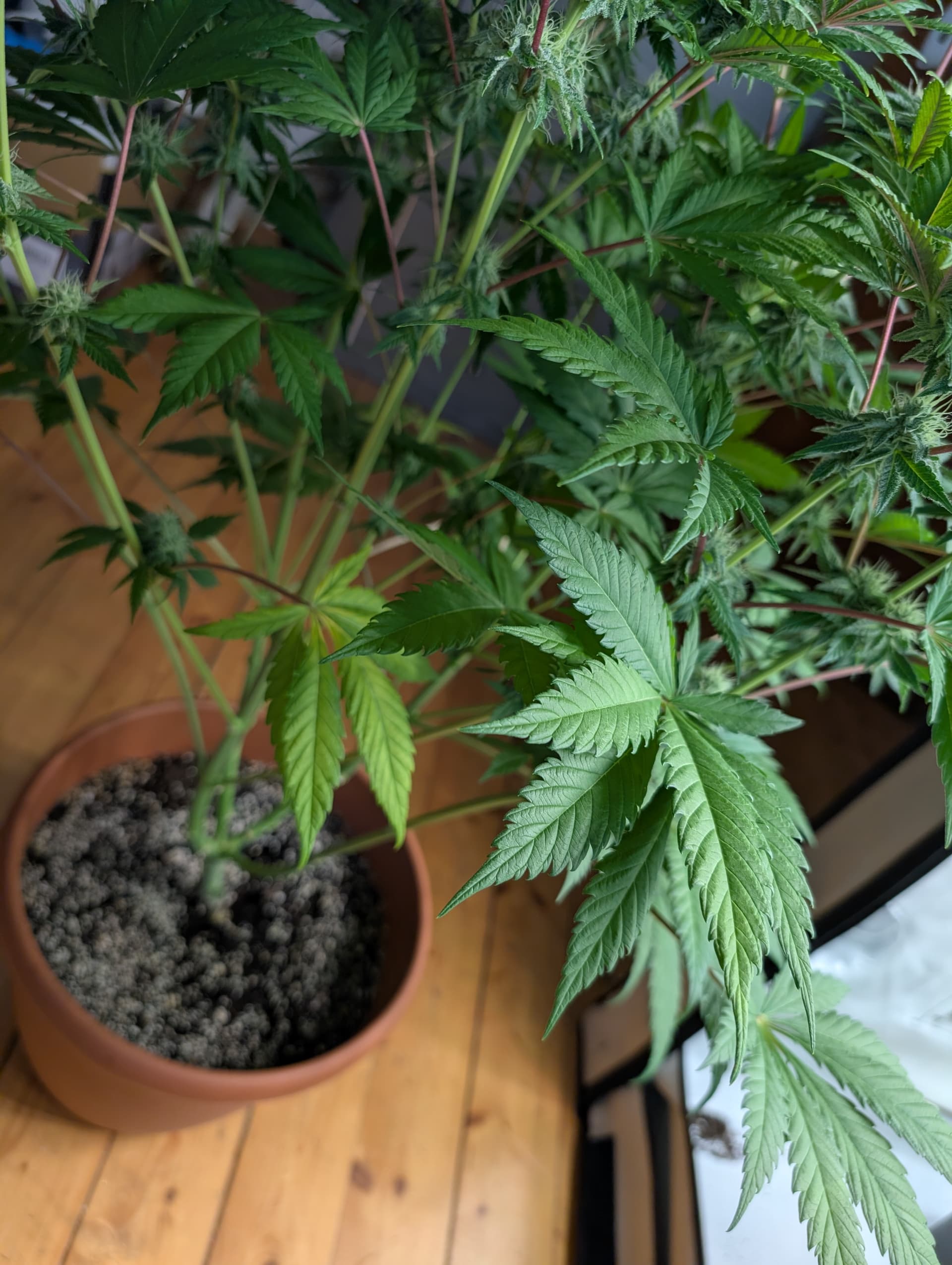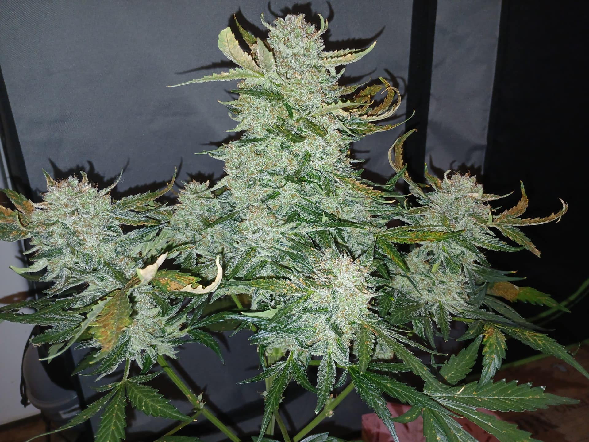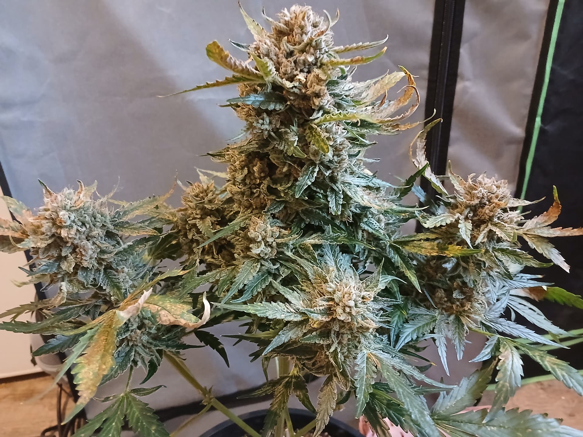 Da ist sie kurz vor der Ernte. Ungefähr 3Wochen nur noch Wasser und runtergeregelte DLI über die letzten 3 Wochen gesenkt. Die ist ca. 64Tage alt geworden und von der Zeit habe ich 3Wochen alles runter gedreht was sie braucht um zu wachsen und trotzdem das raus geholt. Gewicht weiß ich noch nicht aber denke wird sich so um 40g drehen.