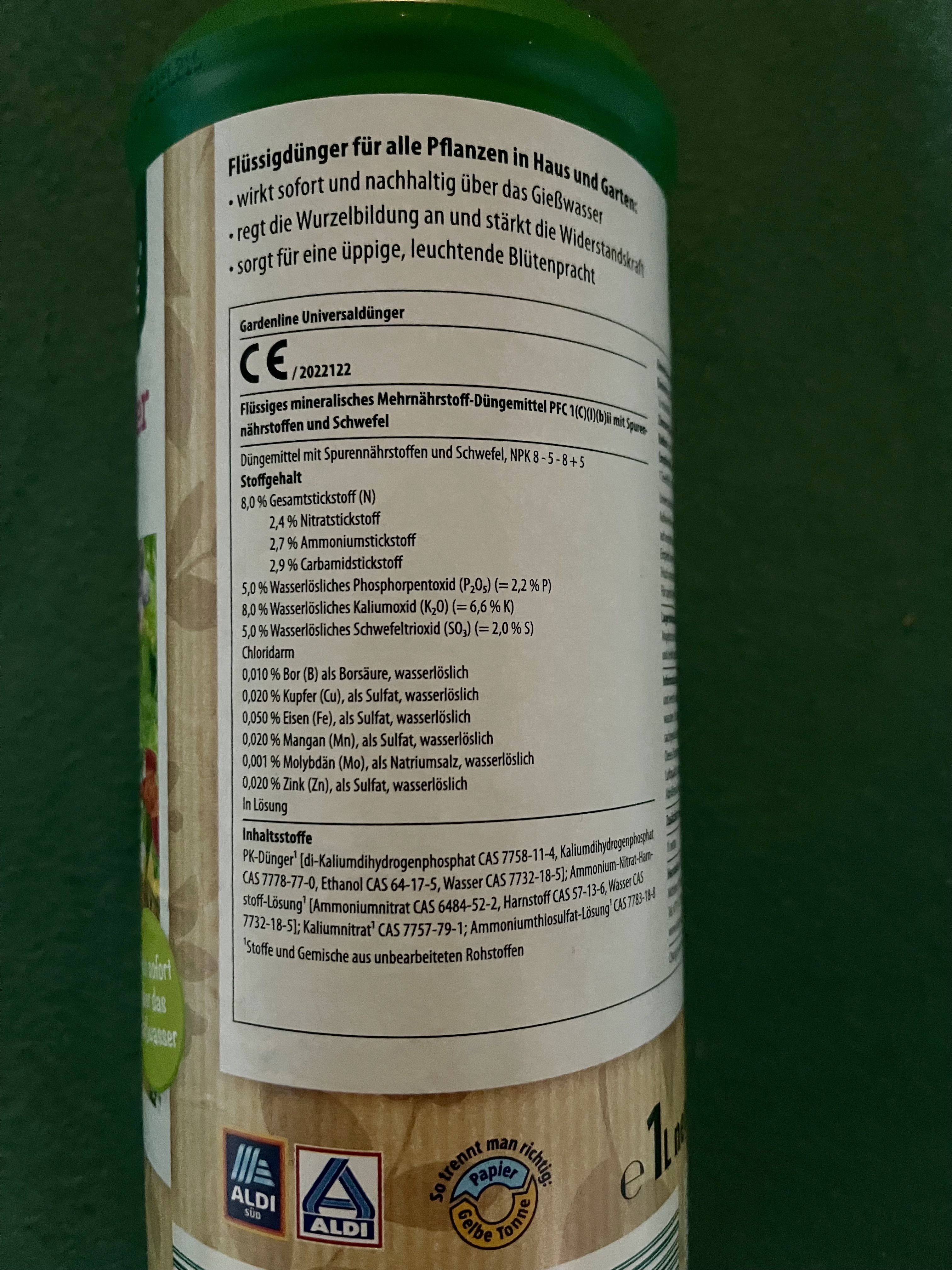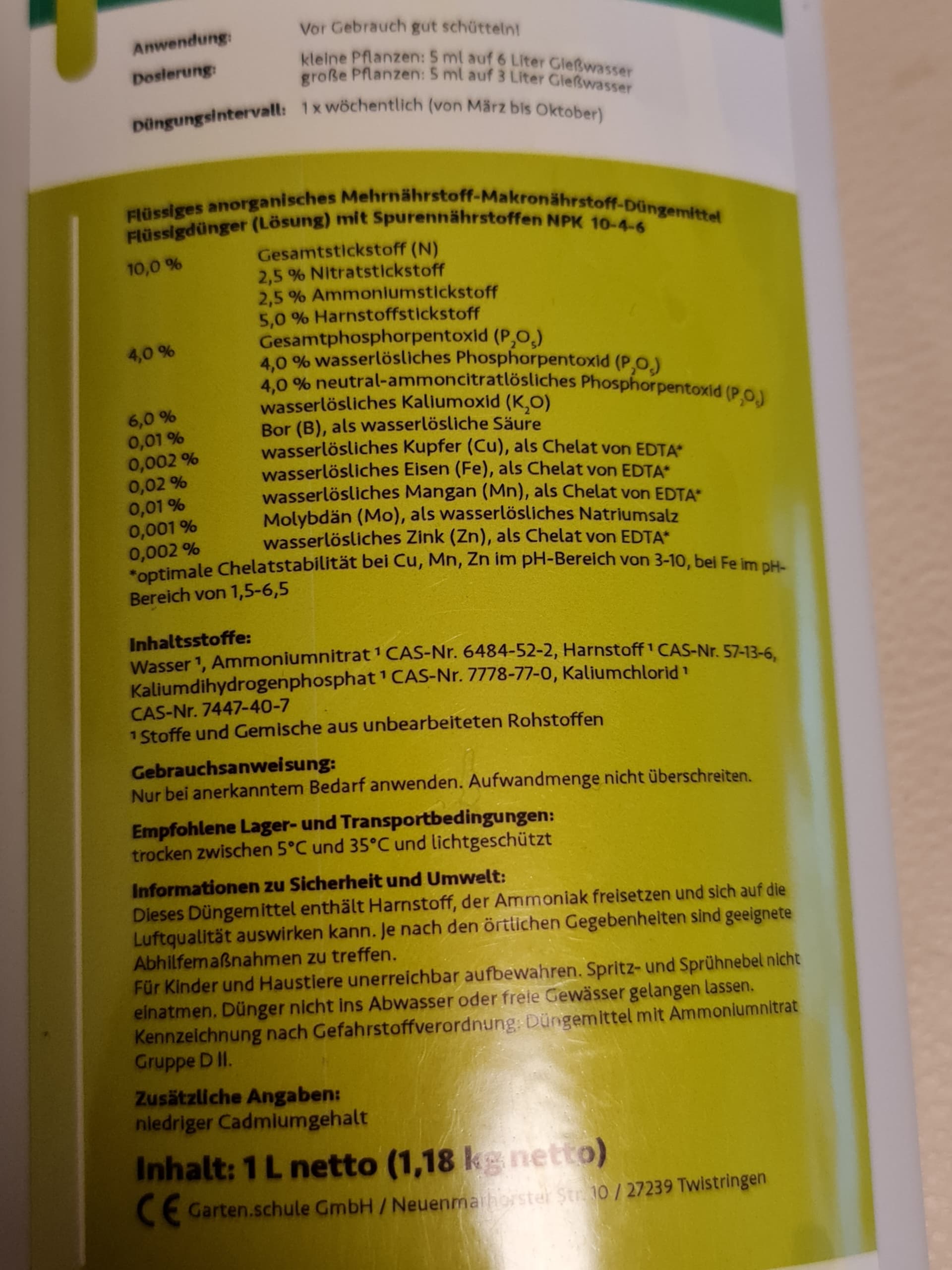 Verglichen mit dem Compo BIO Tomaten Langz.-Dünger (6+3+5) der hier eine Dosierempfehlung von 10g/L hat, jedoch N (3-fach) und K (2,5-fach) höher sind als bei meinem Dünger (2+2+2), so kommen mir die 6,6g/L rechnerisch etwas niedrig vor.