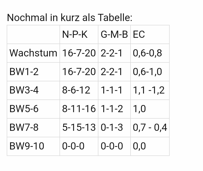 @anon38627133 Es ist was dran, dass viele Dünger zu viel Phosphat haben, aber du hast schon Recht, ganz ohne gehts auch nicht. Zudem verändert sich der Nährstoffbedarf über die generative Phase hinweg. P und K, genauso wie Ca und Mg werden mehr benötigt, N wird weniger wichtig, was aber nicht heißt, dass man es komplett weglassen kann, außer ggf. in den letzten beiden Blütewochen.