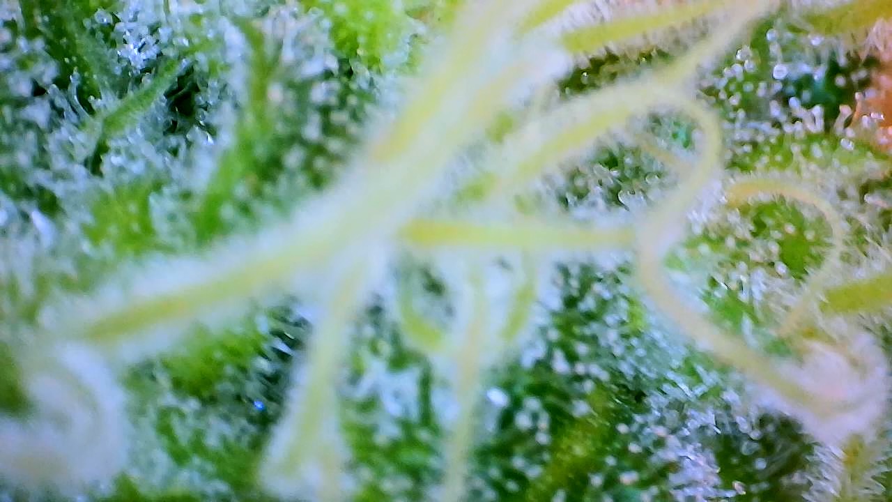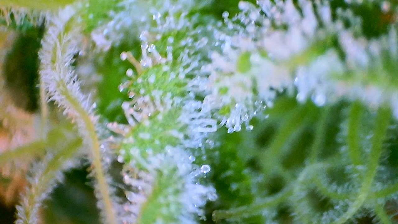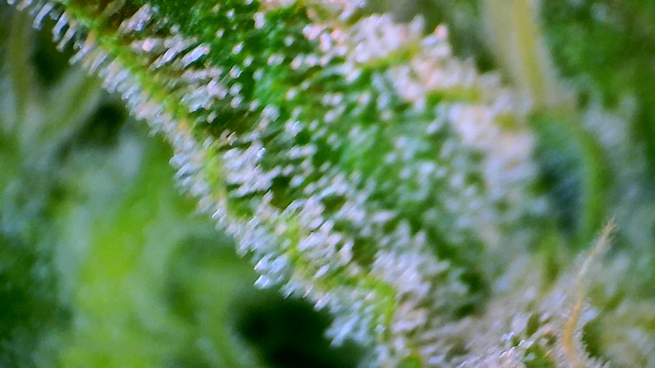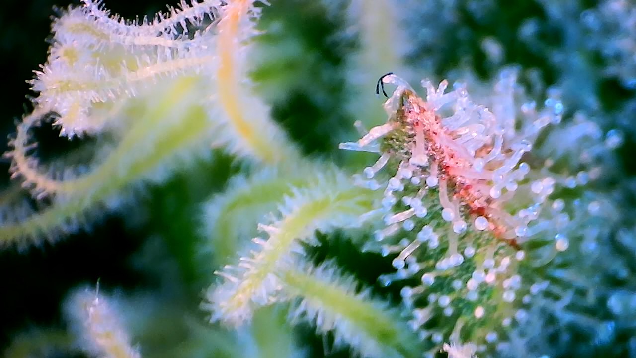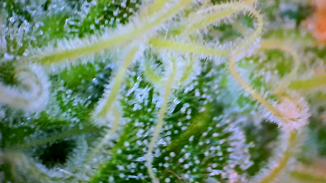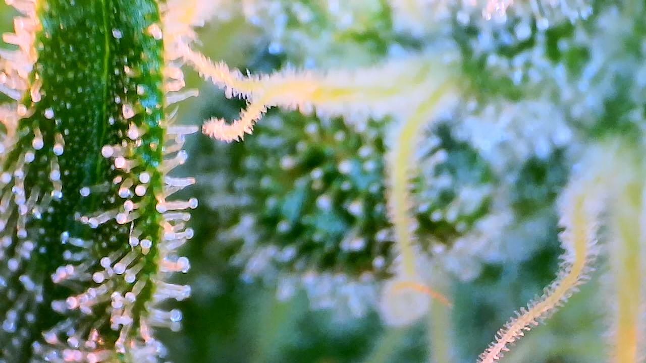 So wie in meinem Bildchen sieht man die Härchen auf den Stigmen, da kommen keine Trichome, ringsrum auf den Blättern sieht man sie aber bei mir …alles fensterklar…Ernte in ferner Zukunft … Es dauert…