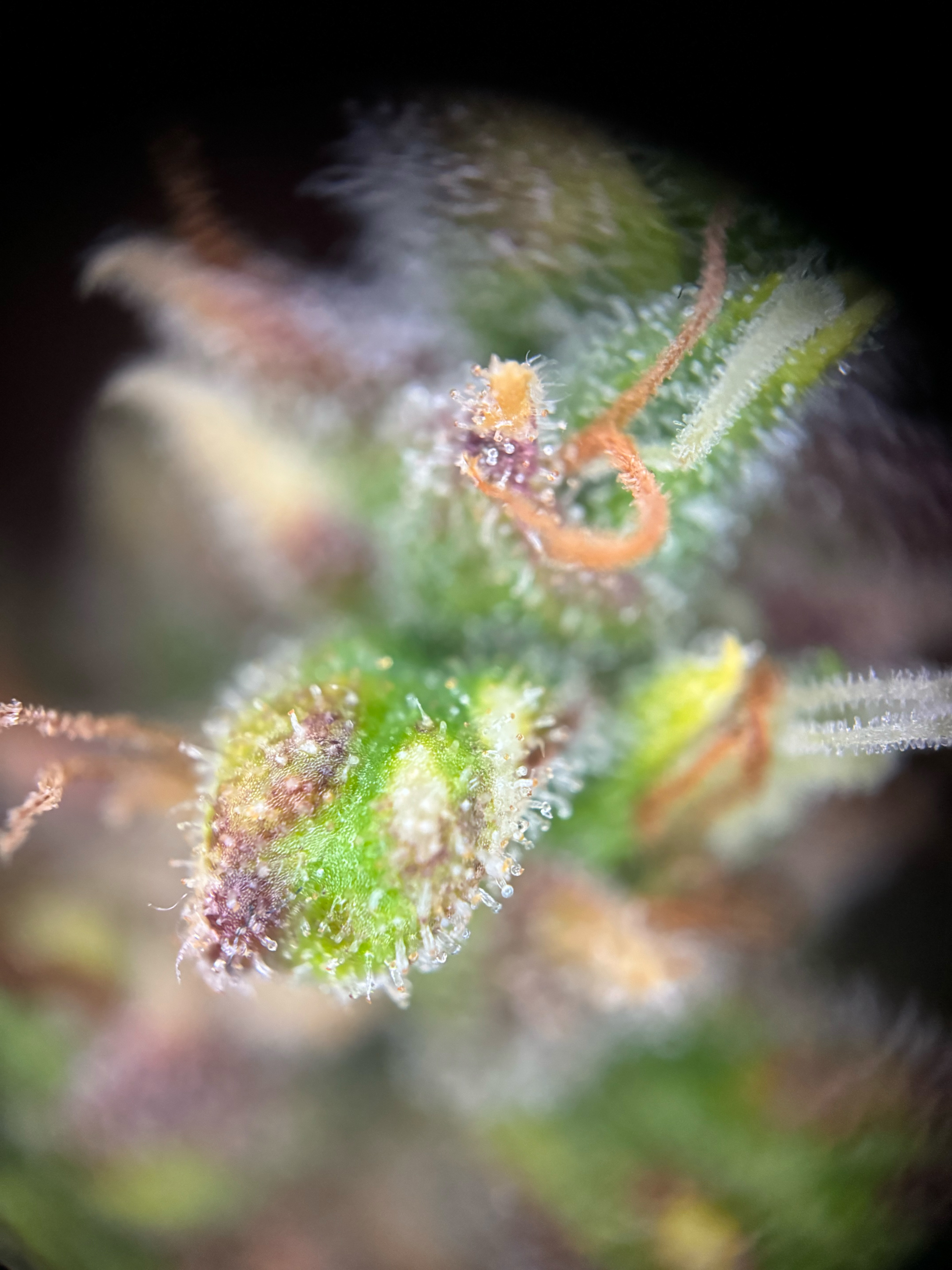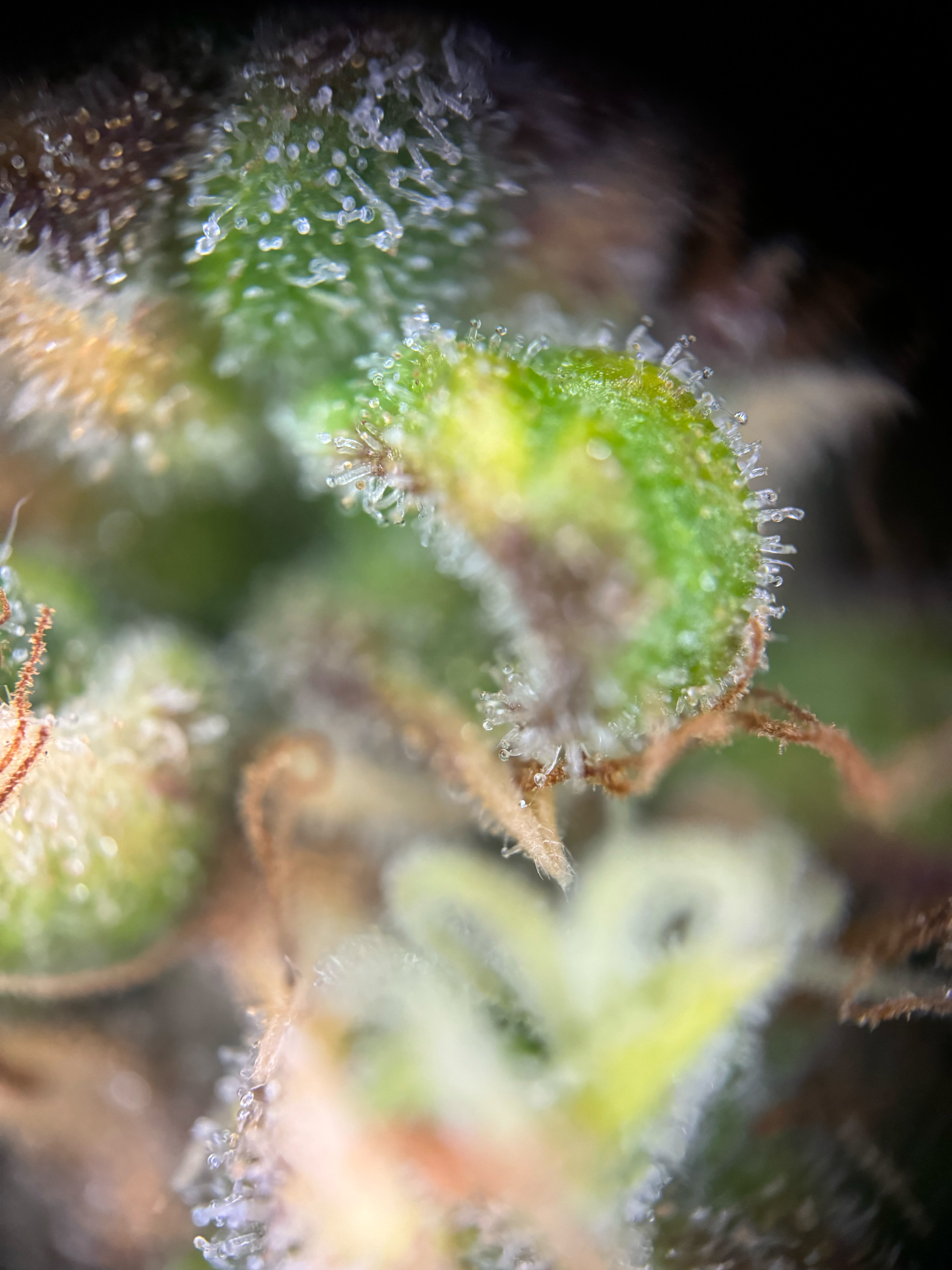 um die reife richtig feststellen zu können müsstest du dir die blüten direkt anschauen mit dem mikroskop, das was man hier an trichom köpfchen sieht sind die trichom köpchen der zuckerblätter, die reifen in der regel deutlich schneller als im inneren des bud’s, rein optisch würde ich aber denken das die noch ein wenig zeit bräuchten