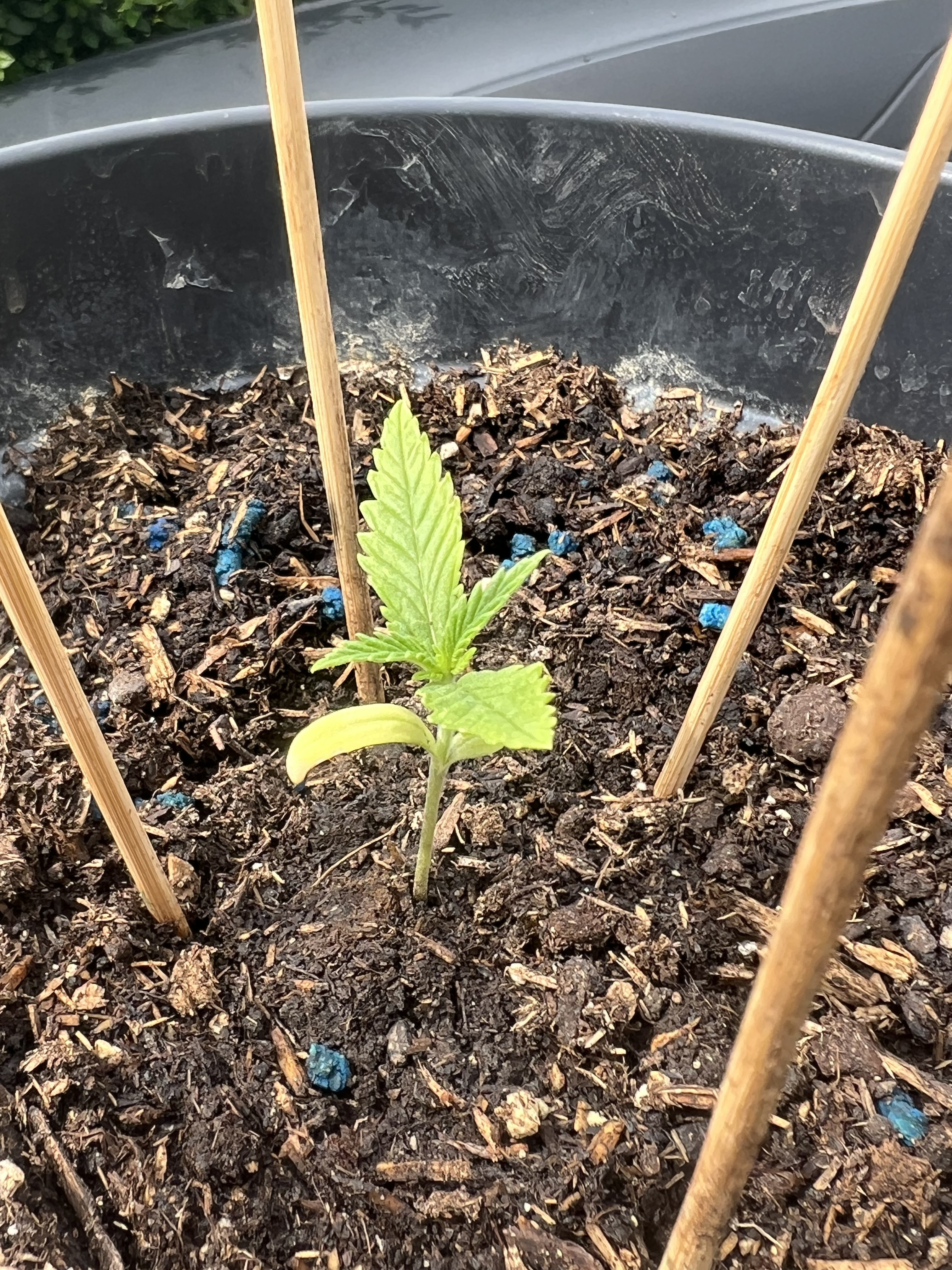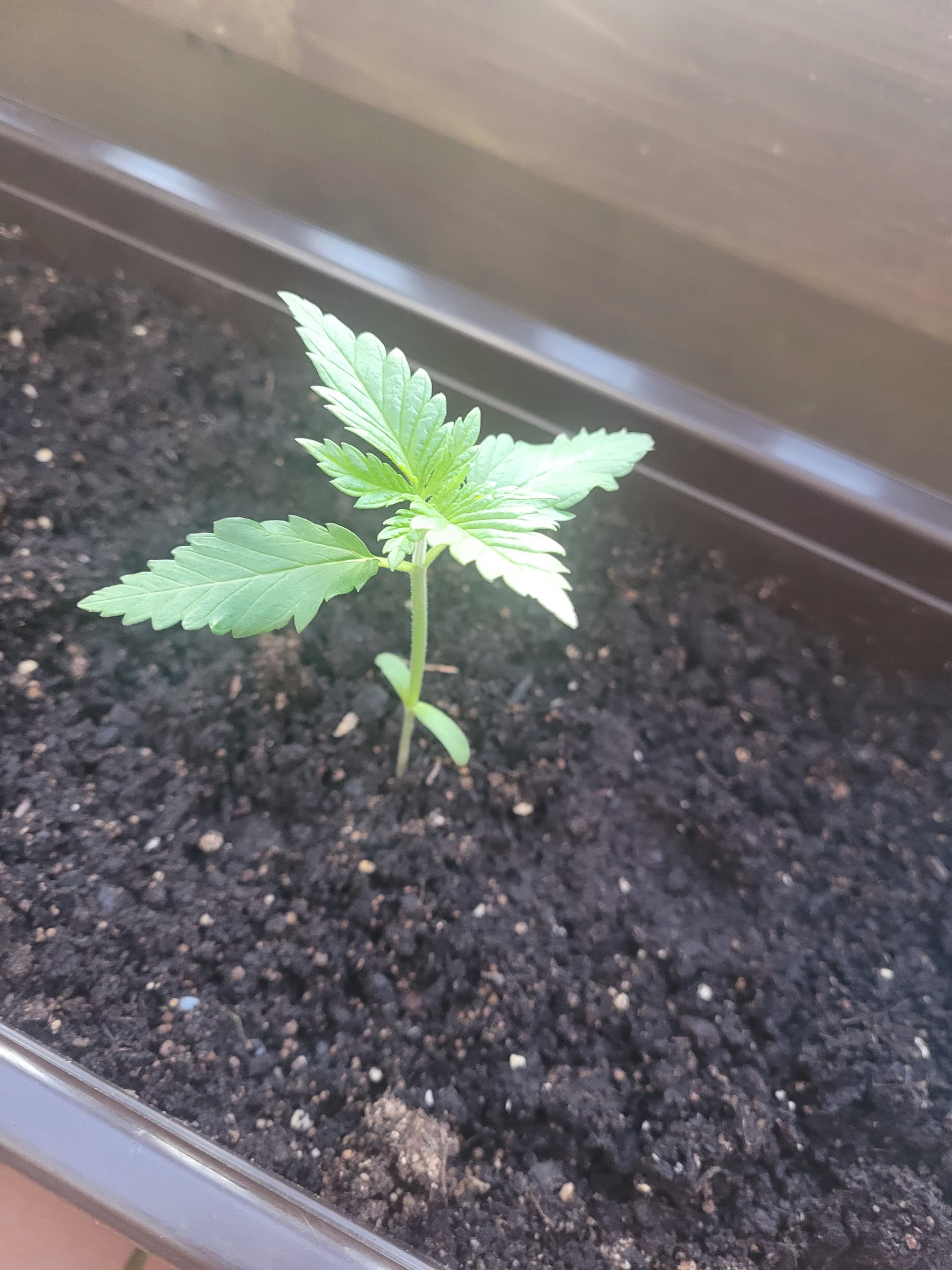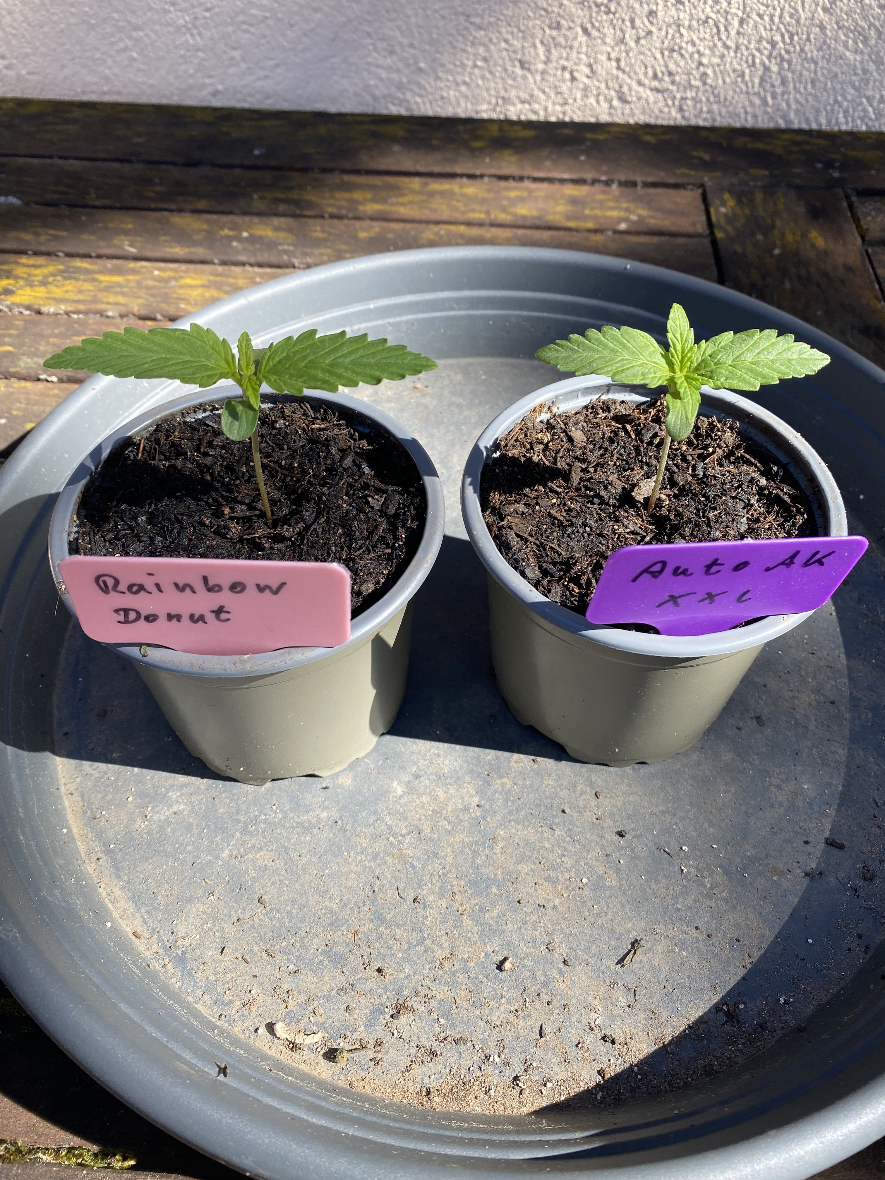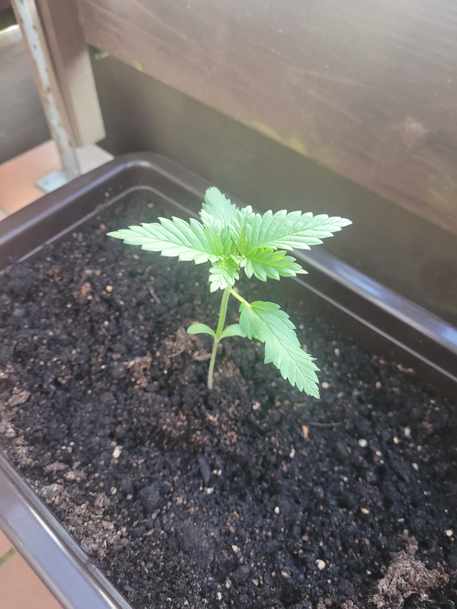 Am 31.03. hab ich die Samen in die Erde gedrückt. Ehrlich gesagt hab ich keine großen Anstrengungen unternommen. Ich hatte sie bis das Gröbste überstanden war bei meinen Tomaten im Zelt stehen und seit die Sonne etwas Kraft hat stehen sie draußen. Deshalb ist die LSD auch ein Zwerg geblieben. Die hat im Kleinkindstadium ihren ersten Orkan überlebt und es sogleich mit Wachstumshemmung quittiert.