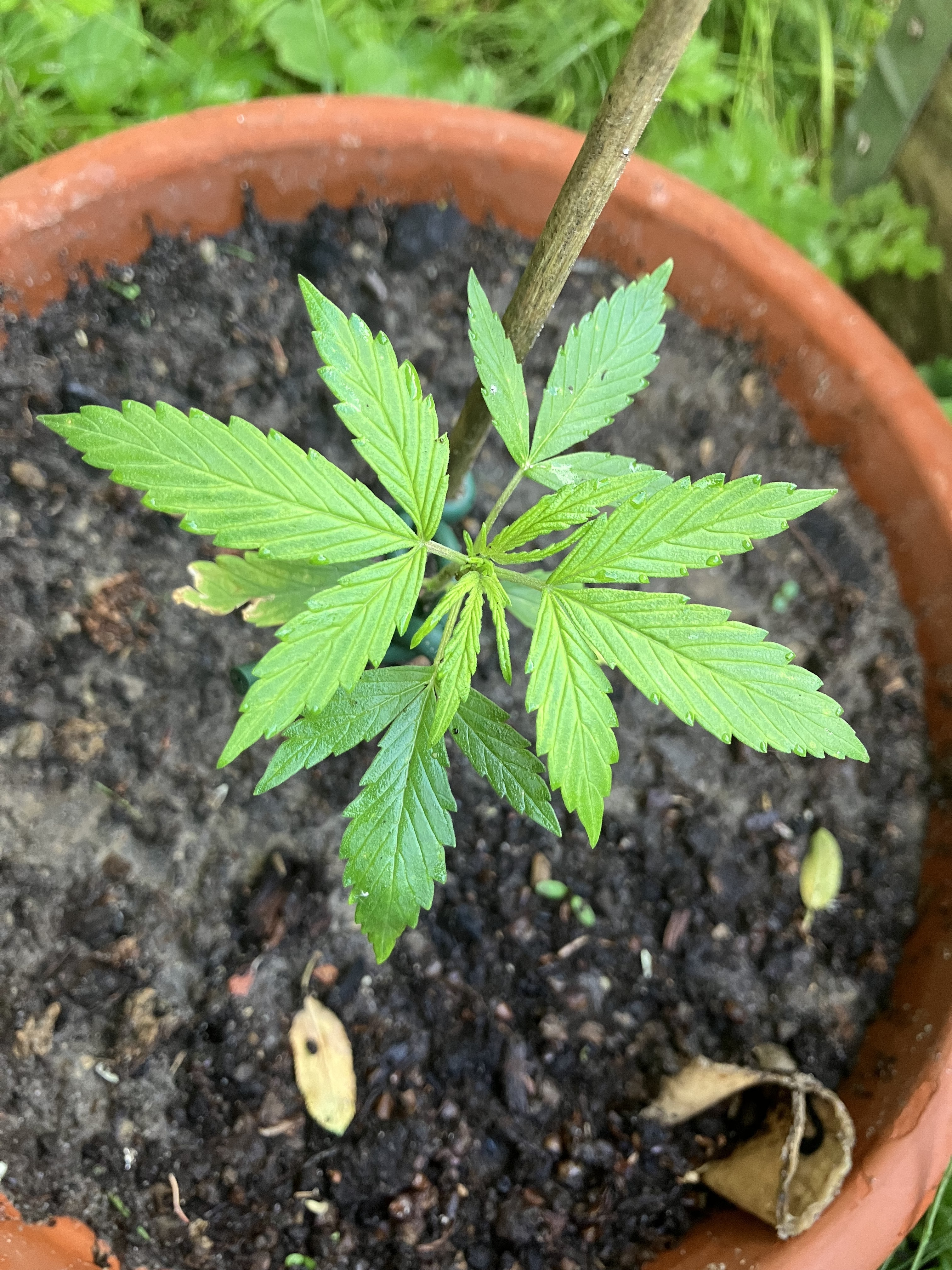 Ich habe mal vorsichtig was Kleines abgezwackt. Ich gucke und mache ganz vorsichtig… Also jedenfalls verhält sie sich als Hanfpflanze mit dem Look extrem unauffällig. Sie duftet zwar, aber nicht übertrieben und ganz angenehm.