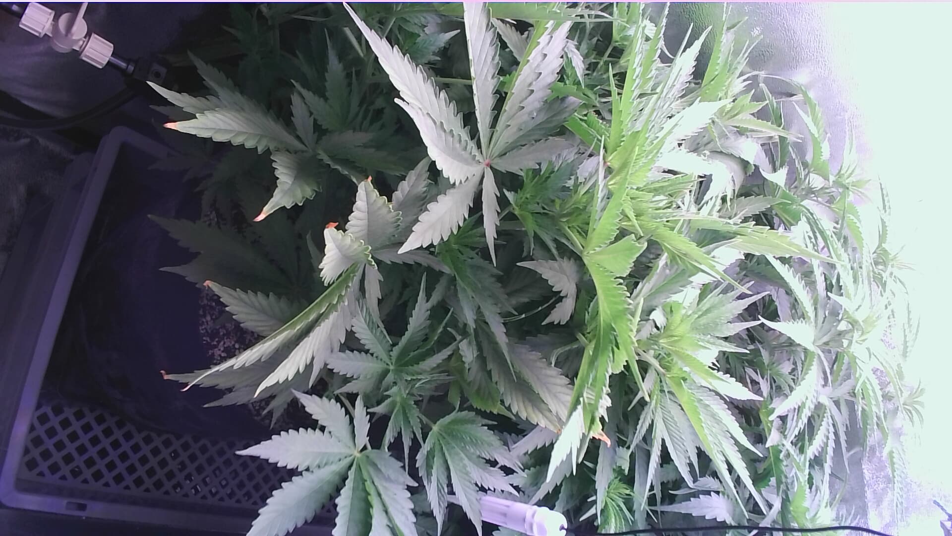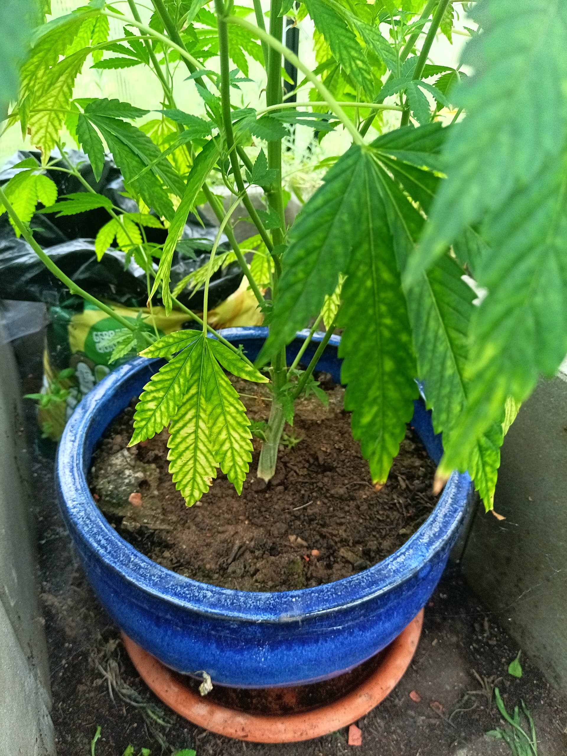 Könnte ein Stickstoffmangel sein, (vom Gesamteindruck her) aber die Blüte ist ja schon recht weit, wenn überhaupt also nur dezent noch nötig sollte die Ernte sich verzögern.