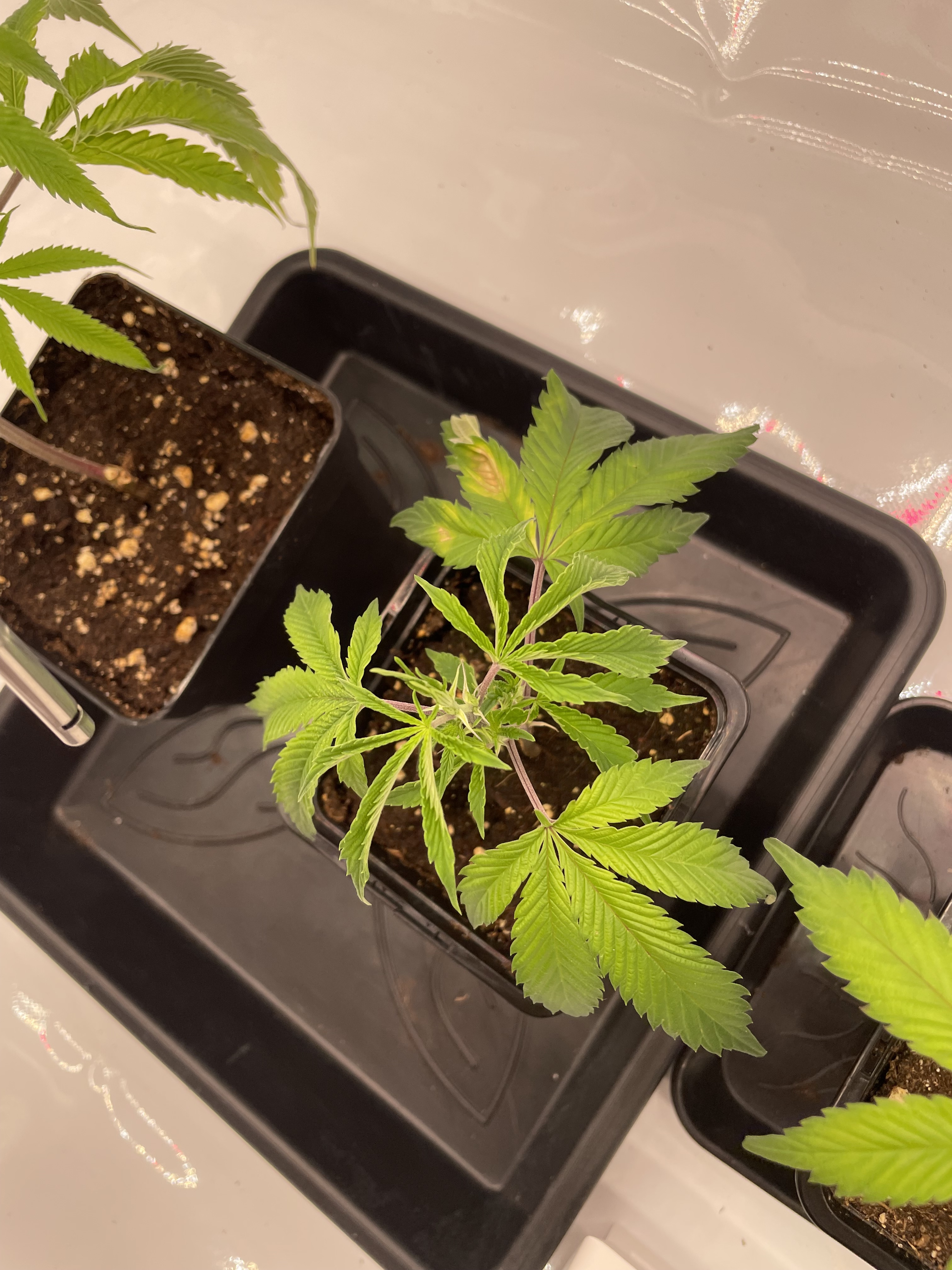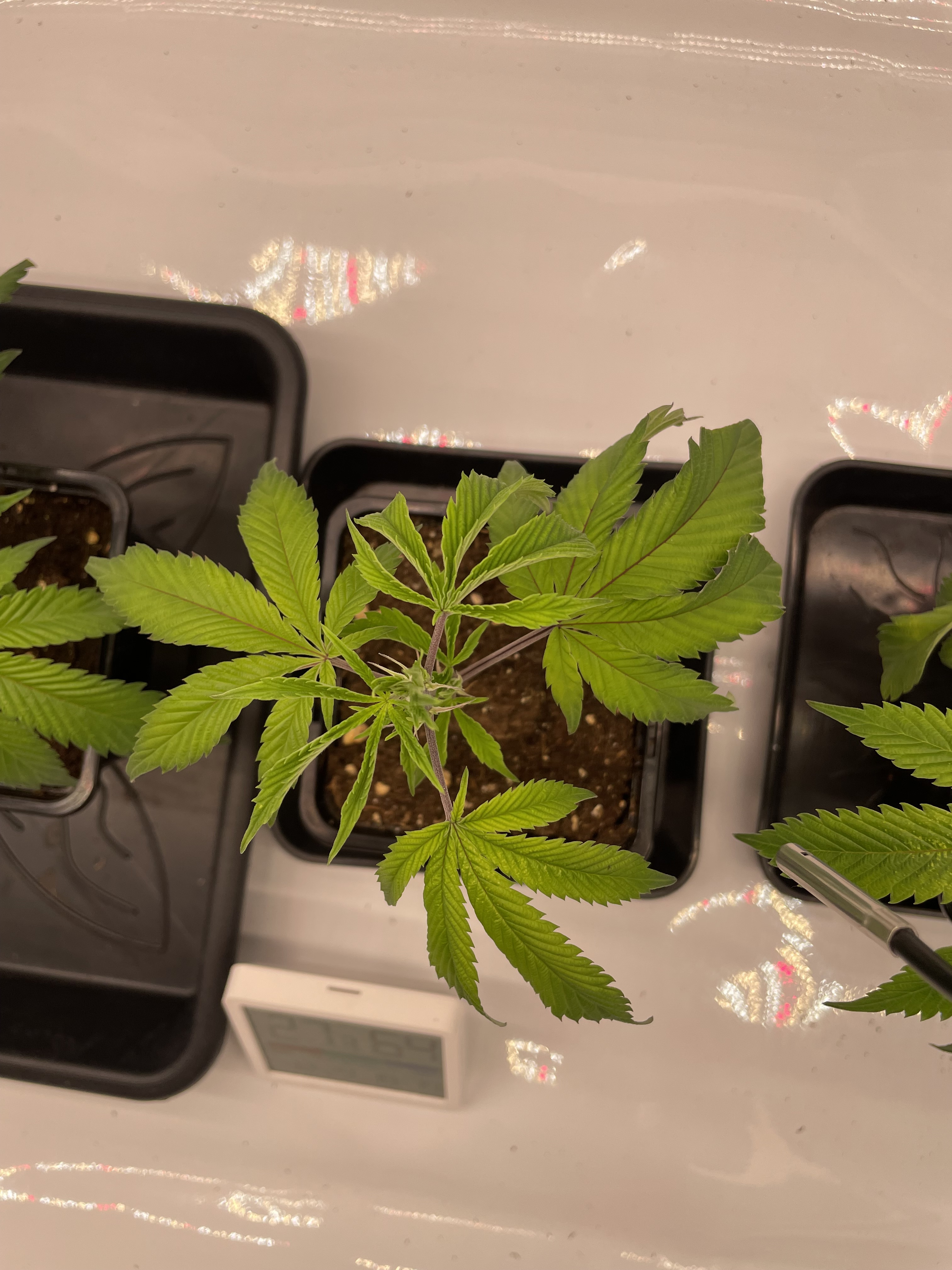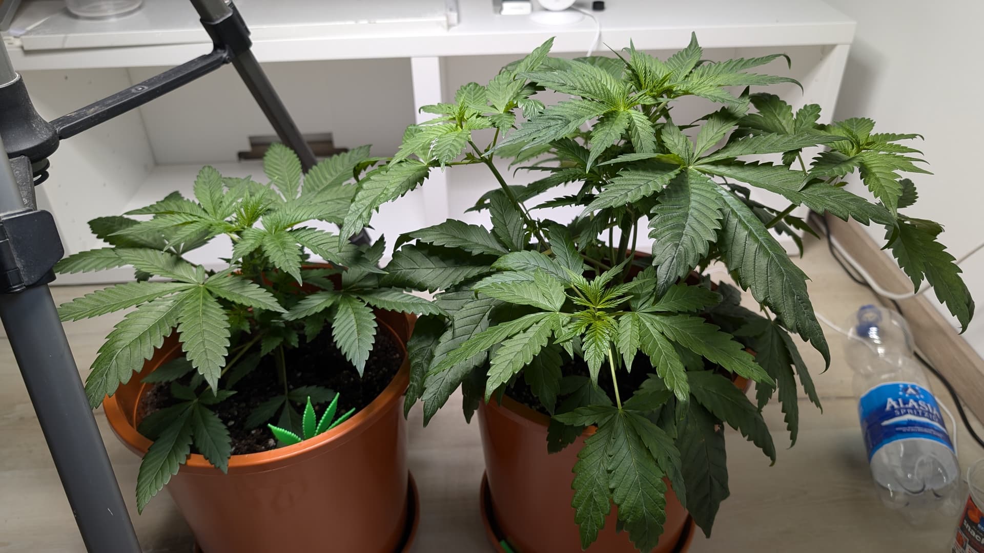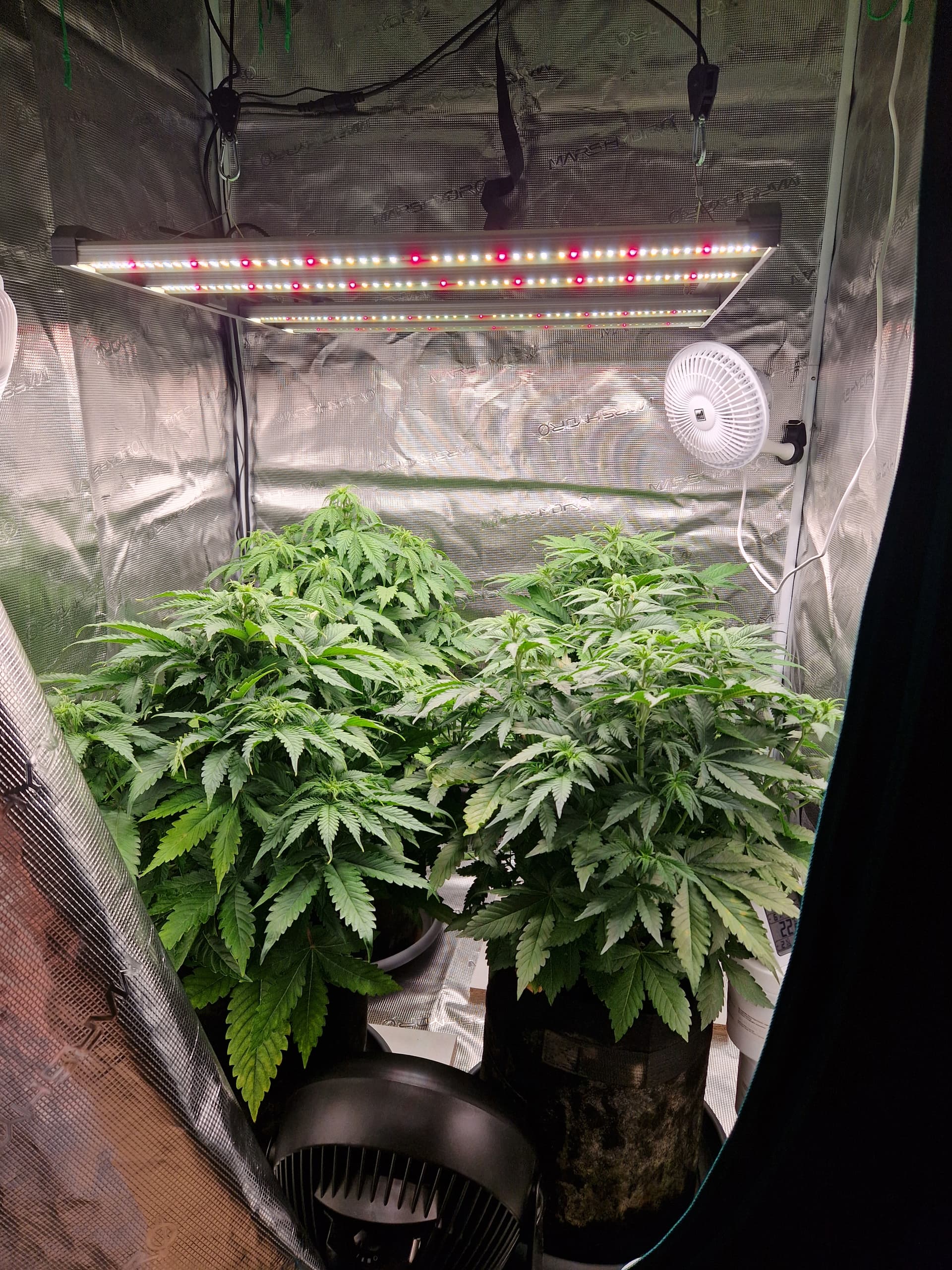Meine beiden Damen sind etwa 2-3 Wochen auseinander. Die große ist jetzt in der Vorblüte, die Kleine braucht noch. Ich hab nur ein Lampe.