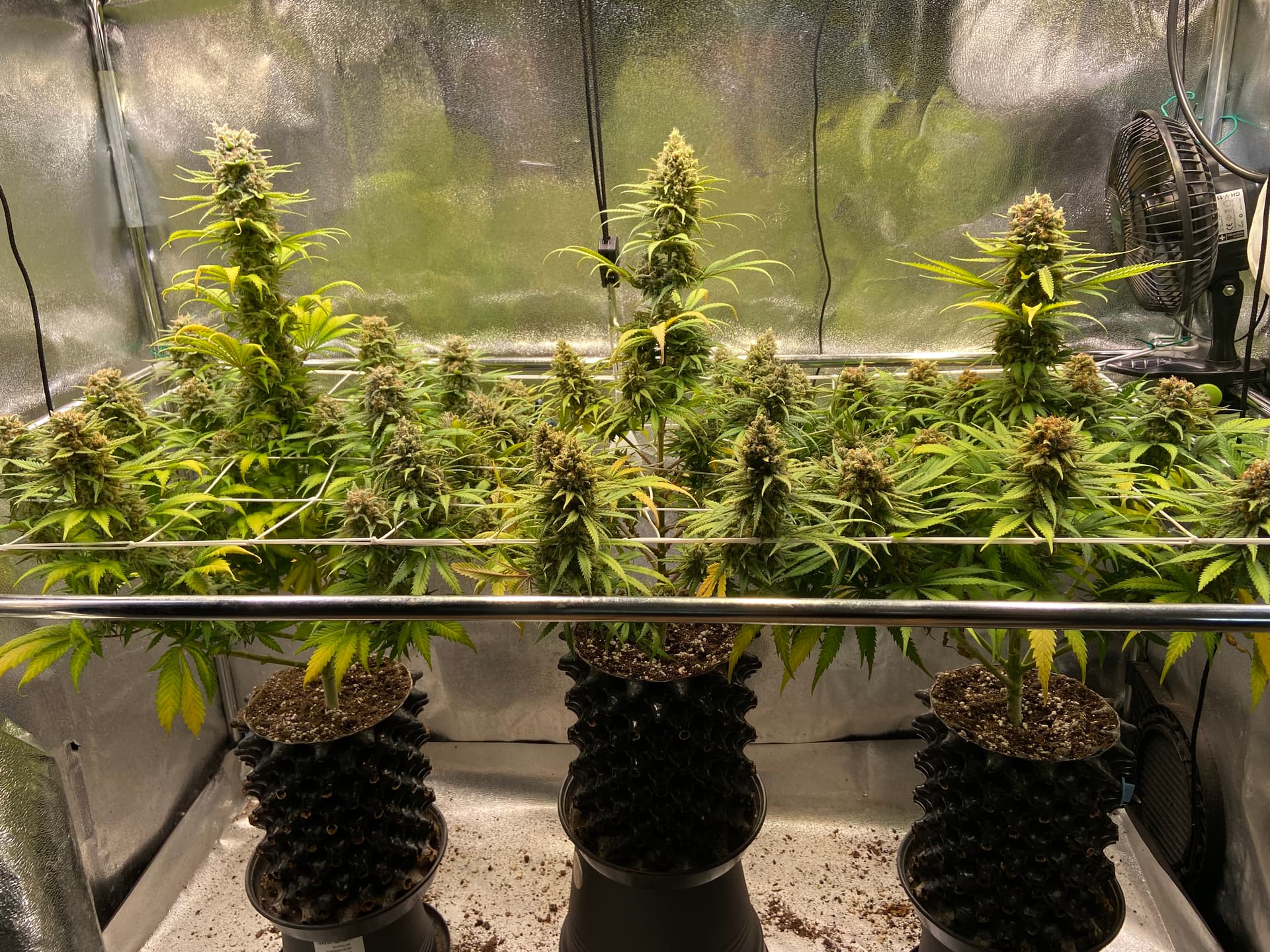 Habe dann umgepflanzt (in die jetzigen Air Töpfe) nachdem die Pflanzen sich stabilisiert hatten und das erste Paar Fünf-Finger-Blätter aufgewiesen haben.