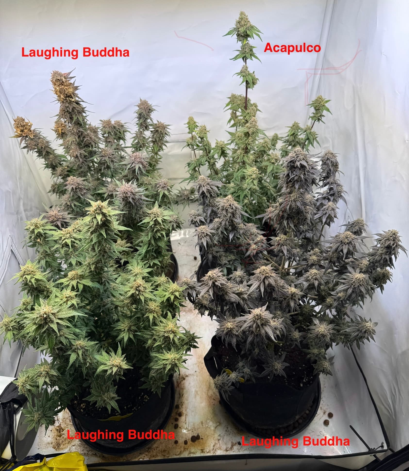 Ich bin jetzt am Ende der 9 Blütewoche und alle 3 Laughing Buddha Straine sind unterschiedlich gewachsen.