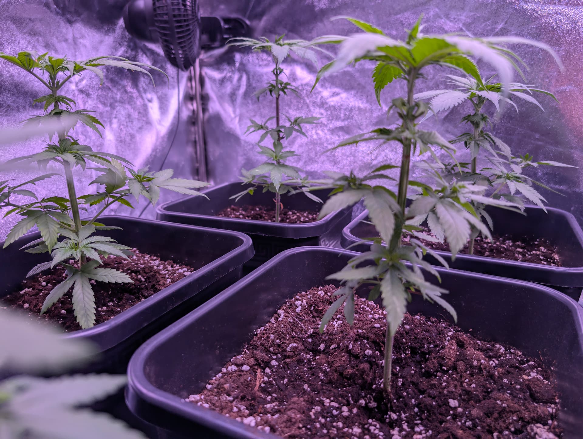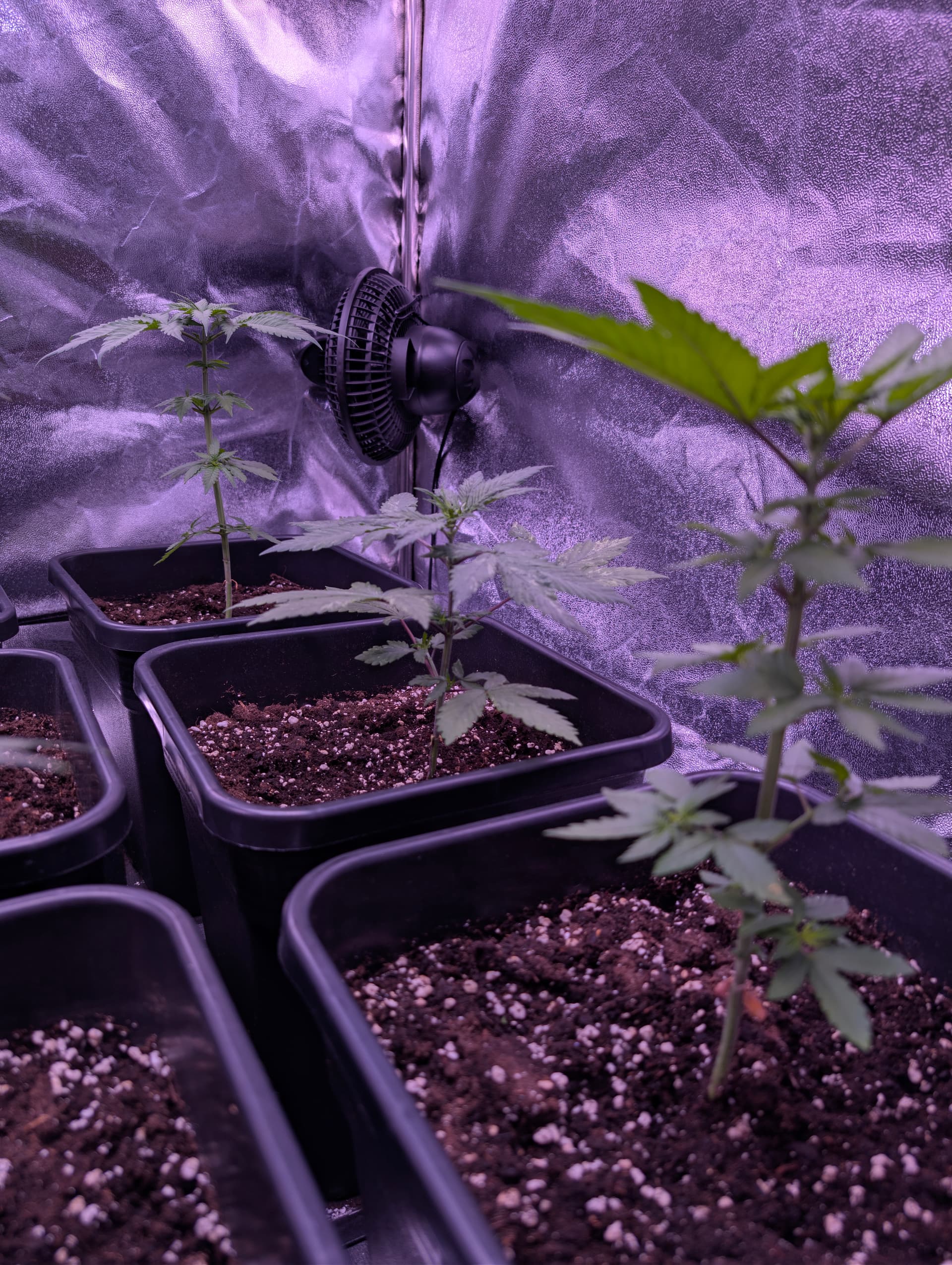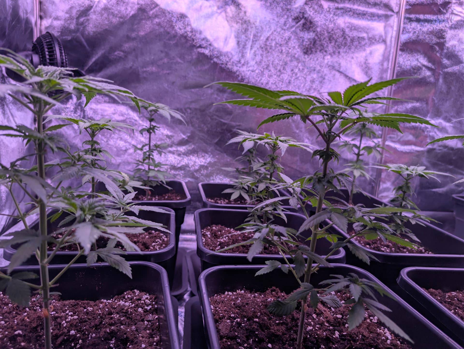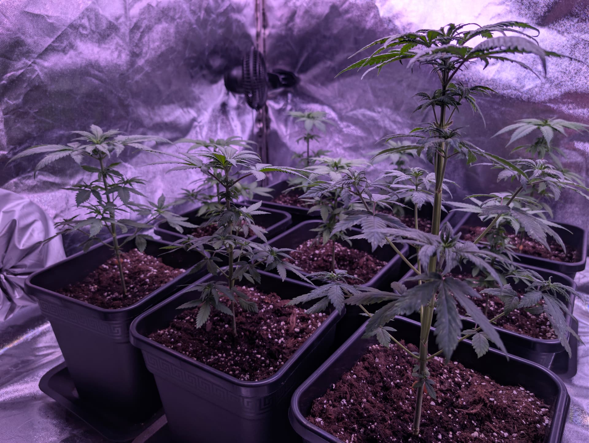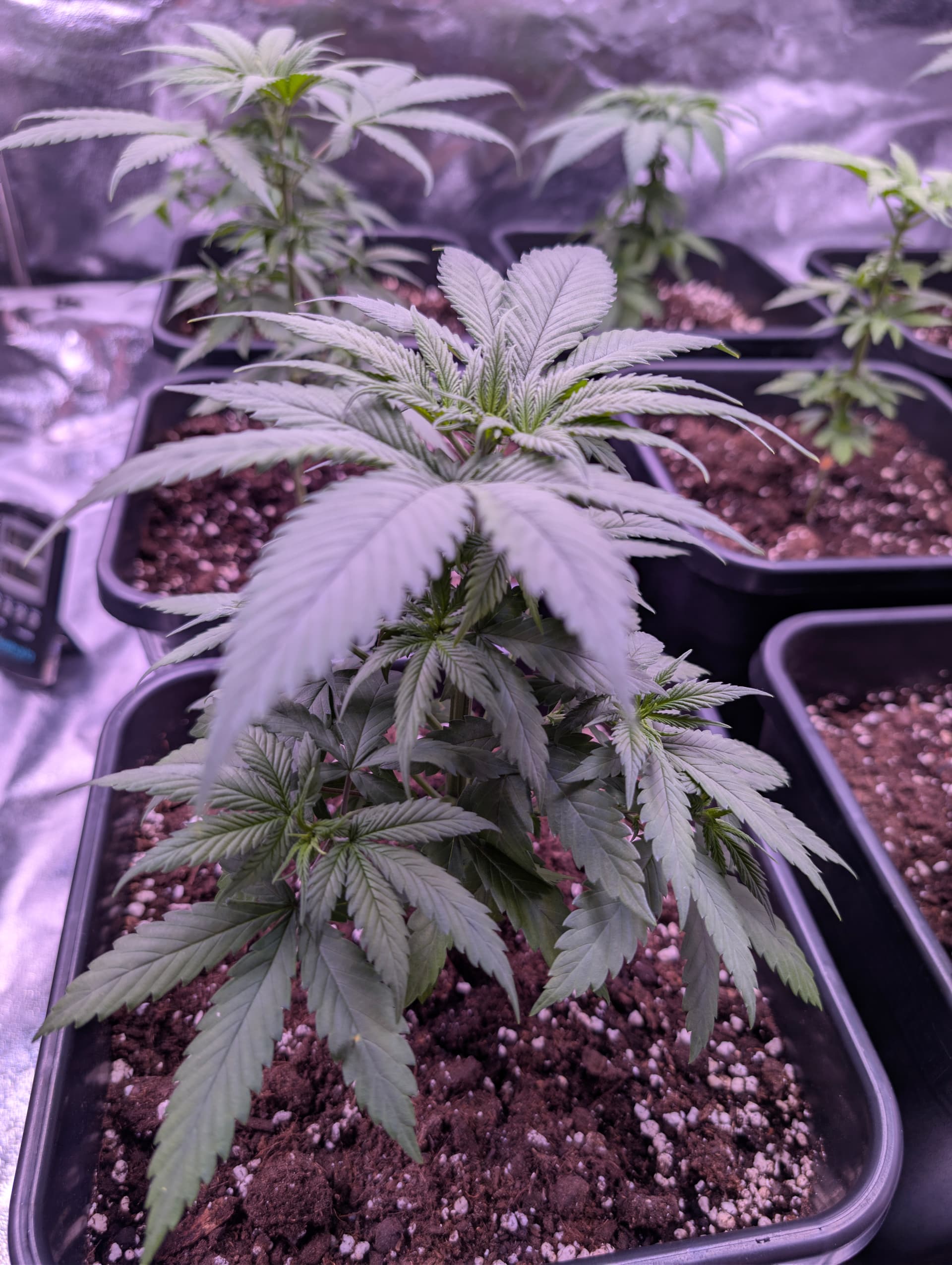 Das Licht ist auf 62% gestellt also nicht volle Leistung, erst in der Blüte Phase. Und Umtopfen ist nicht geplant es sind 11 Liter Töpfe