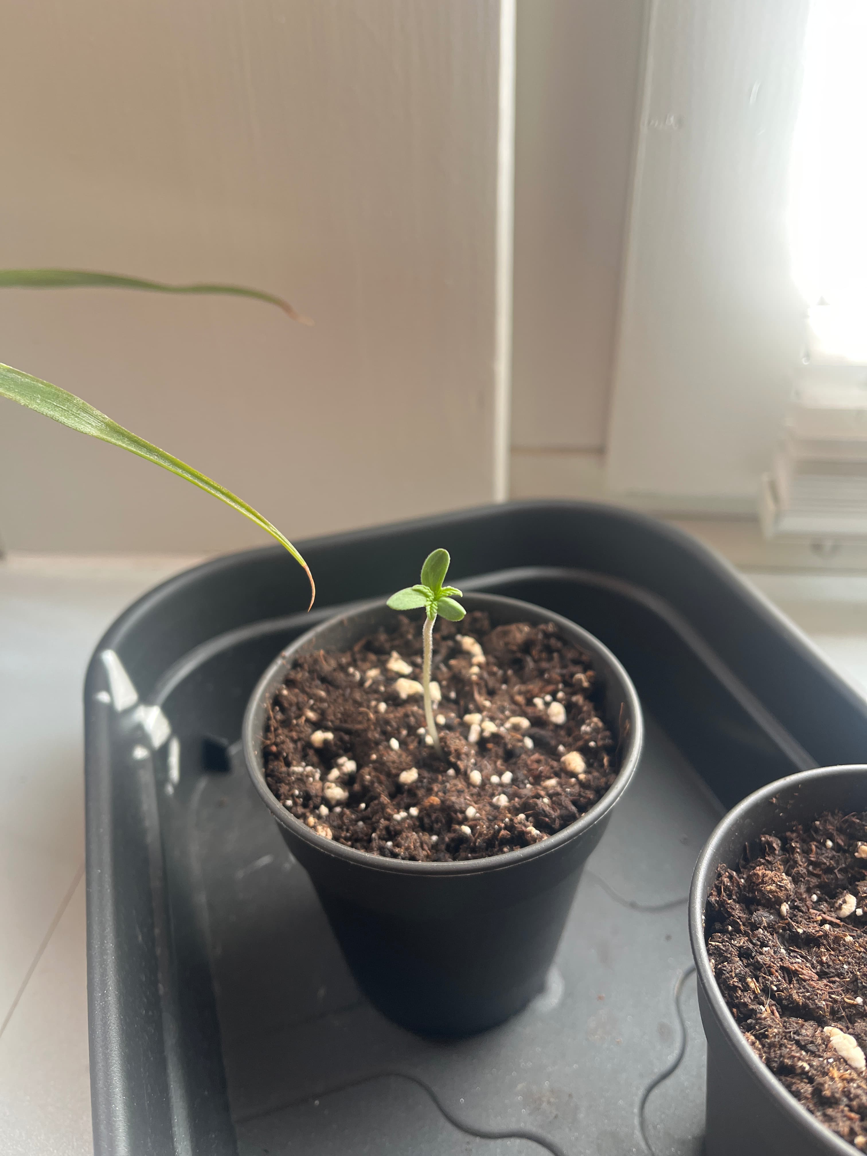 Die eine ist komisch, hat irgendwie dreifach Blätter , werde aber nur eine davon behalten da ich diesen grow nur eine Pflanze haben möchte und mir die stärkere rauspicken möchte.