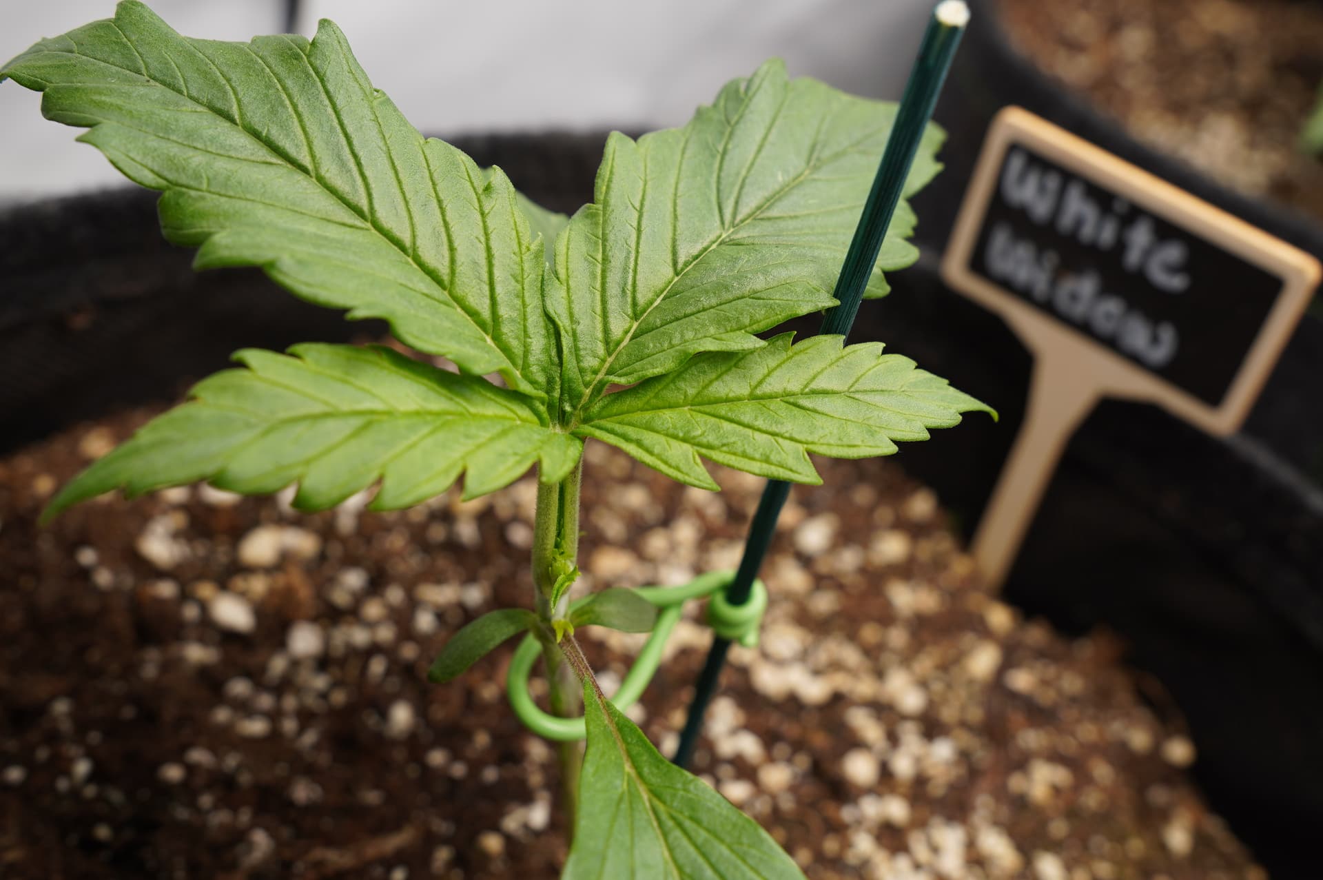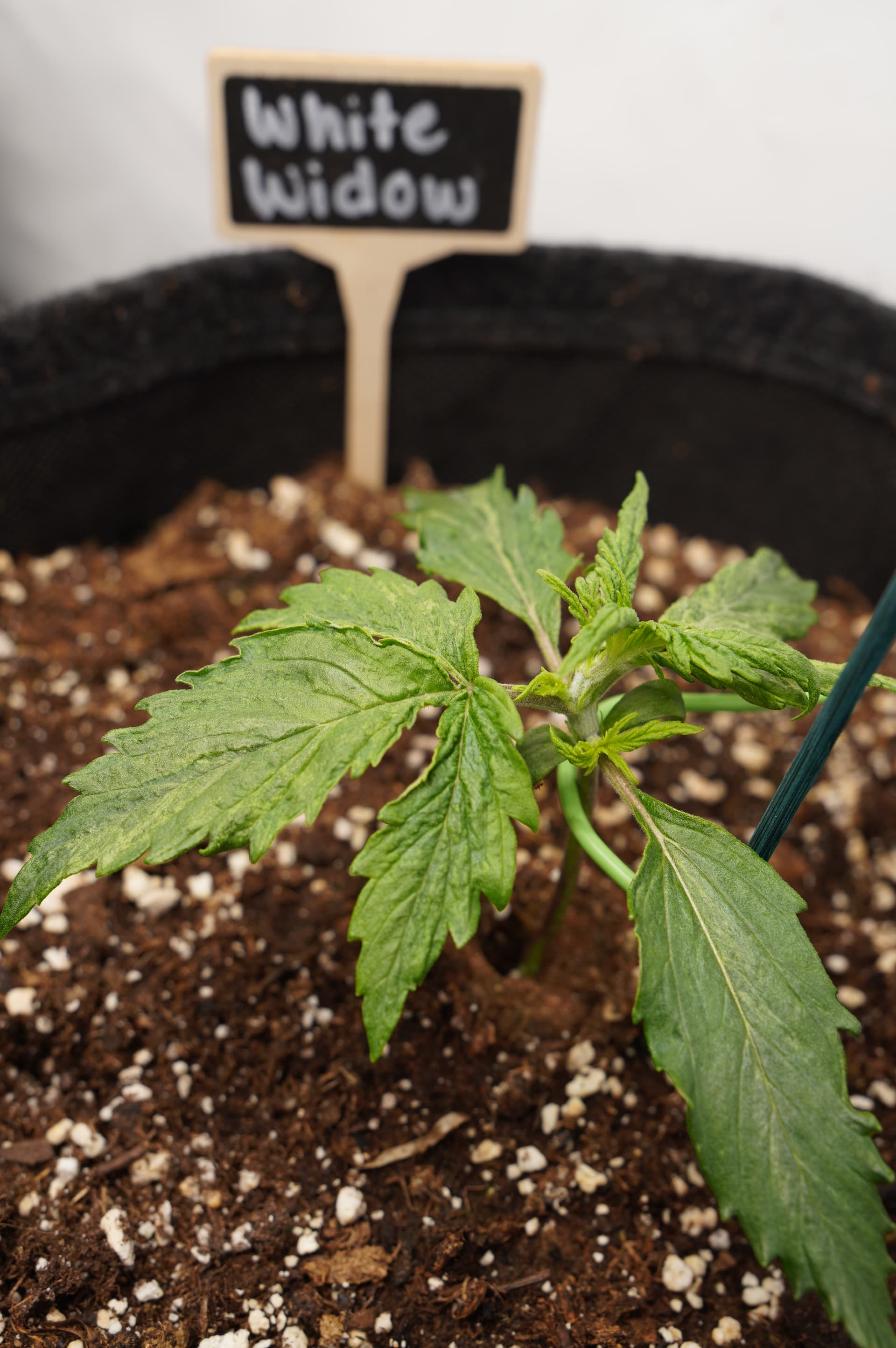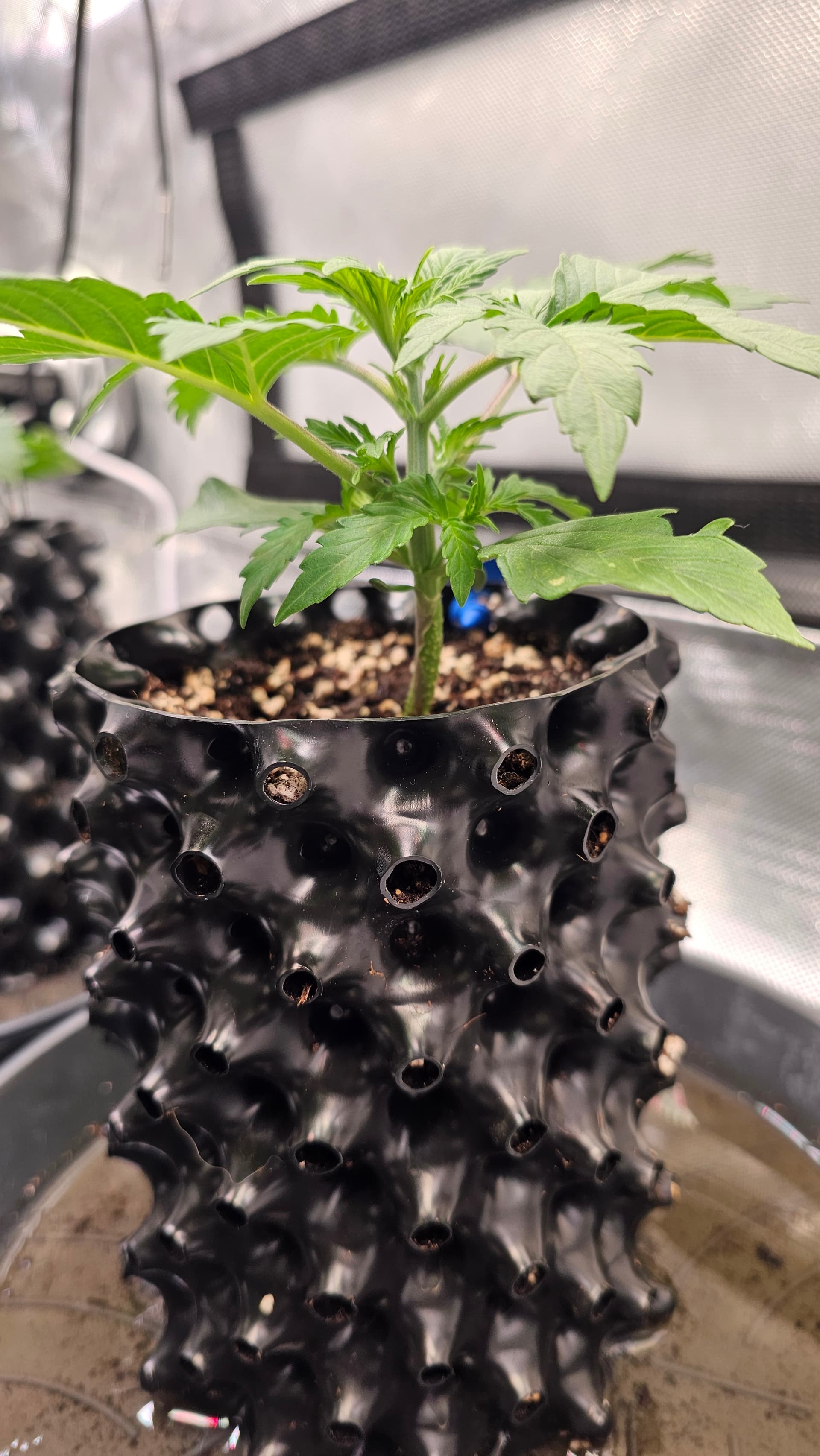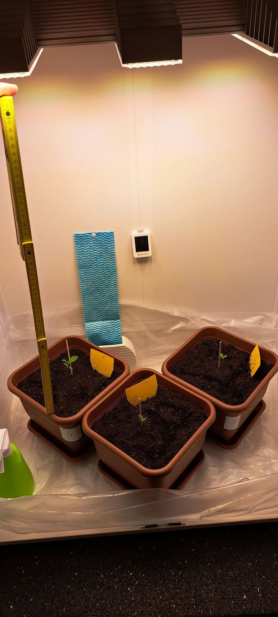 In einer 60x60x160 Growbox ziehe ich 3 Pflanzen - White Widow Auto (White Label) von SensiSeeds. Diese habe ich in Easy Plugs keimen lassen (ab 08.04.24) und danach (am 12.04.24) in 11l Stofftöpfe in angefeuchteter BioBuzz Light auf einer 2-3 cm Blähtonschicht umgetopft (den Easy Plug dabei an den Keimlingen belassen).