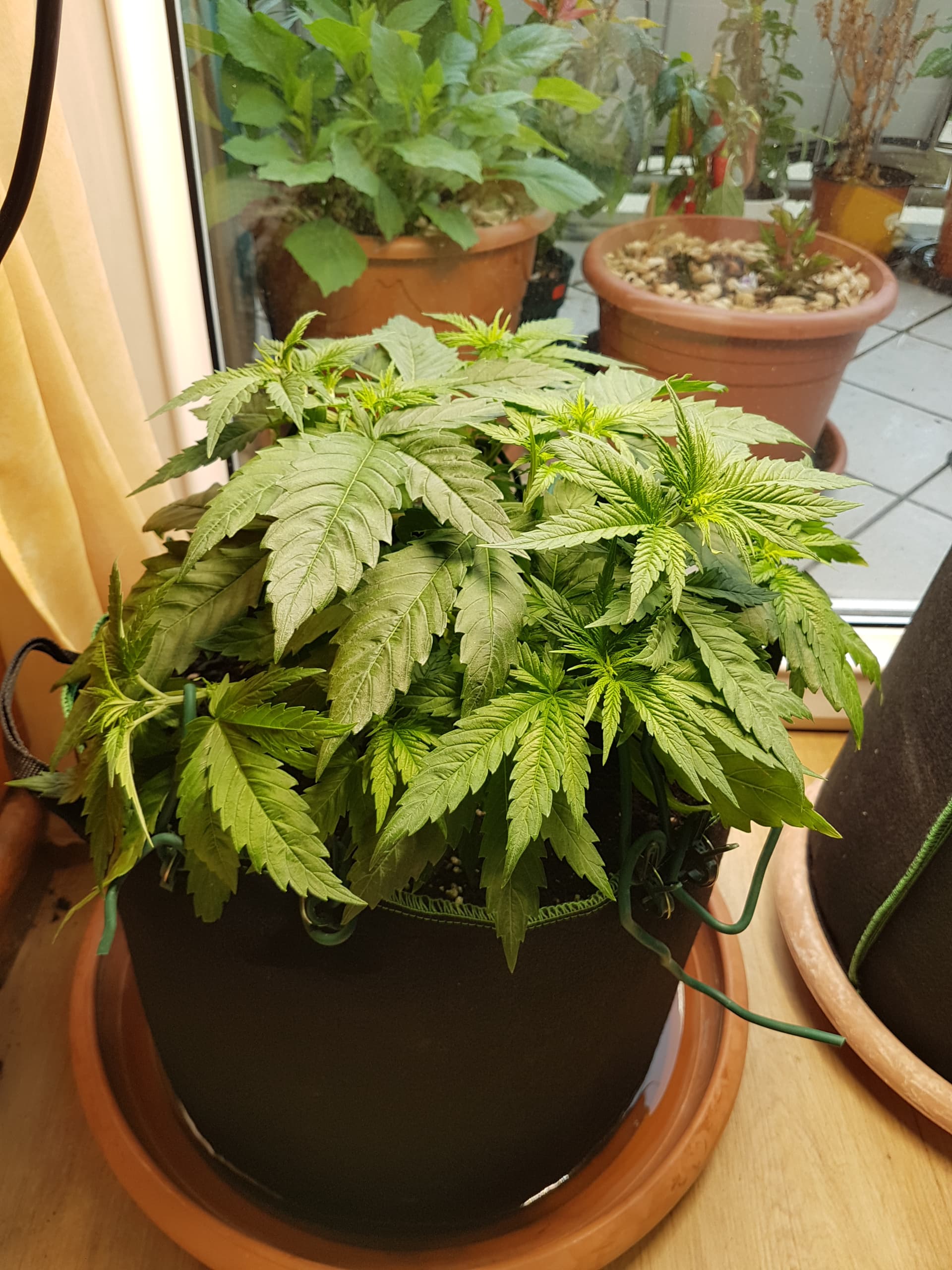 Hier ist mal meine Kleine, Sorte ist Fem. Amnesia Haze. Momentan noch durch Topping und LST klein gehalten, bis sie sich in der gewünschten Form entfalten darf.