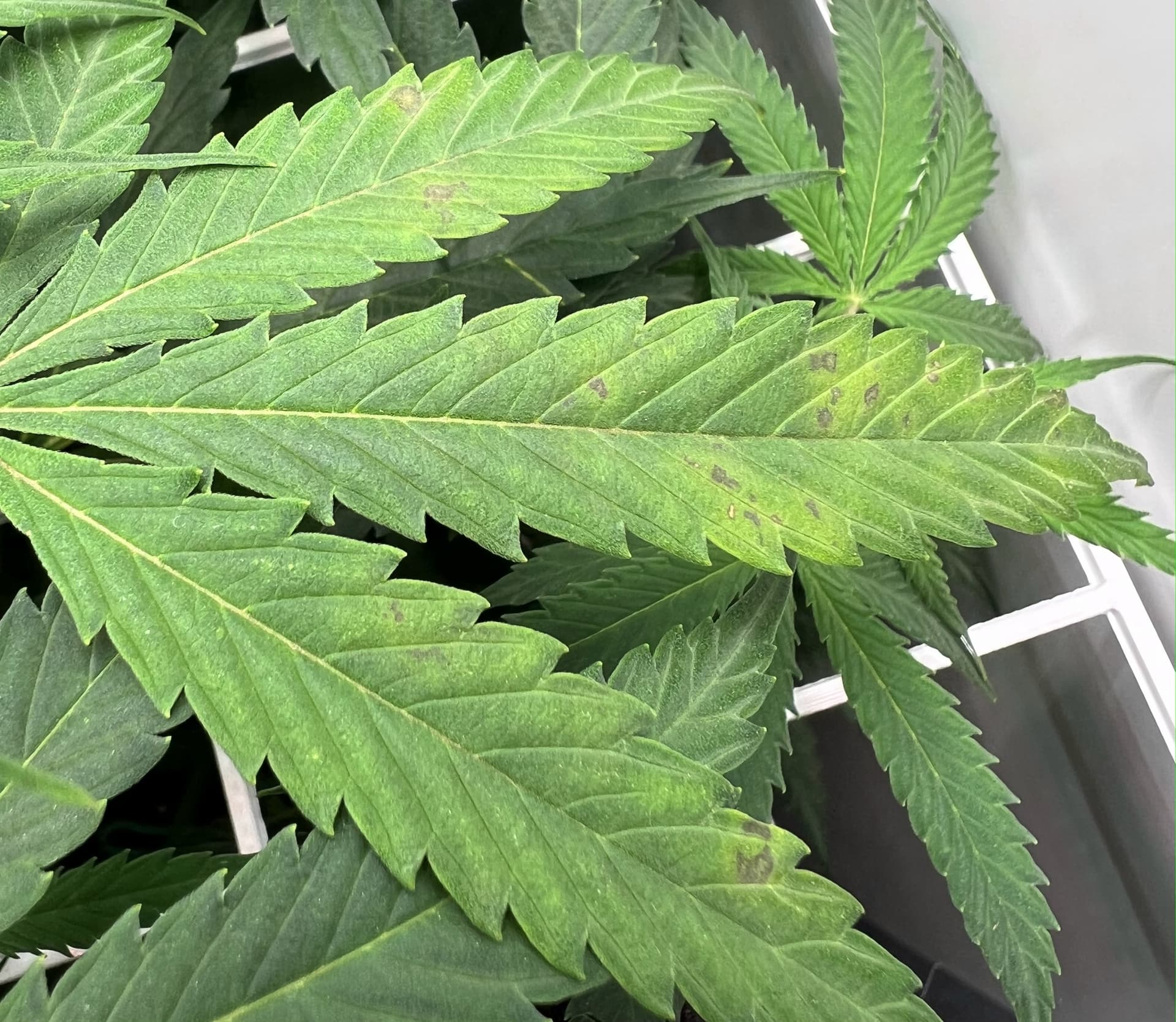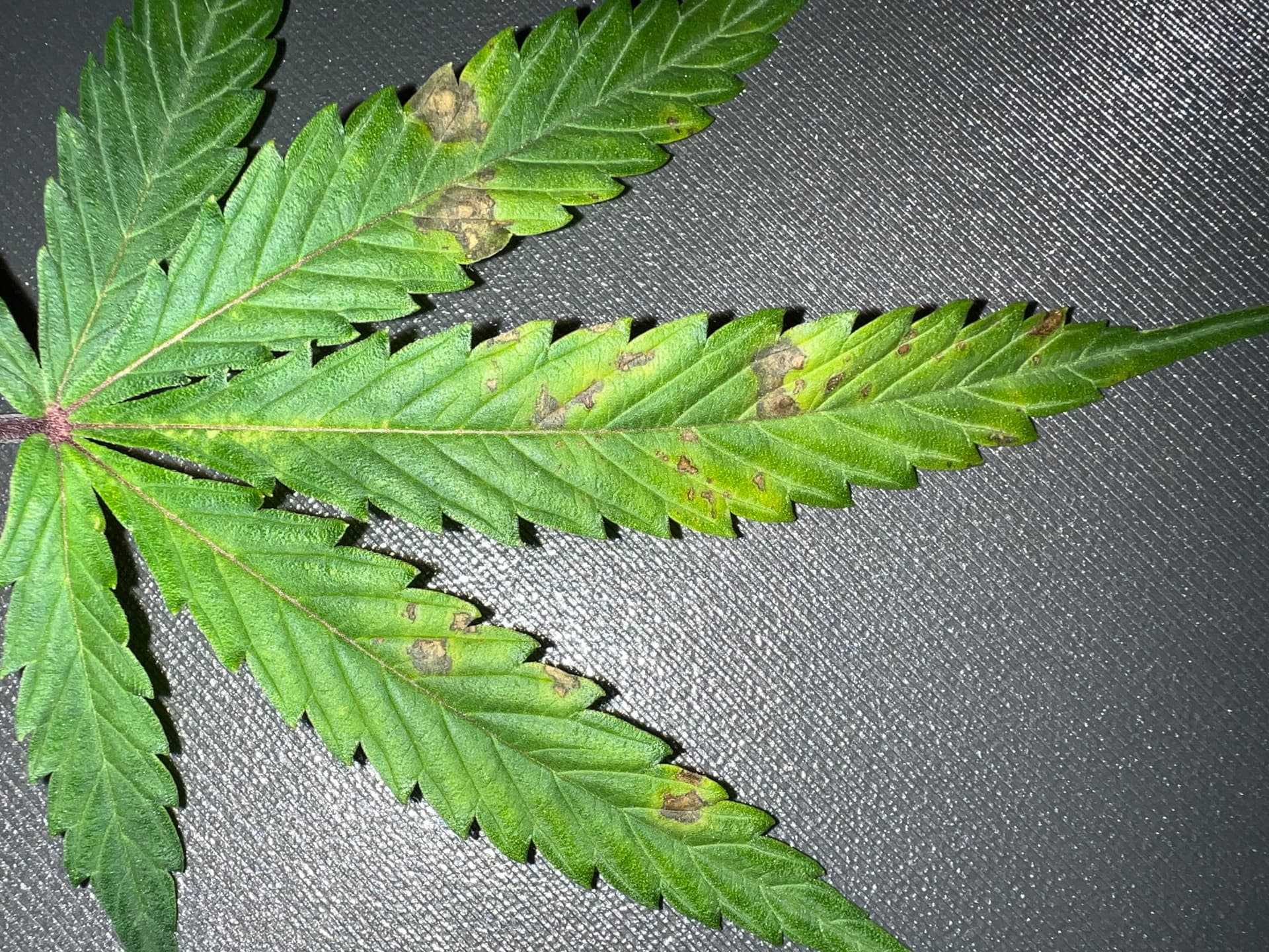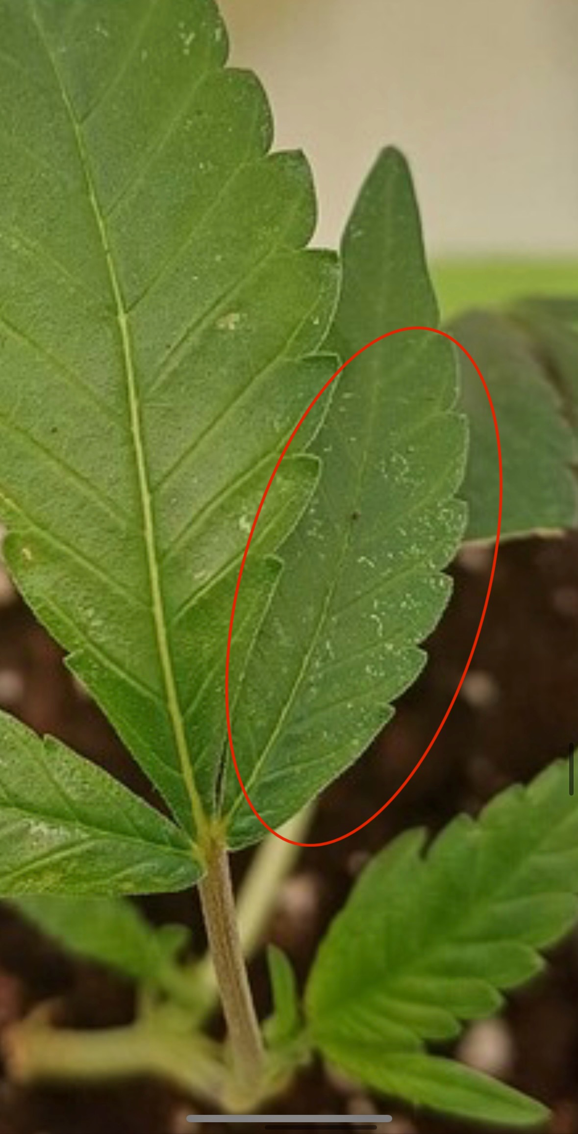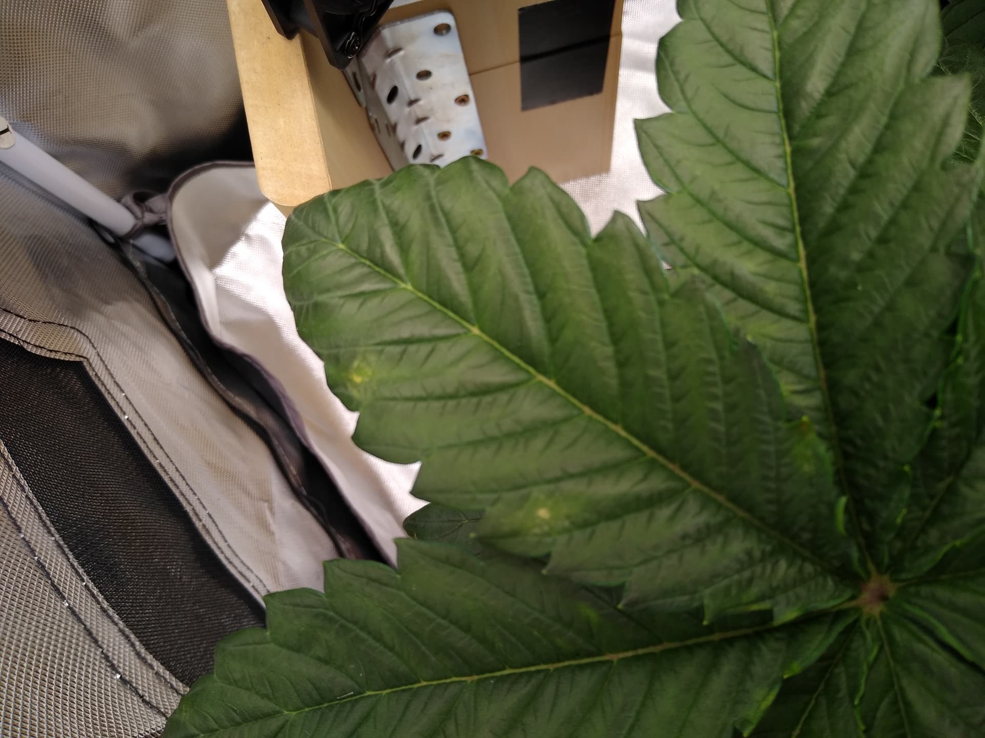 Punkte an dem untersten Blatt einer anderen Pflanze, diese steht in einer Art „Waldboden“ von Terra Professional.