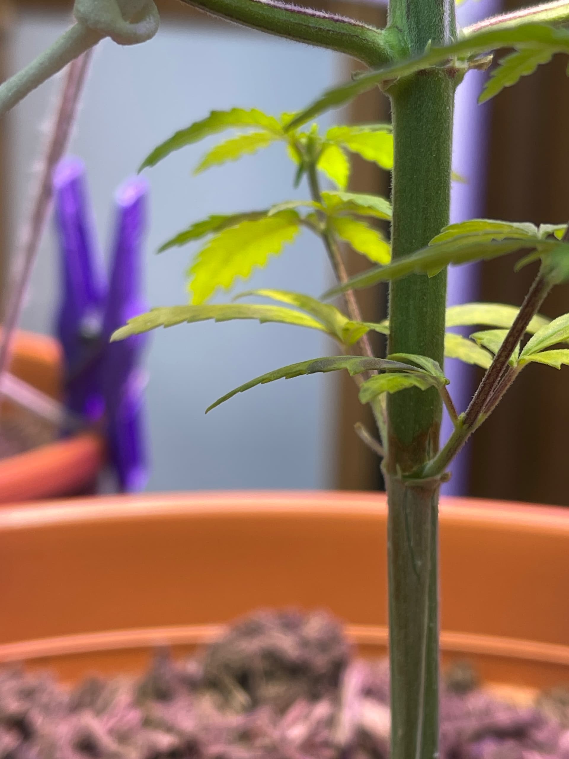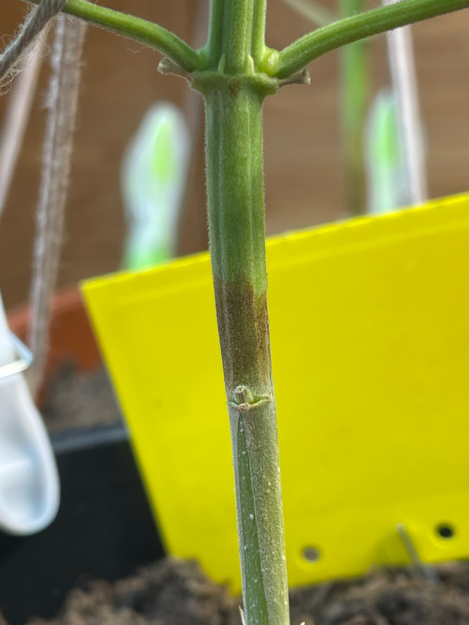 Hey das sieht für mich absolut unauffällig aus. Würde sagen der „Flaum“ am Stiel sind Trichome (die wachsen überall an der Pflanze), das nachdunkeln kommt bestimmt vom Verholzen des Stammes.