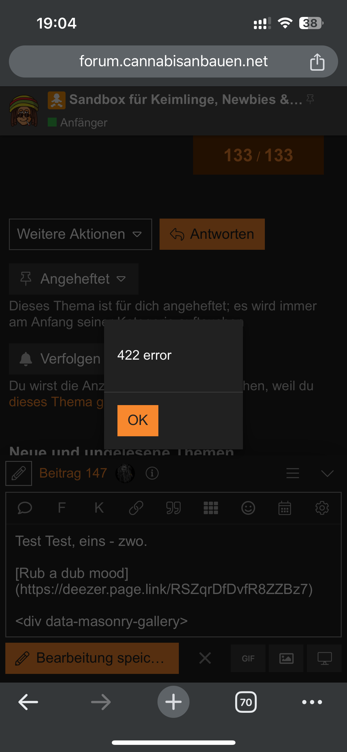 Kann mir jemand sagen, was es mit dem Fehler 422 auf sich hat? Wollte meinen vorherigen Beitrag editieren und beim speichern erscheint der genannte Fehler.