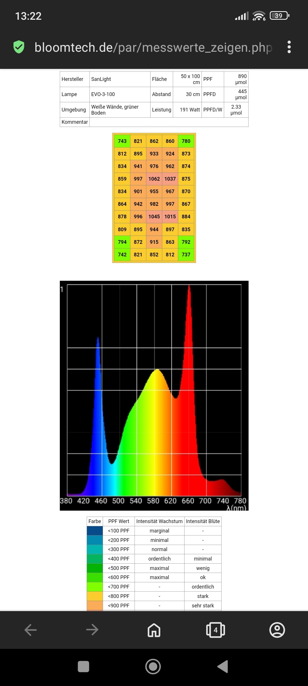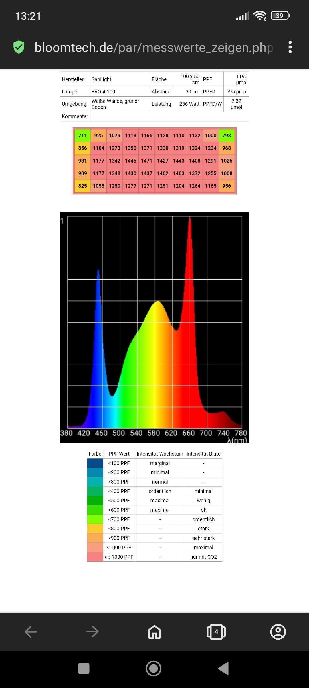 Absolute Top Performance, an den Hotspots minimal über dem Maximum was die Pflanzen vertragen ohne CO², in den Ecken wo am wenigtsten ist über 700 ppfd und damit im Optimum.