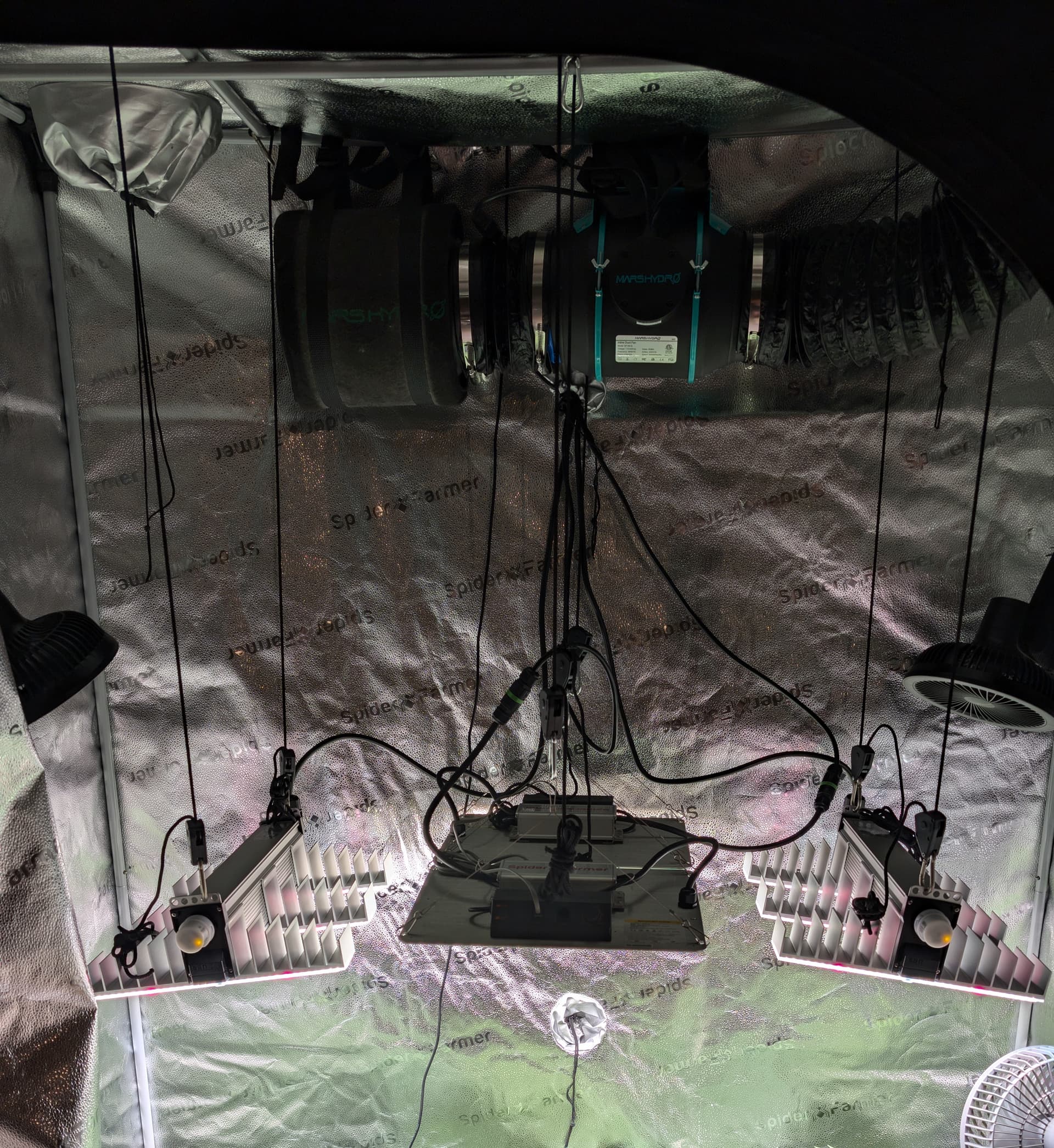 Also momentan habe ich 2x Sanlight EVO 3-60 mit 11° Tilt ganz außen hängen und mittig 2x Spiderfarmer SF1000EVO. Dieses Setup fahr ich mit max 80% Leistung.