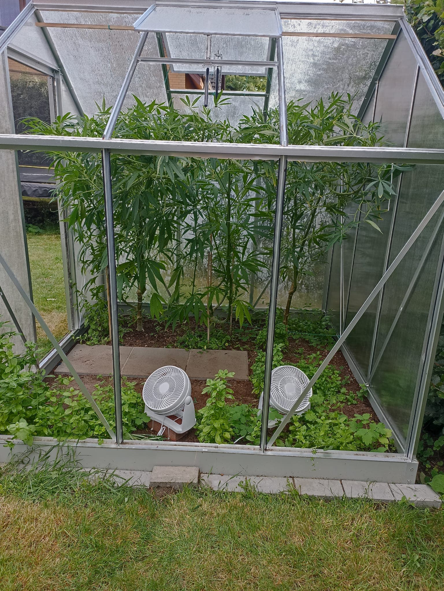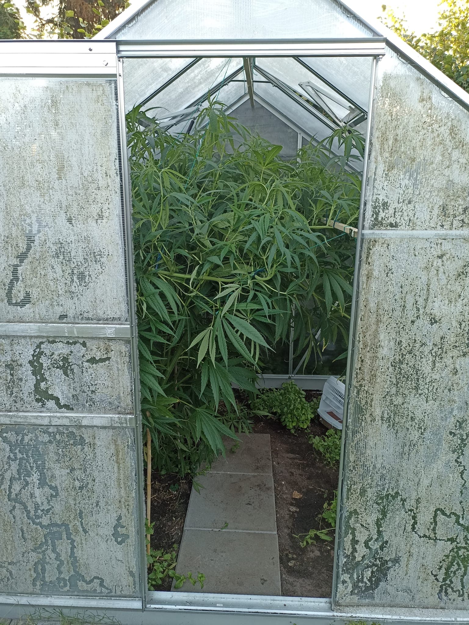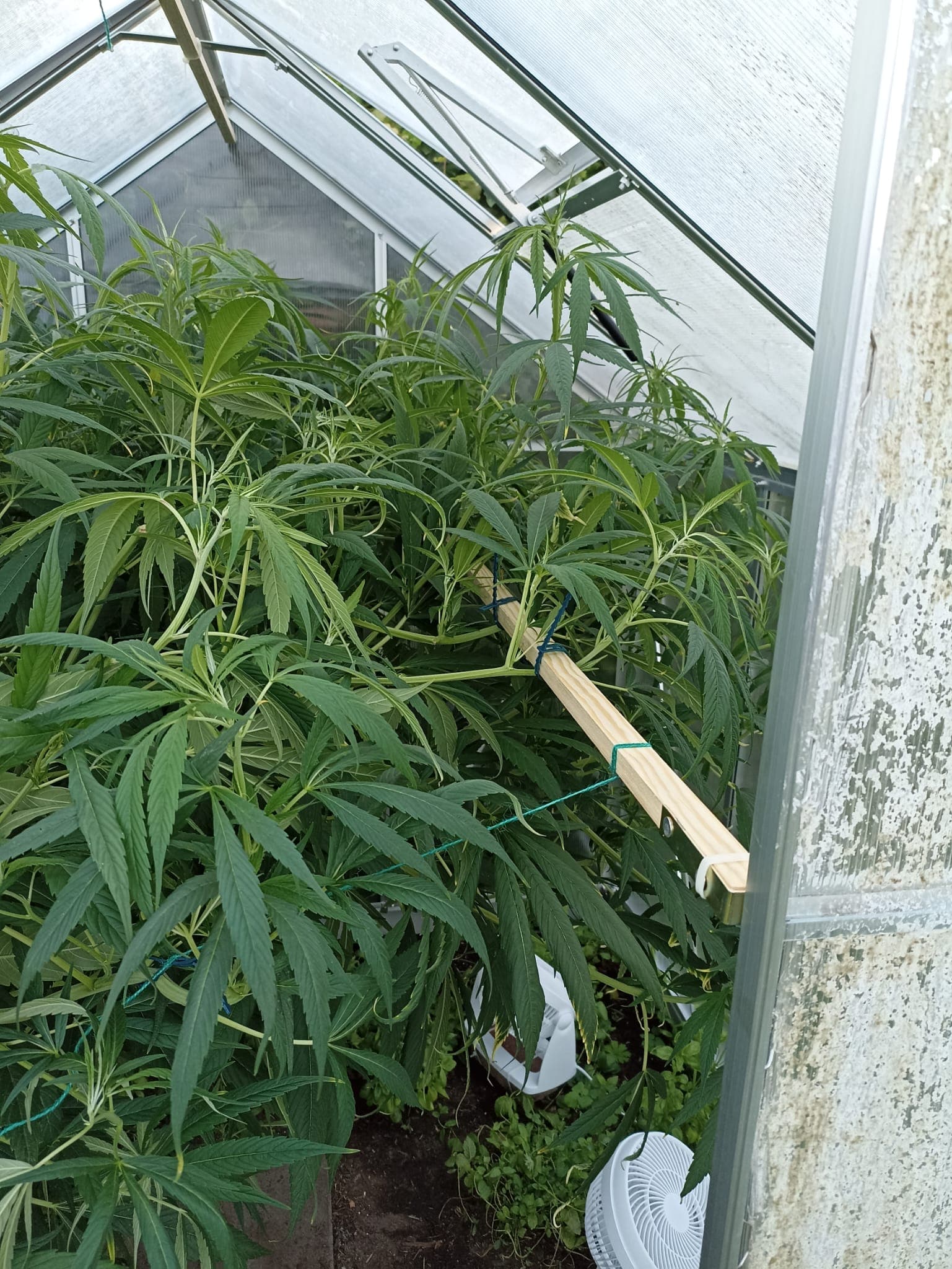 Das mit dem Wind und Wetter ist nun das geile am Gewächshaus. Wir hatten hier dies Jahr auch schon ein paar Gewitter, die bei den Pflanzen großen Schaden hinterlassen hätten. Das Hochbeet mit Salat etc. war ordentlich verwüstet. Bei den 3 werde ich bestimmt noch ein paar Kürzungen oder so durchführen, damit alles irgendwie luftig und ab einem gewissen Zeitpunkt genug Platz für die Ventilatoren bleibt. Und da mein bisheriger Konsum bisher ca. 20 gr pro Jahr betrug, muss die Ernte eigentlich auch nicht so fett ausfallen (was ich nicht verdampfen kann, kommt dann in Schnaps