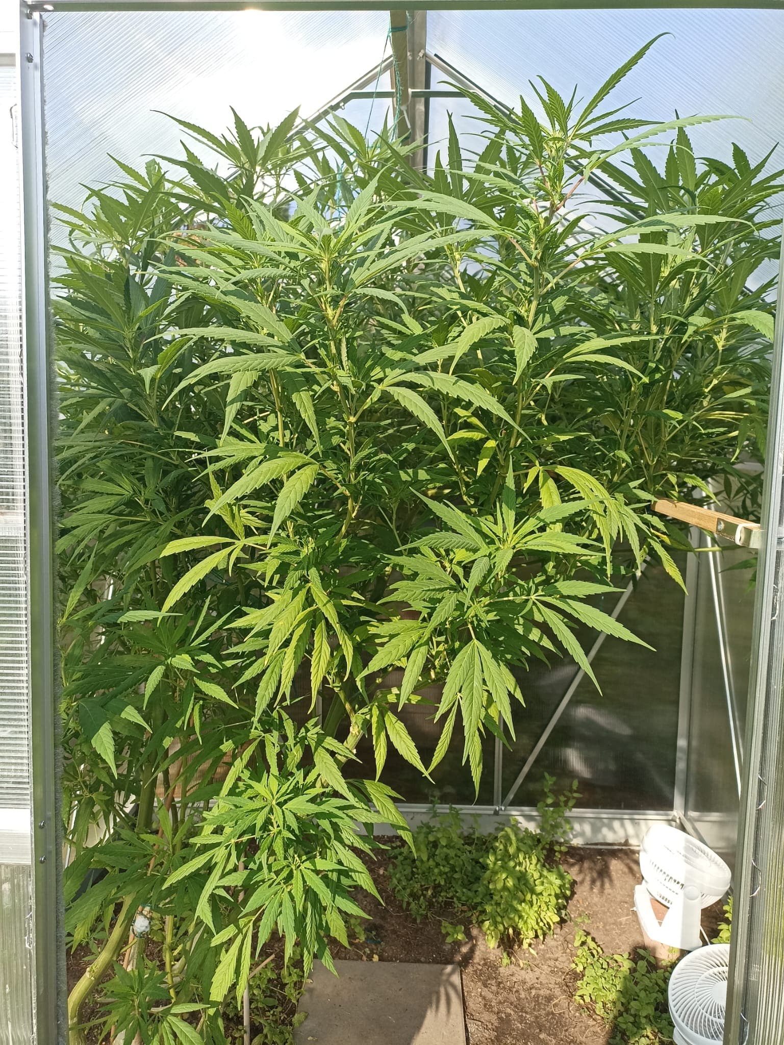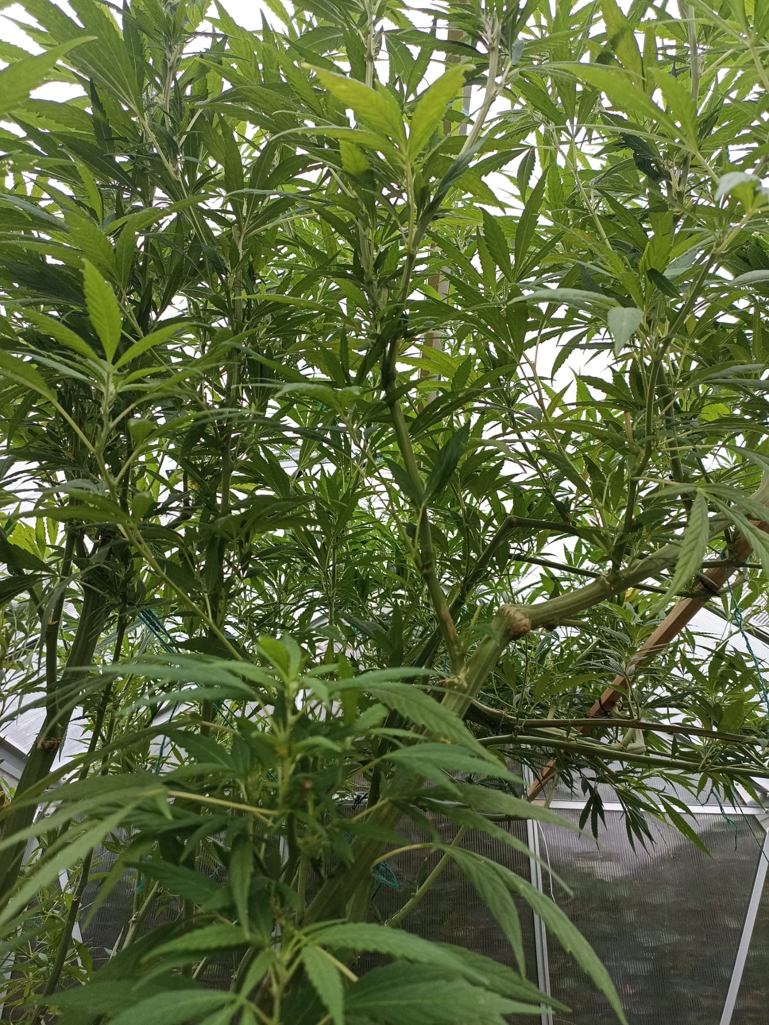 Entlaubung ist durchgeführt und der durch das Fällen der 3. Pflanze freigewordene Platz durch umfangreiches Umbinden ausgenutzt. Um überall ranzukommen, musste ich 3/4 der Stegplatten abnehmen und mich trotzdem verrenken (Oberschenkelmuskelkater steht an). Das wird wohl auch für die irgendwann erforderlichen Budrotkontrollen nötig sein.