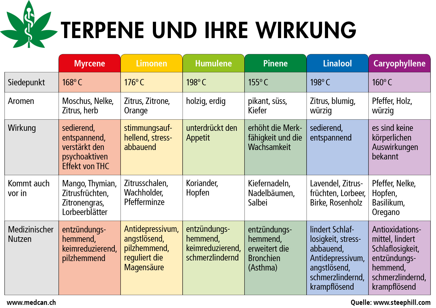 Quelle: Russo, E. B. (2011). Taming THC: potential cannabis synergy and phytocannabinoid-terpenoid entourage effects. British Journal of Pharmacology, 163(7), 1344–1364.