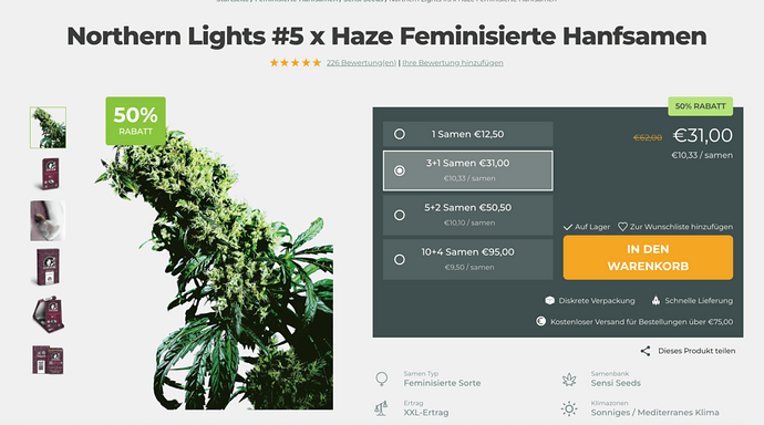 Unsere Sparecke: Hier finden Sie eine ständig wechselnde Auswahl an vergünstigten Hanfsamen, CBD-Produkten und mehr. Jeder Artikel repräsentiert unser Engagement für Qualität und Erschwinglichkeit. Bestellen Sie jetzt und entdecken Sie Ihren nächsten Favoriten zu einem Bruchteil des normalen Preises. Hier beginnt Ihre Reise zu außergewöhnlichen Einsparungen. Ist Ihr Lieblingsprodukt gerade nicht im Angebot? Schauen Sie bald wieder vorbei.