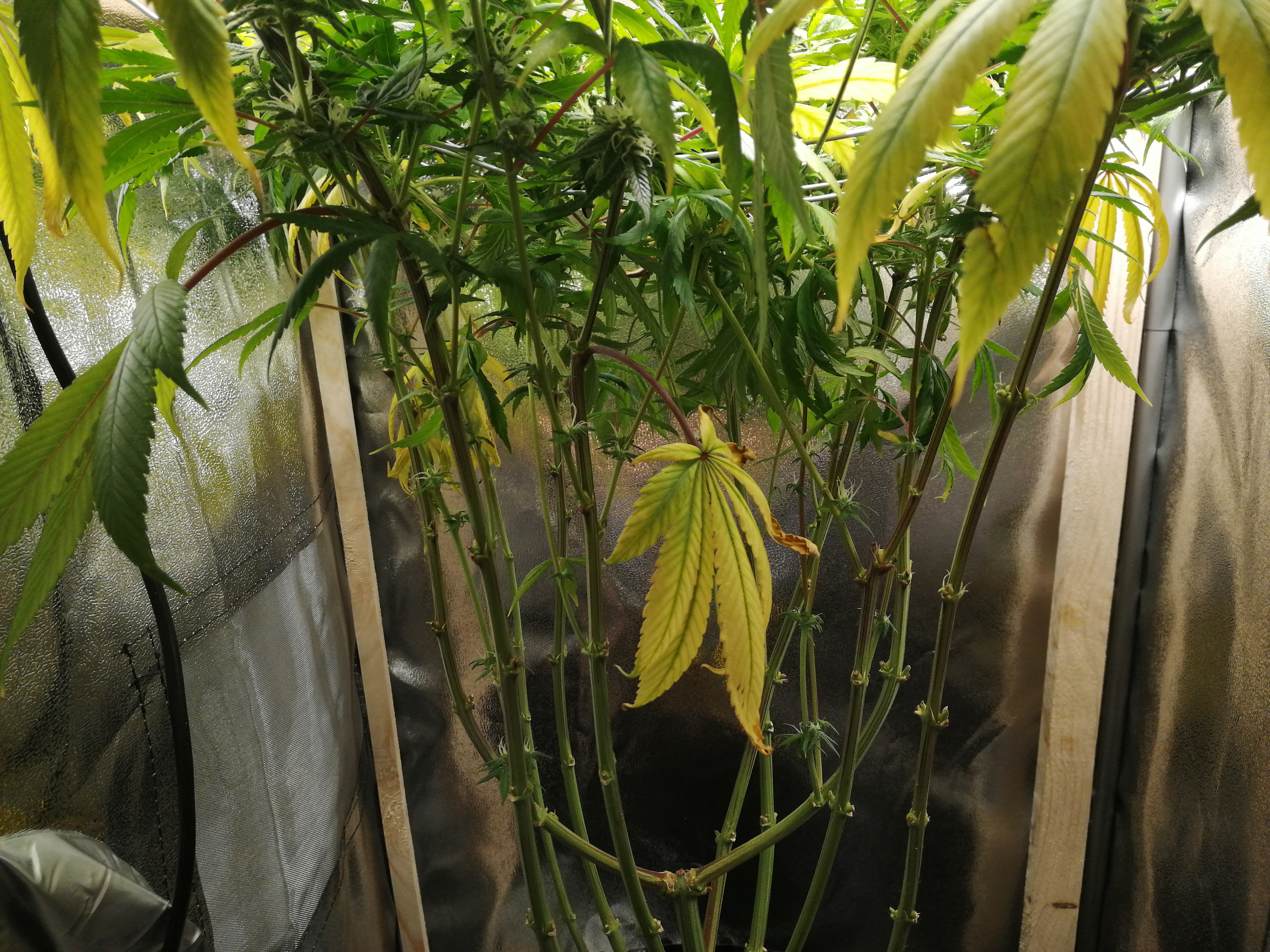 Stickstoffmangel gelbe Blätter die auch Eisenmangel zeigen durch zu tiefen PH-Wert wie man an den roten Stängel sehen kann.