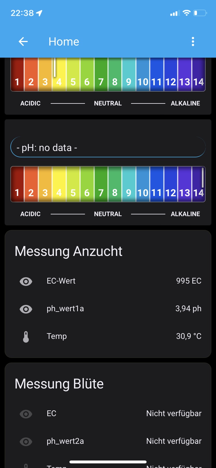 Dieser steuert jetzt die Box voll automatisch. Anhand der programmierten Automatisierungen wird mein ph-Wert konstant im Testbetrieb auf 6,5 gehalten. Fällt der Wert, schaltet sich automatisch die ph-Wert Pumpe aus dem Fass mit 8,0 ein. Die läuft solange bis der Wert wieder stabil ist. Im anderen Fall, geht die 2 Pumpe an.