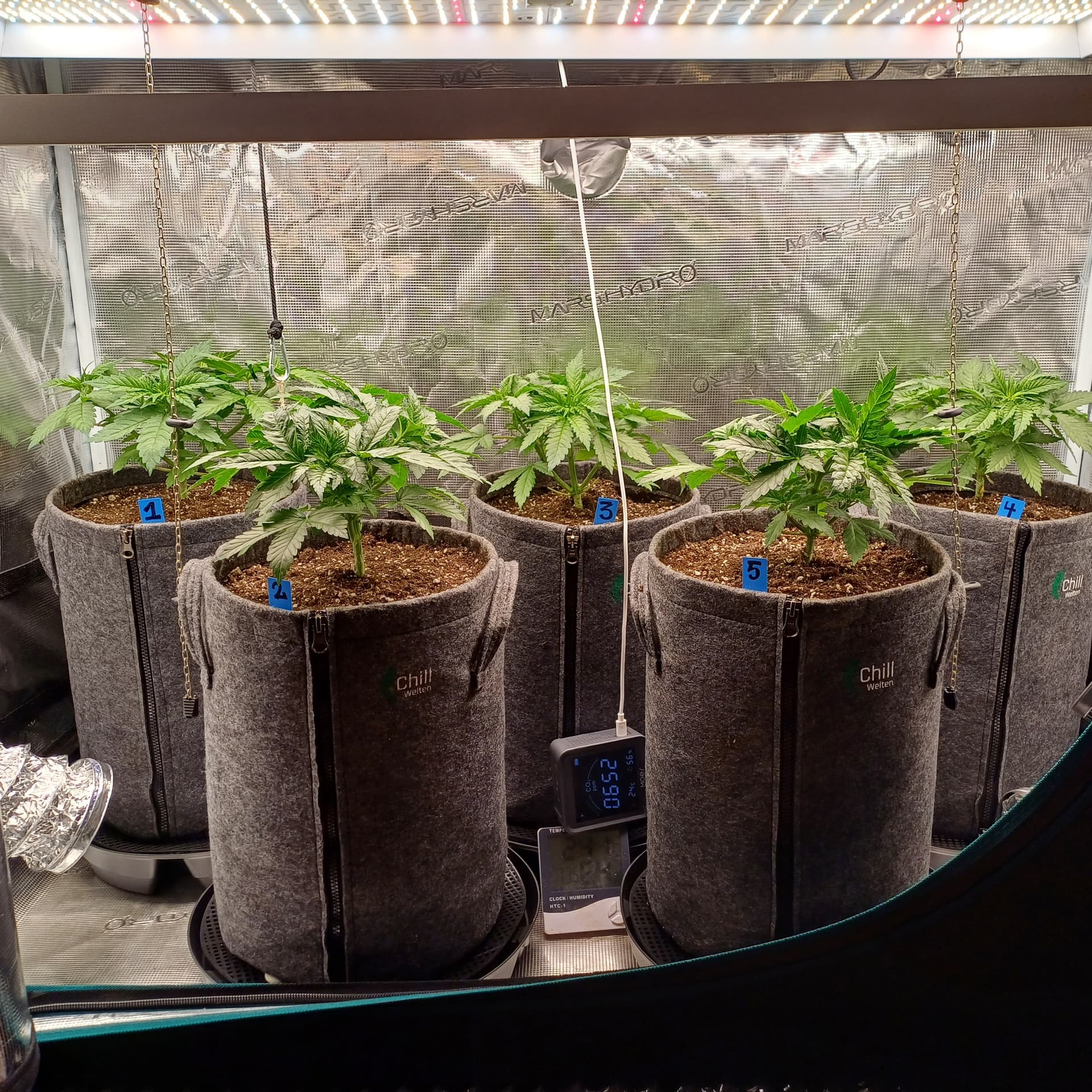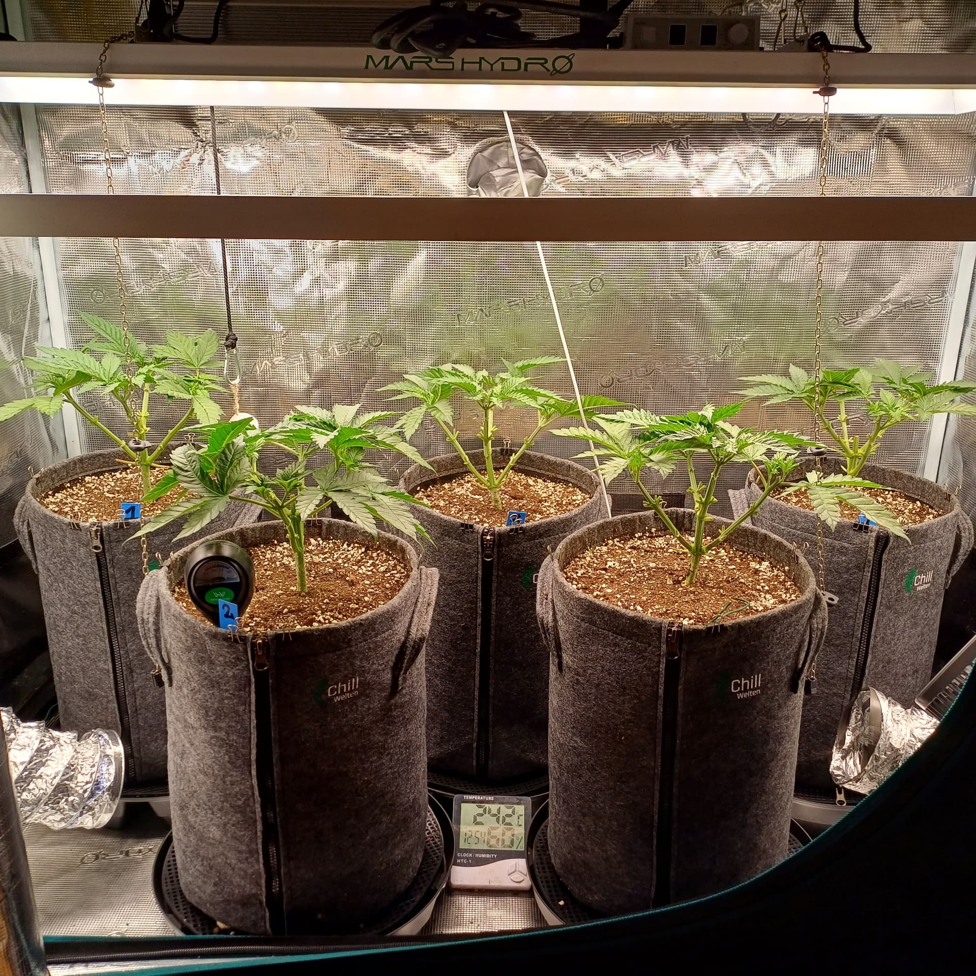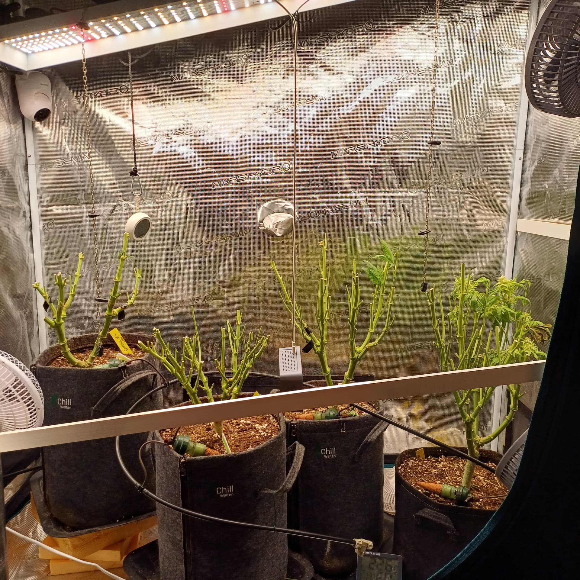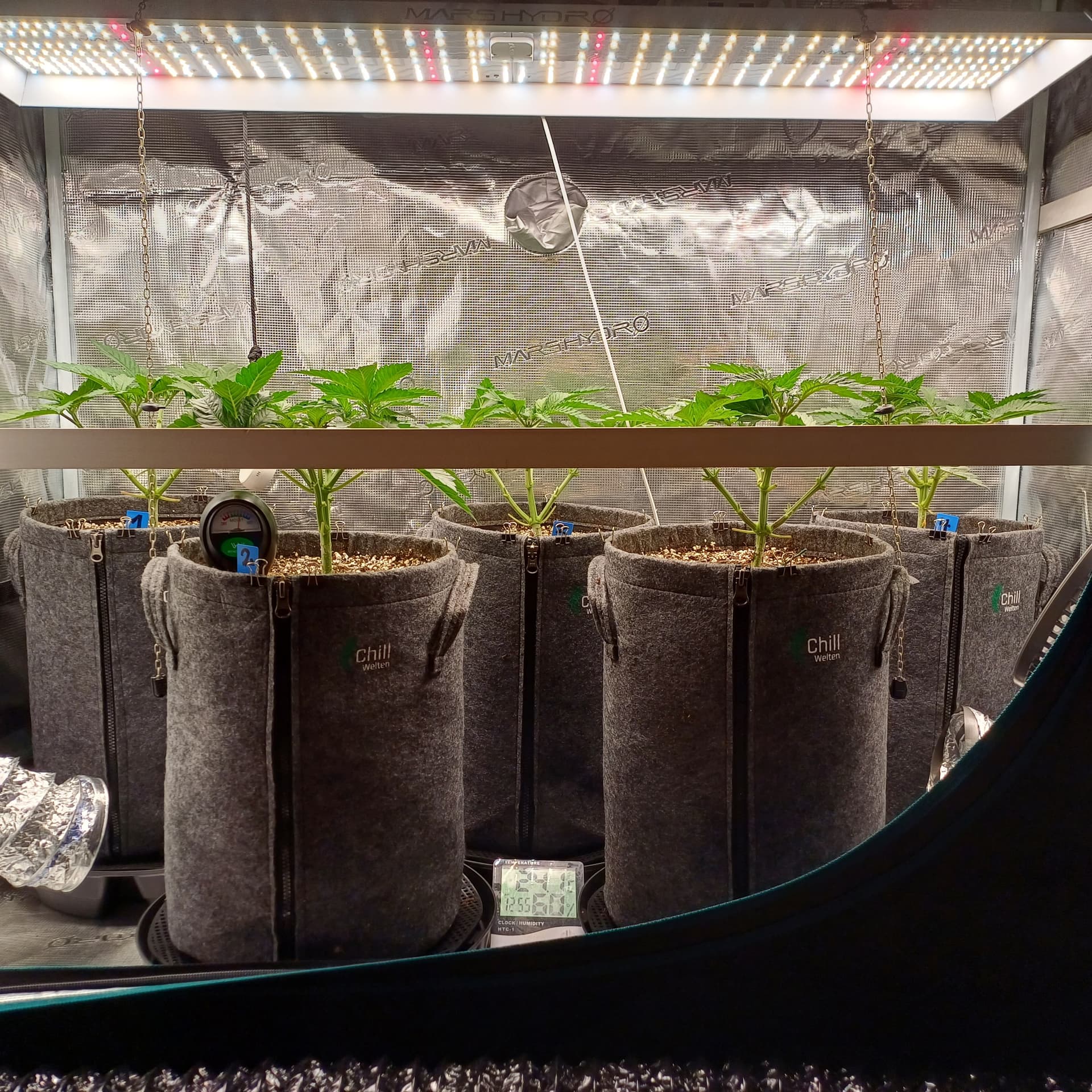 An Temp/Luftfeuchtigkeit(=VPD) und DLI wurde nichts geĂ€ndert. Die Silberhazis dĂŒrfen jetzt ein paar Tage chillen, Wurzelmasse aufbauen und sich erholen. Ab morgen wird dann wieder sanft trainiert um alle Triebspitzen auf einer Höhe zu halten.