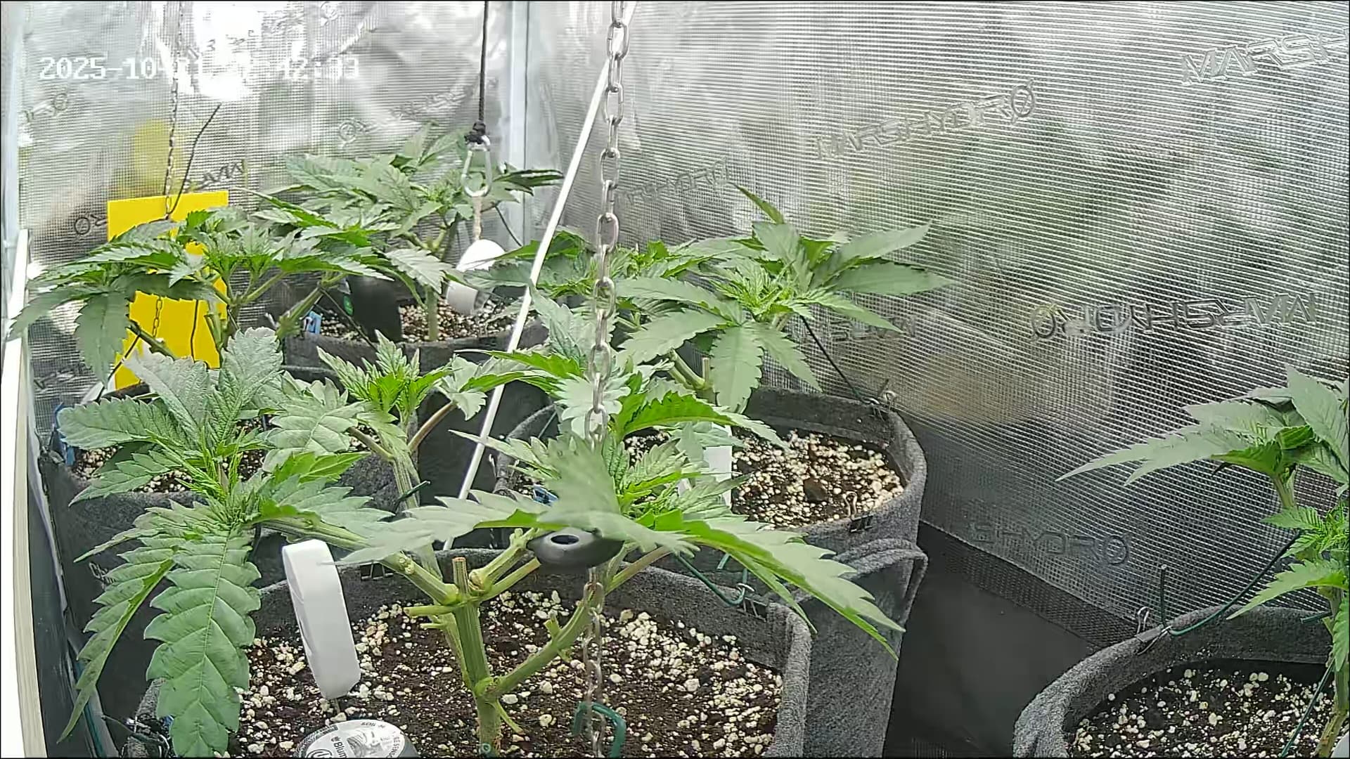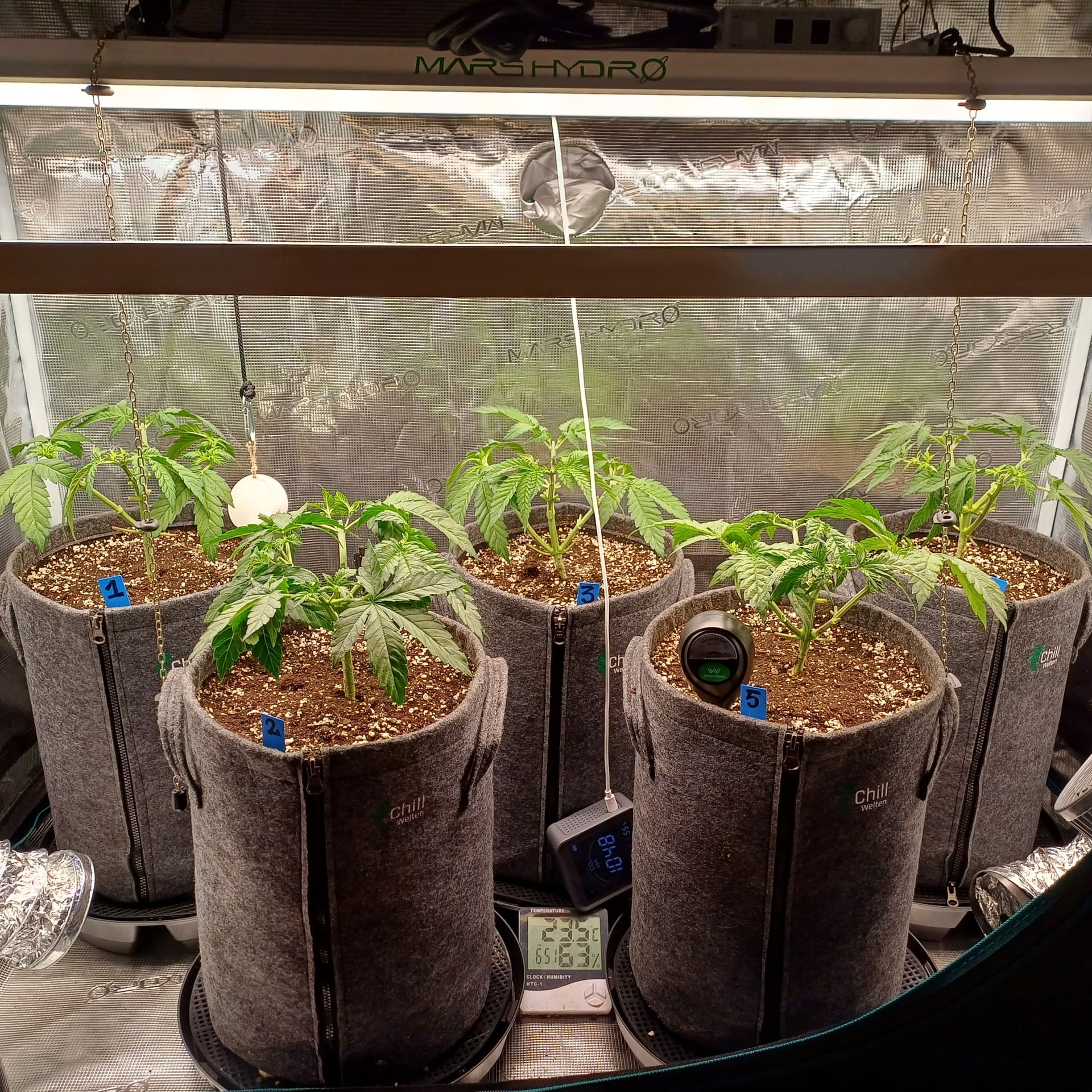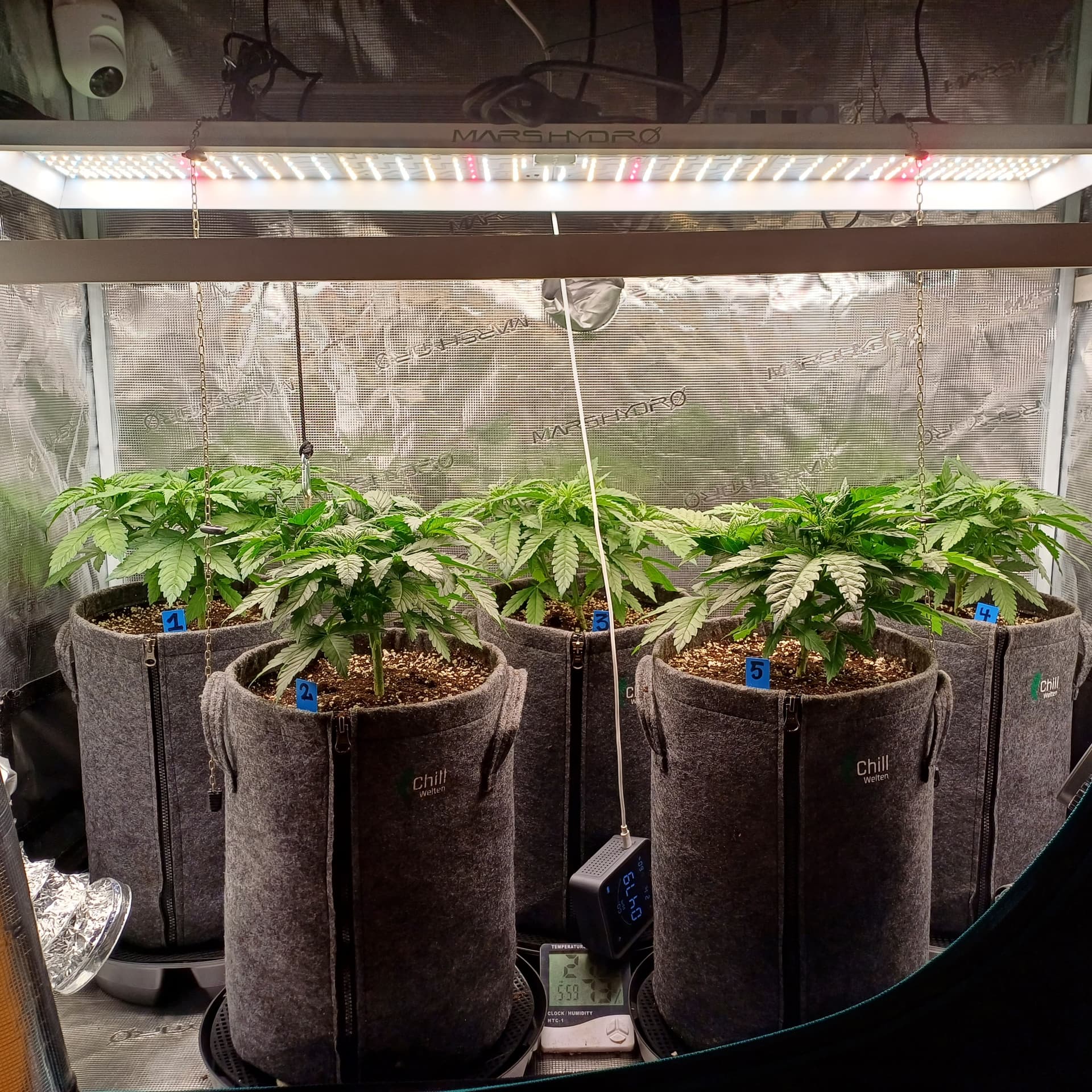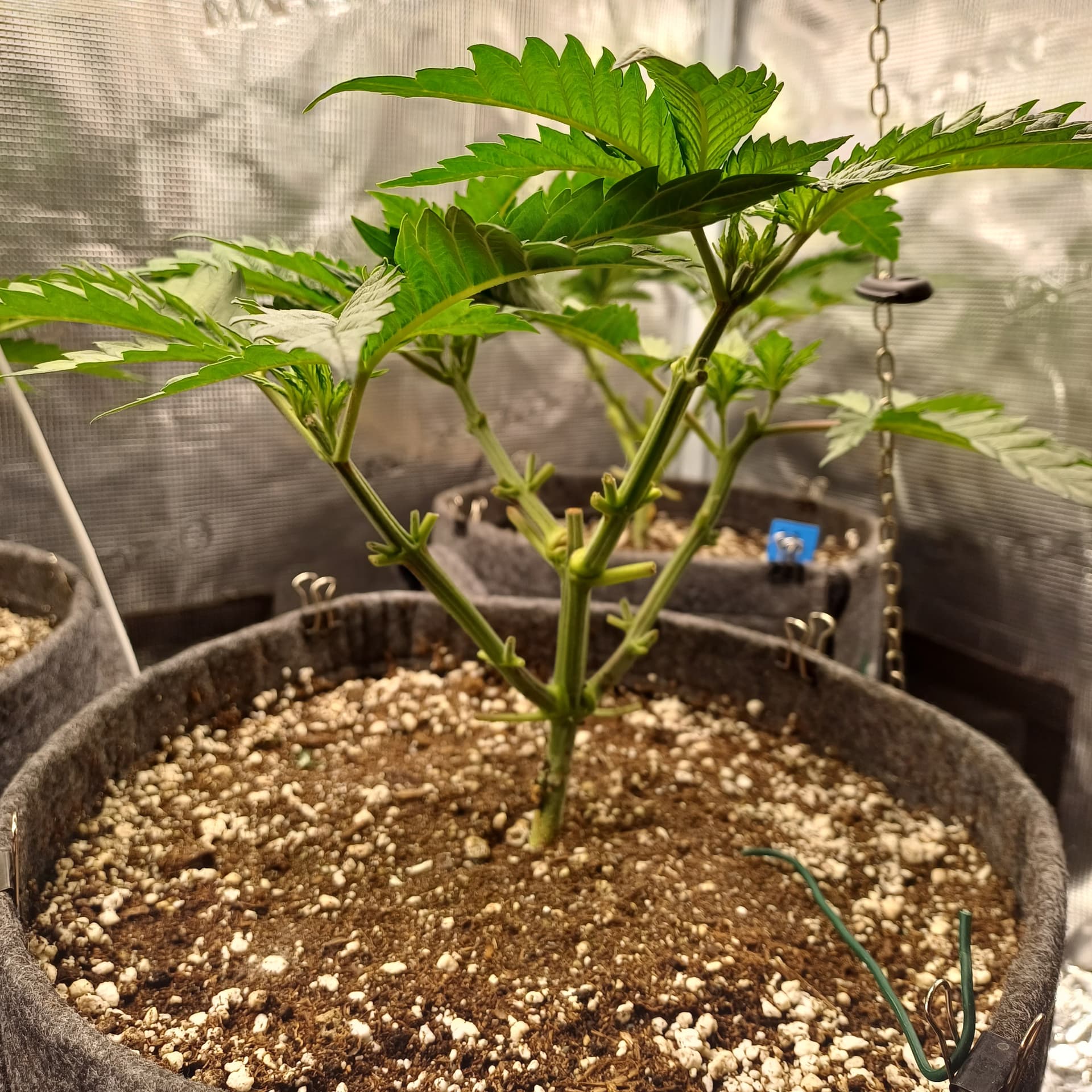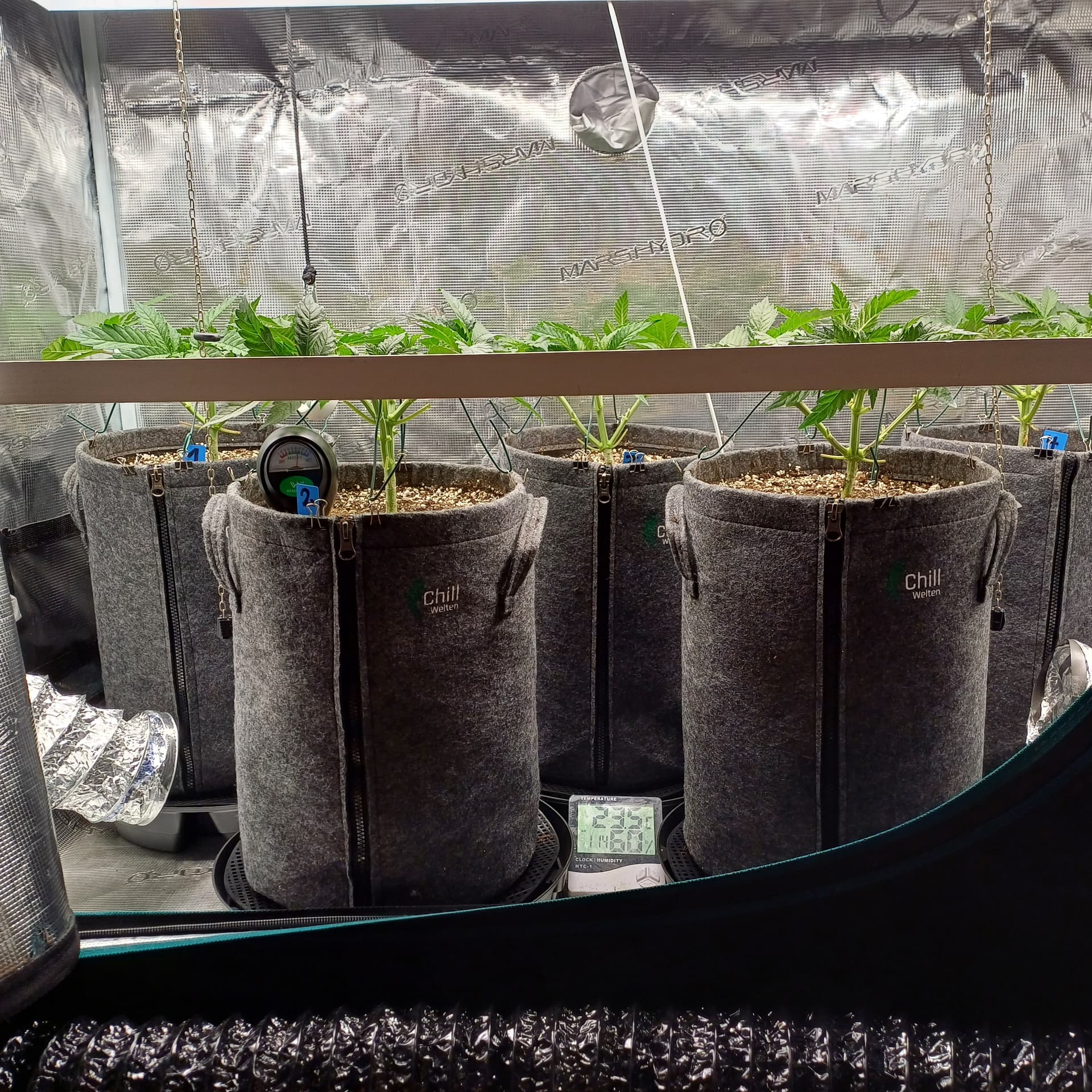 An Temp/Luftfeuchtigkeit(=VPD) und DLI wurde nichts geĂ€ndert. Die Silberhazis dĂŒrfen jetzt ein paar Tage chillen, Wurzelmasse aufbauen und sich erholen. Ab morgen wird dann wieder sanft trainiert um alle Triebspitzen auf einer Höhe zu halten.