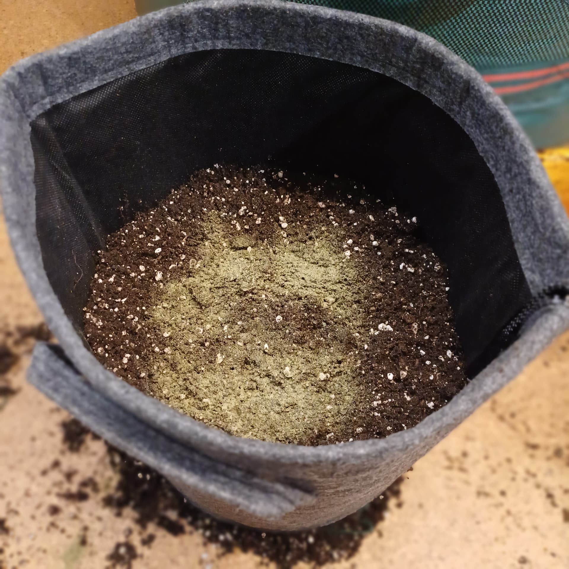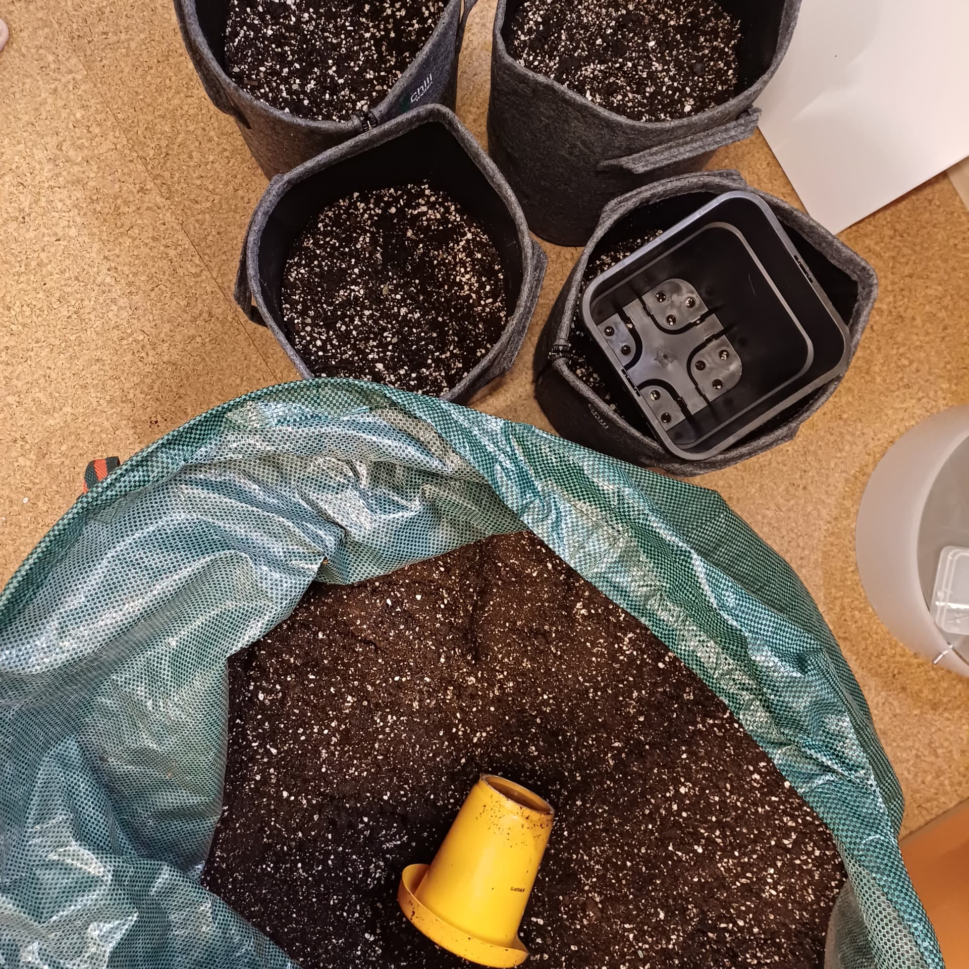 Jeder 15L Stoffie bekam ca 10L Substrat (ca. âhalb vollâ, am Rand etwas verdichtet, sonst nur locker eingefĂŒllt.). So ist genau noch Platz fĂŒr die 3L Pflanzen darĂŒber.