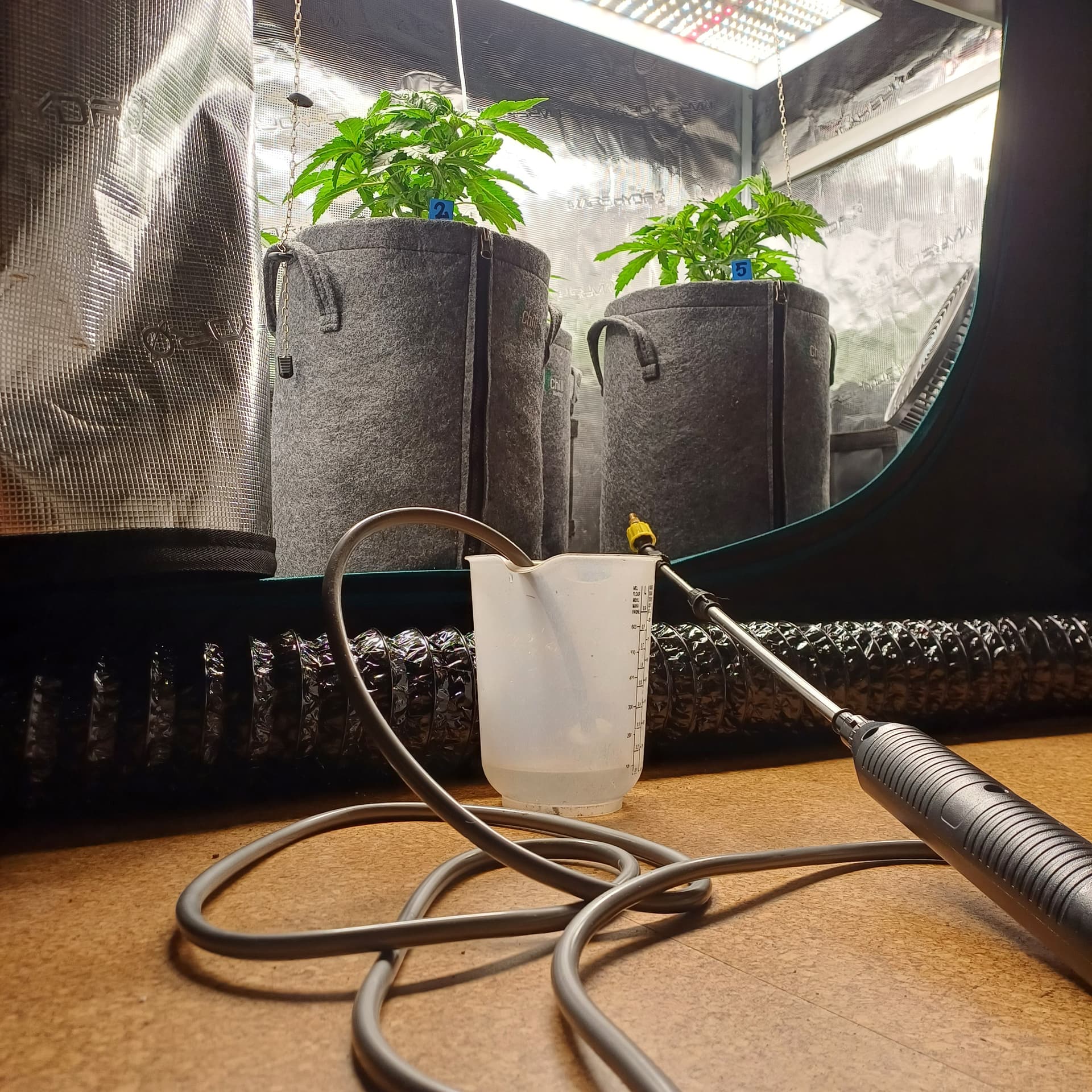 Die Pflanzen sind gut in ihren neuen Töpfen angekommen. Das Substrat um den 3L Ballen war allerdings sehr trocken, also gab es heute zum Aufstehen 2x500ml mit der DĂŒse.