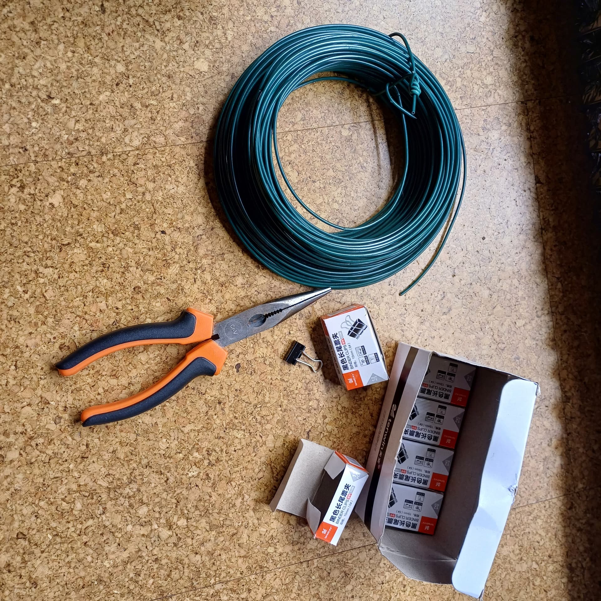 Um eine gleichmĂ€Ăige Verteilung der Hormone in alle 8 neuen Triebspitzen zu erreichen wurde also der trusty old Bindedraht und meine Paperclips ausgepackt, meine Abstandsleiste auf Höhe des derzeit niedrigsten Triebs gebracht. Und losgelegt.