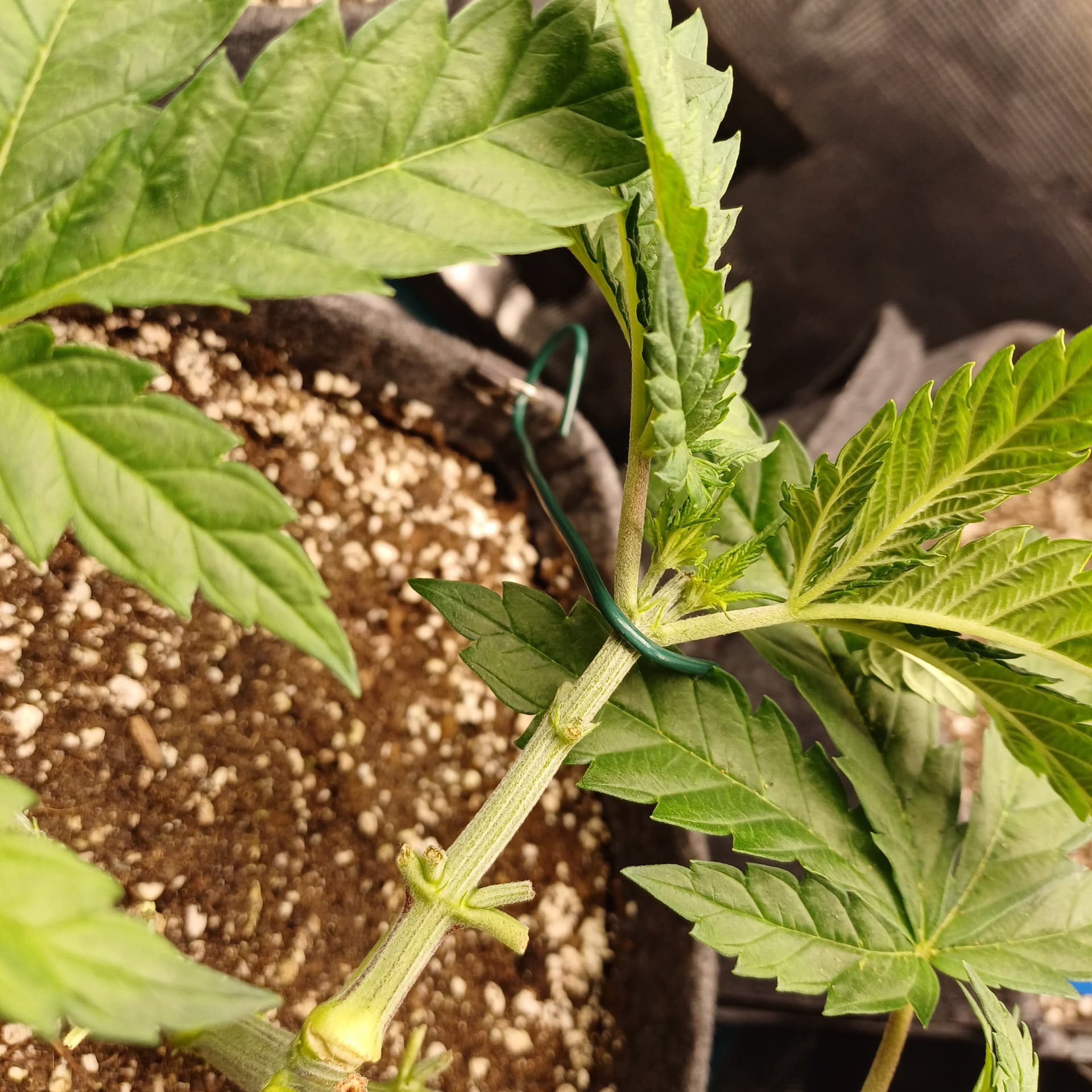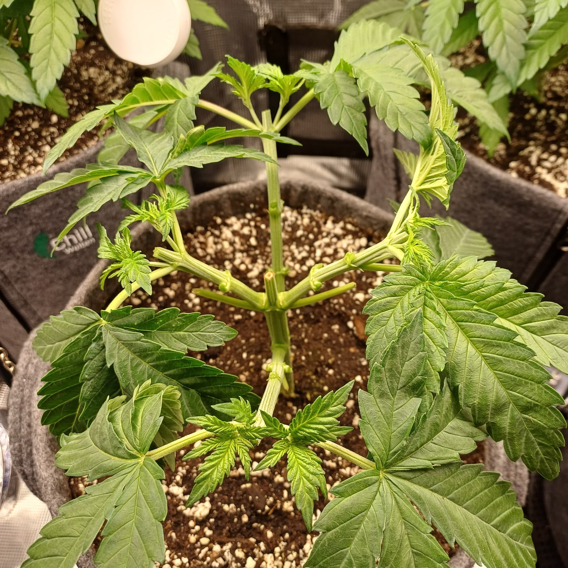Sobald Nodie 3 der 4 Seitentriebe (auf Nodie 2 und 3, bei 4 haben wir gekappt) voll ausgebildet ist wird es Zeit fĂŒr Topping Nummer 2 bevor wir umtopfen können.
