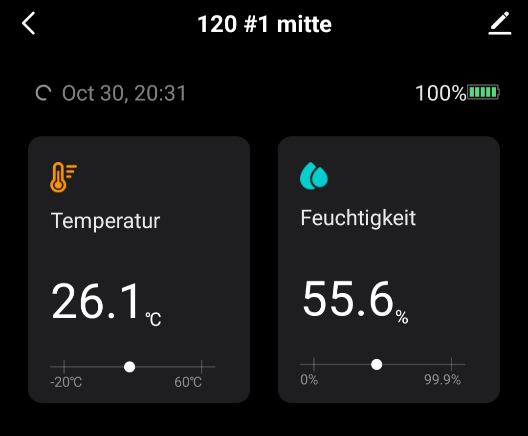 (Jetzt gerade, direkt nach Licht an. Raumwerte entsprechen auch dem Sensor unten - nicht im Bild - das verschiebt sich aber in der Tenperatur, nicht aber RLF).