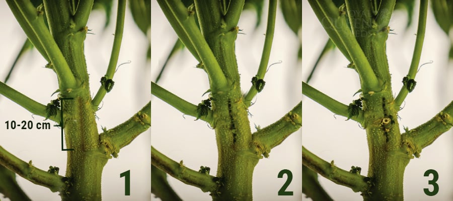 Das Spalten ist eine sehr aggressive, stark stressende Technik und deshalb empfehlen wir sie nur erfahrenen Anbauern. Außerdem empfehlen wir die Stammspaltung nicht bei autoflowering Sorten vorzunehmen, da dies viel zu heftig für sie sein kann.