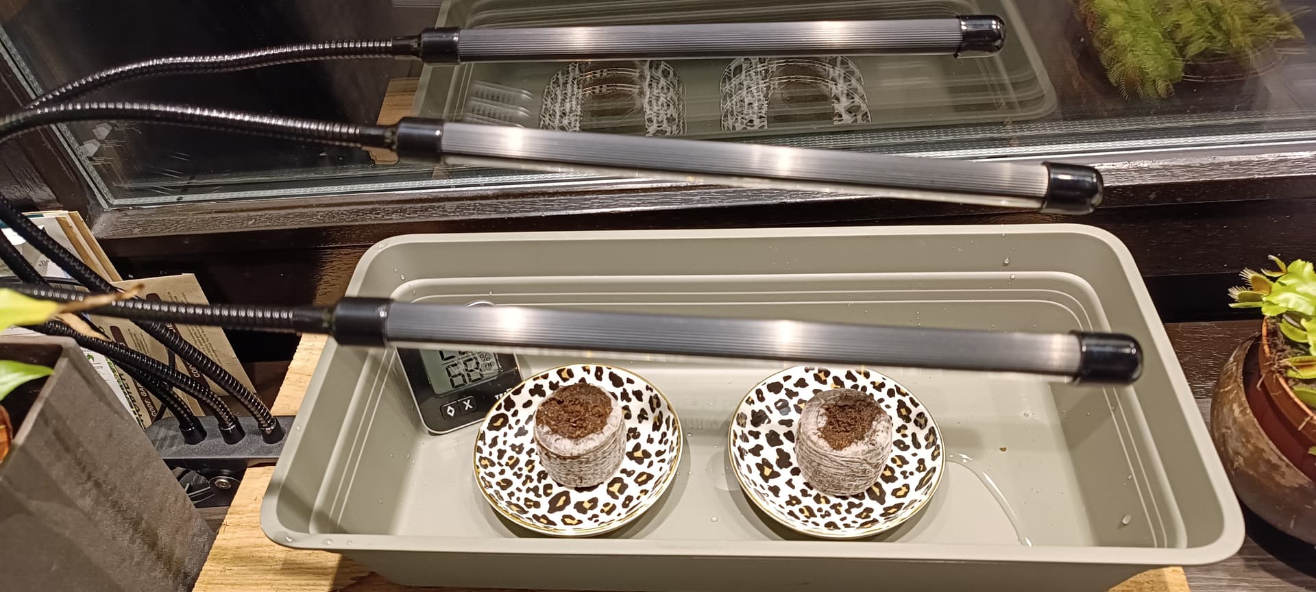 Geplant ist die Keimung in Wasser und die Anzucht in Jiffys Indoor. Dafür gibt es ein schönes großes Südfenster, ein Indoor Mini Gewächshaus und eine Billo LED Pflanzenlampe von Amazon.