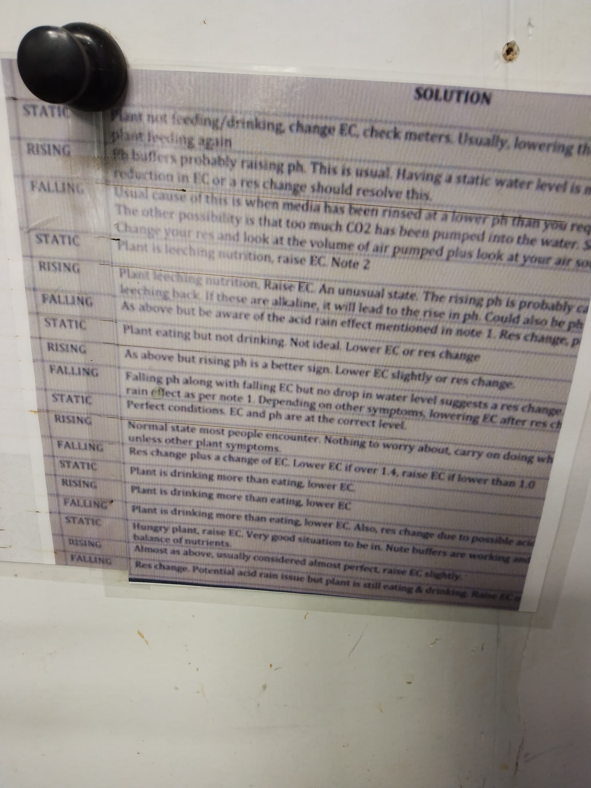 Erst wenn man das System richtig eingestellt hat, veraendert sich der PH und EC Wert nicht mehr. Dann verringert sich nur noch der Fuellstand bis zu dem Punkt wo die Lady’s nach mehr Food verlangen. Ich checke zwar jeden Tag die NL vorm ersten Fluten, aber ich reguliere da nicht sofort rum wenn es mal nicht 5.8 ist.Ich guck da auf meine Tabelle und lass mich davon leiten. Manchmal ist es ja nicht schlimm wenn der PH faellt oder steigt. Manchmal ist das ja gut und nuetzlich.Da meine Growtage abends um 7 anfangen, checke ich das nur einmal am Tag. Ich hab keinen Bock nachts um 3 aufzustehen …