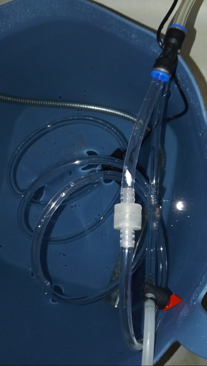 Wasser in das DG tragen fetzt weder mit noch ohne Krücken, also Kübel der 30 l fasst in die Dusche im 1.OG, 12m Schlauchwasserwaage nach oben zu den Mädels verlegt, in den Kübel ne Kondensatpumpe rein, die 3m Höhenunterschied schafft und es kommt oben nur Getröpfel an.