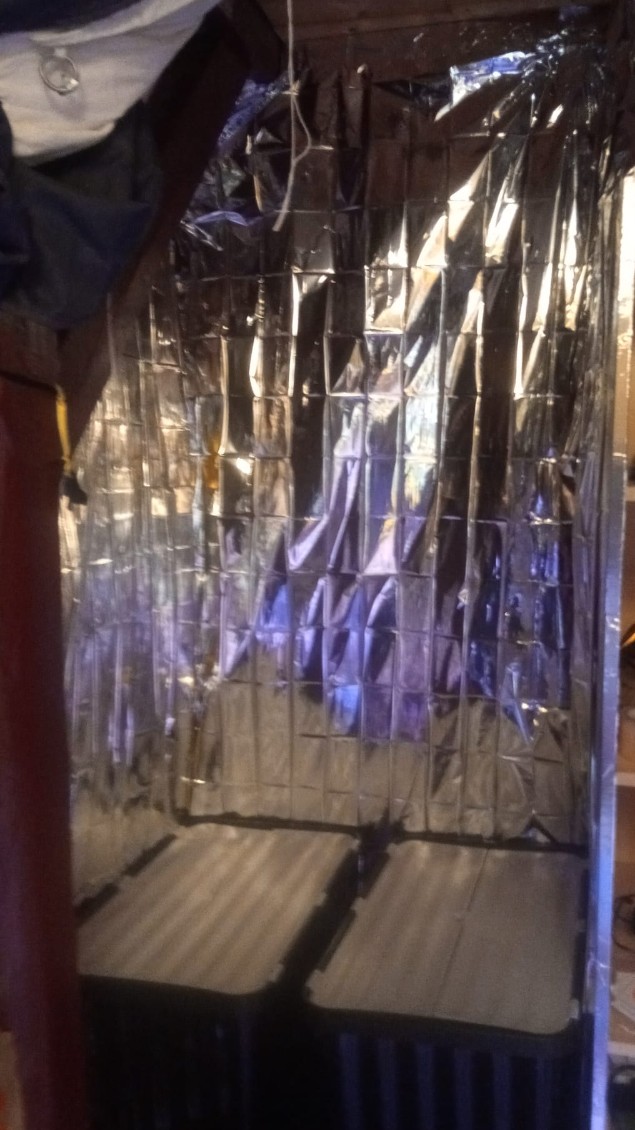 Lüfter vorn rechts, Nebelmaschine, lichtdichte Vorhänge und weil die schwarz sind, innen zusätzlich nen weißen.
