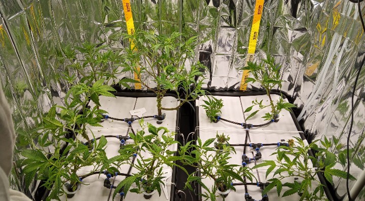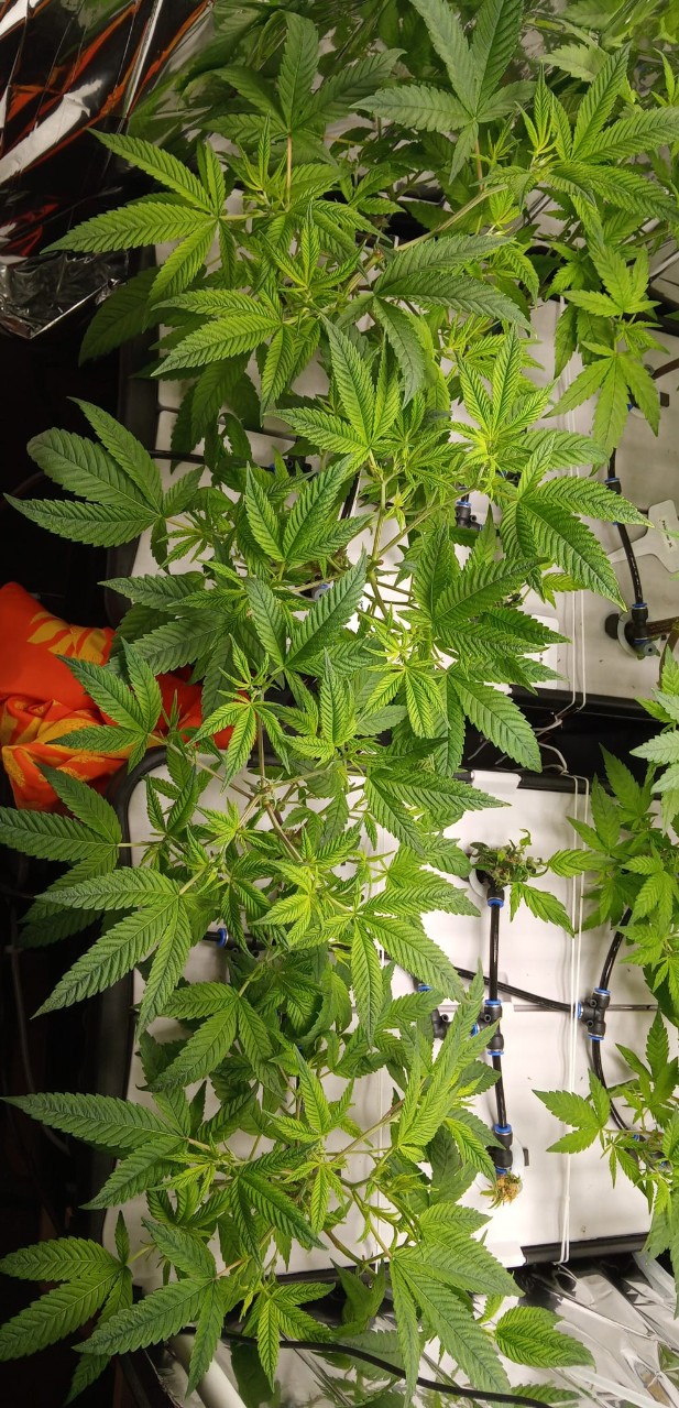 Die Purple Bud (mittlere Reihe) sind bissl mickrig, waren aber auch schon am längsten in der Blüte. Hinten Painkiller, vorn CBD. Alle haben ordentlich Wurzeln, NL Plagron Hydro nach Plan. Dürfen sich jetzt an die neue Hütte und Lampe gewöhnen.