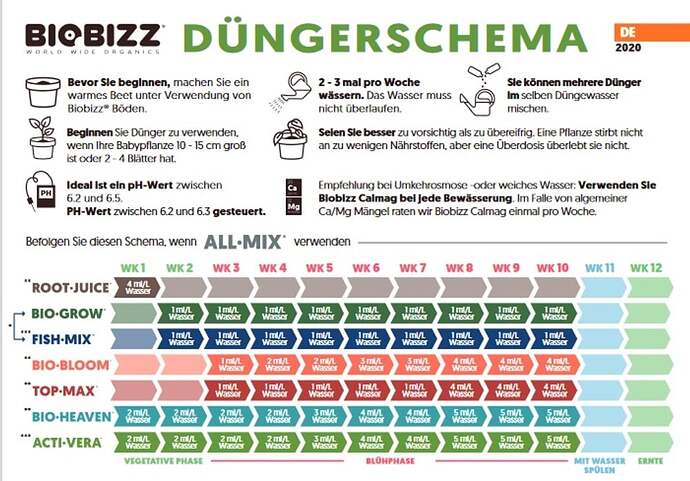 | BioBizz | Sobald Pflanze etwa 10-15 cm groß ist oder 2 – 4 Blätter hat. | Zum Schema |