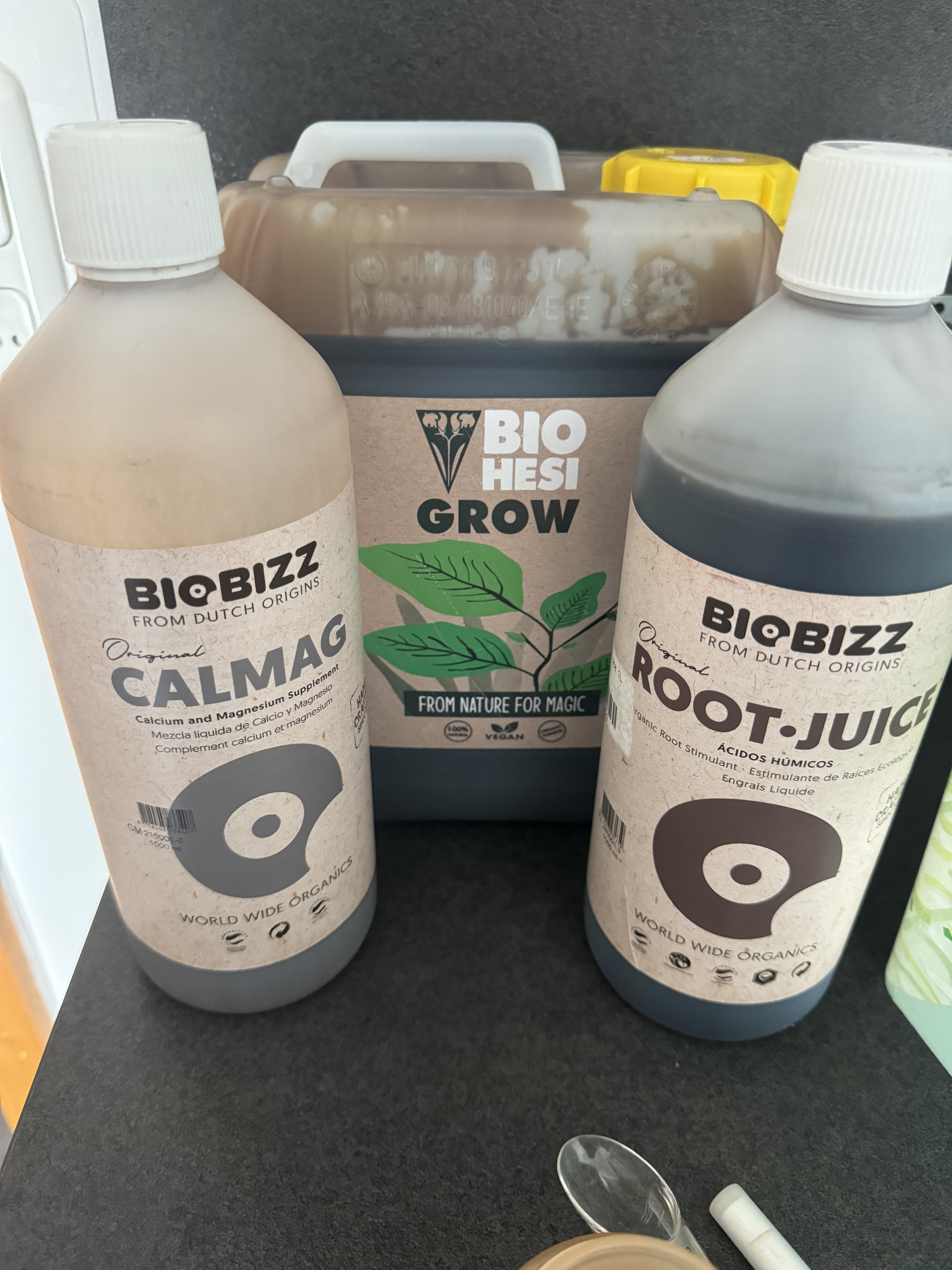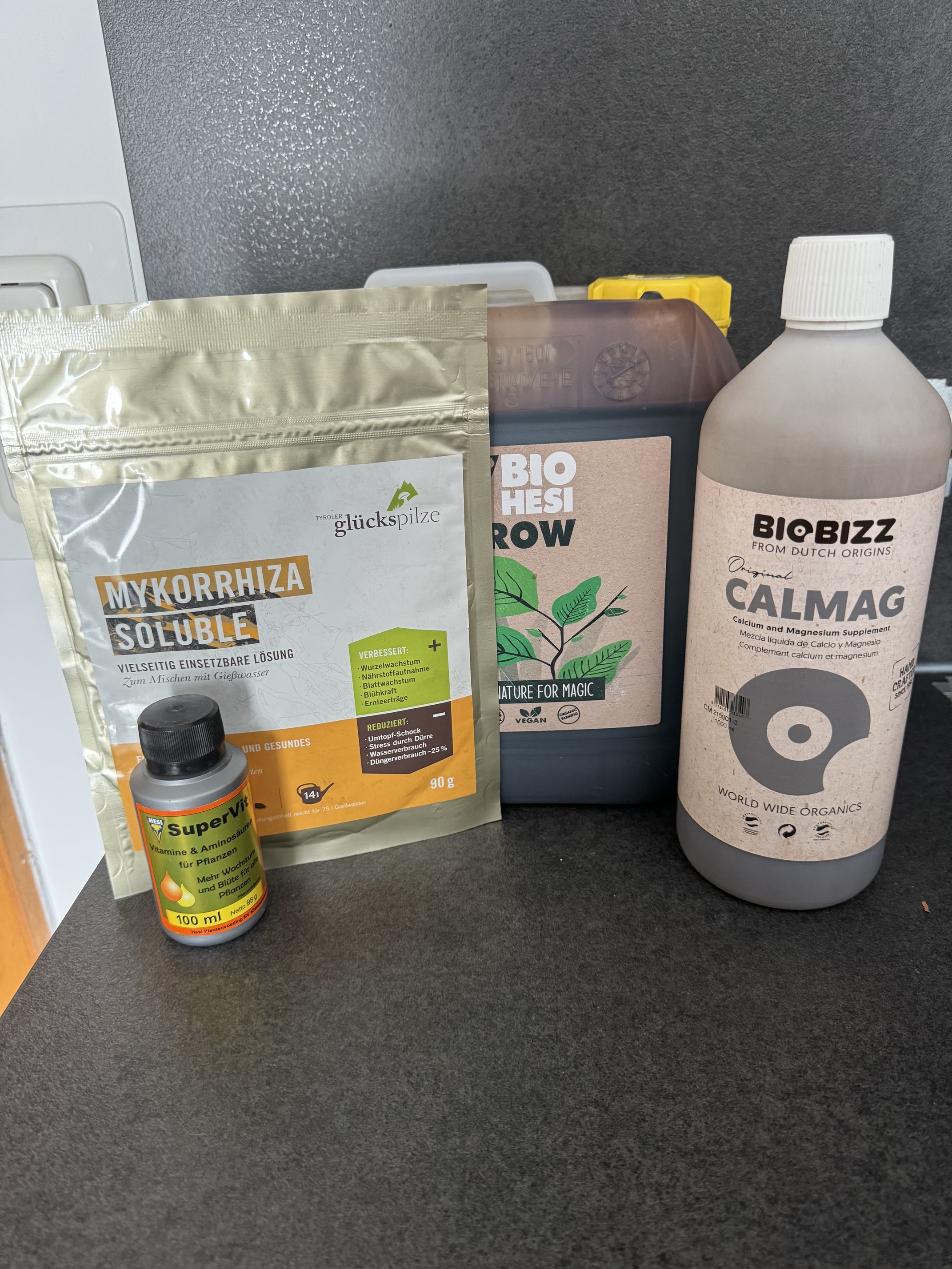 Für die Korrektur meines Wassers in den verschiedenen Stadien nutze ich: Mono Magnesium von Canna, CalMag von BioBizz und vielleicht Bittersalz falls nötig.