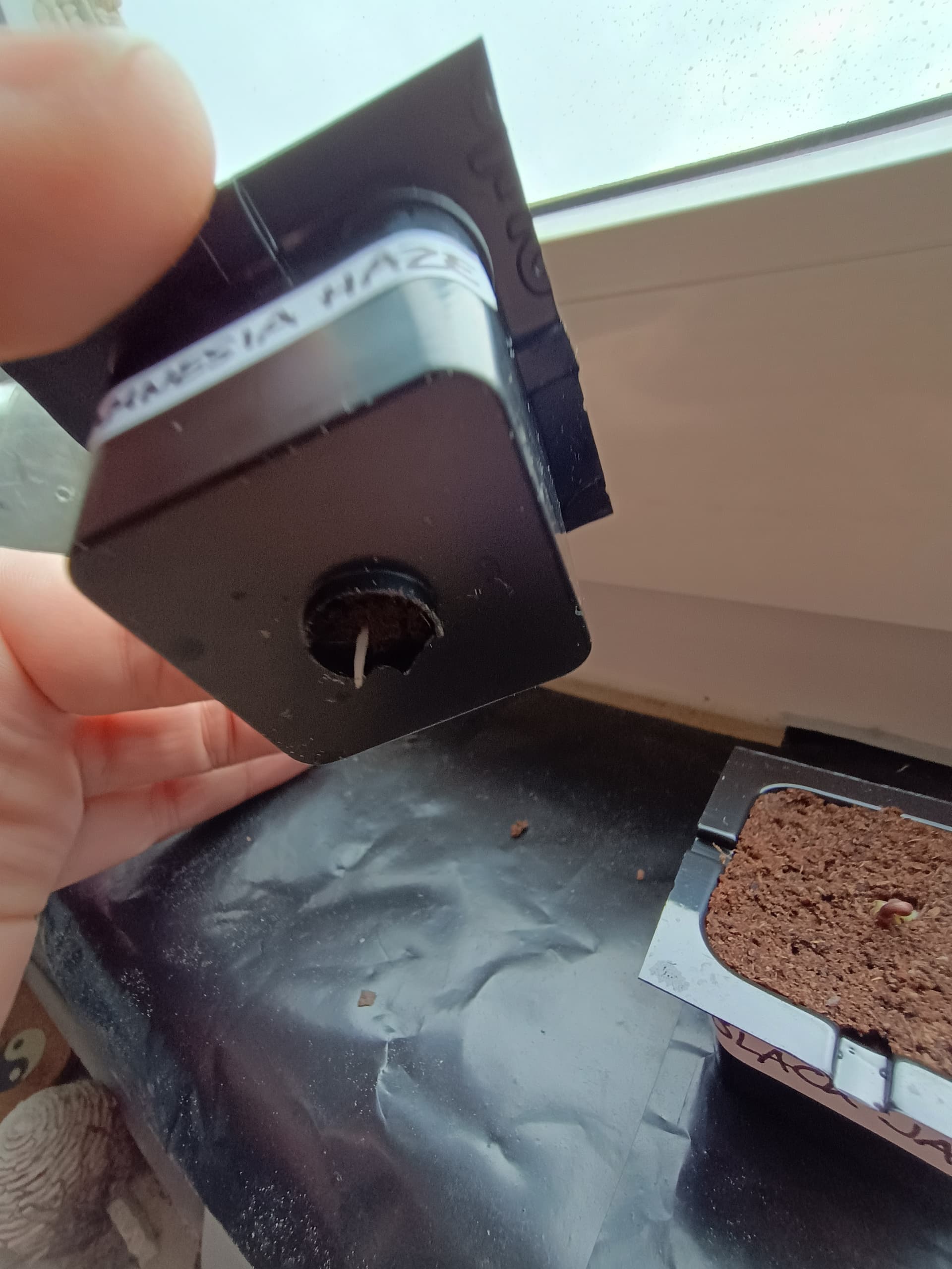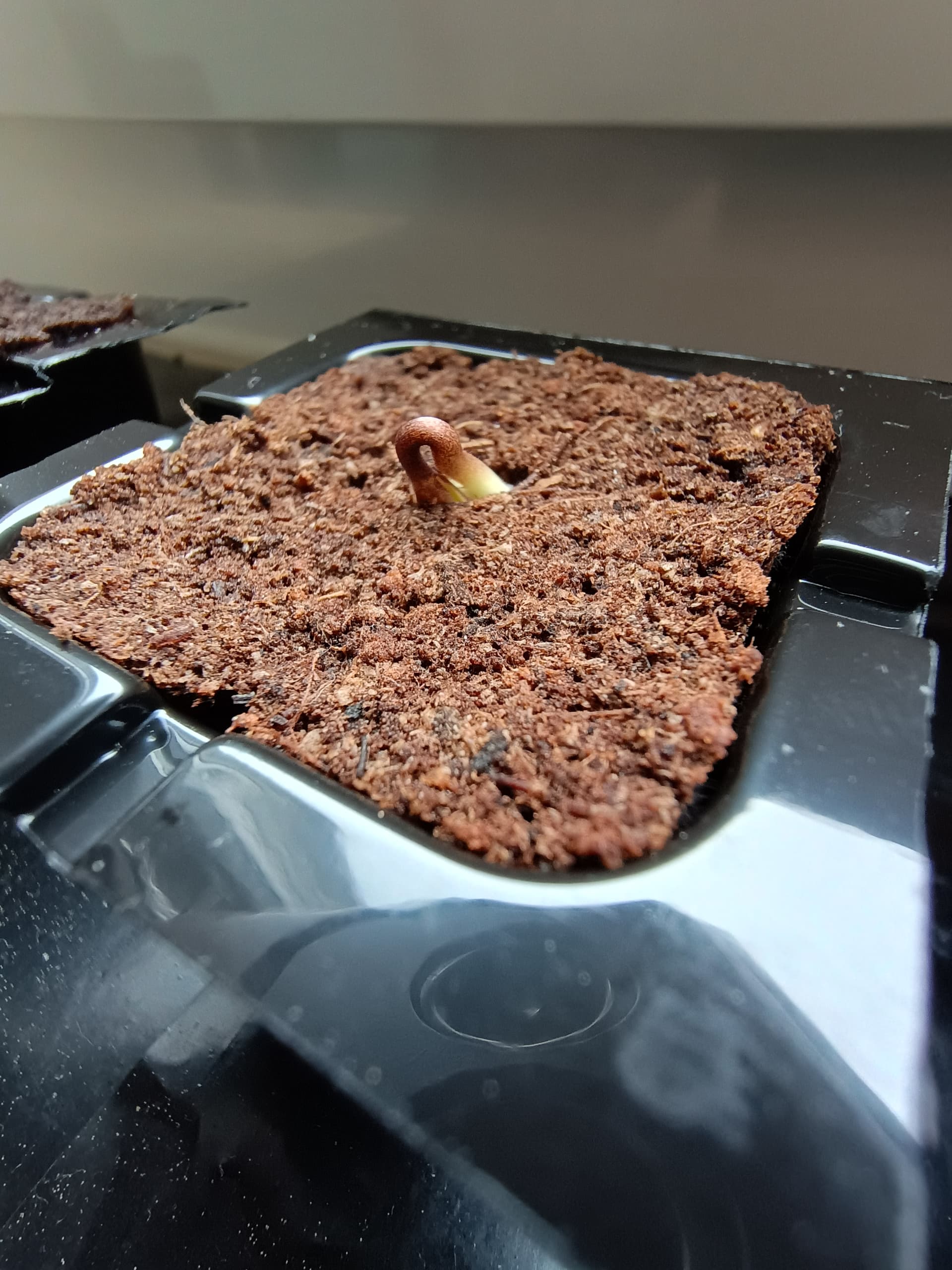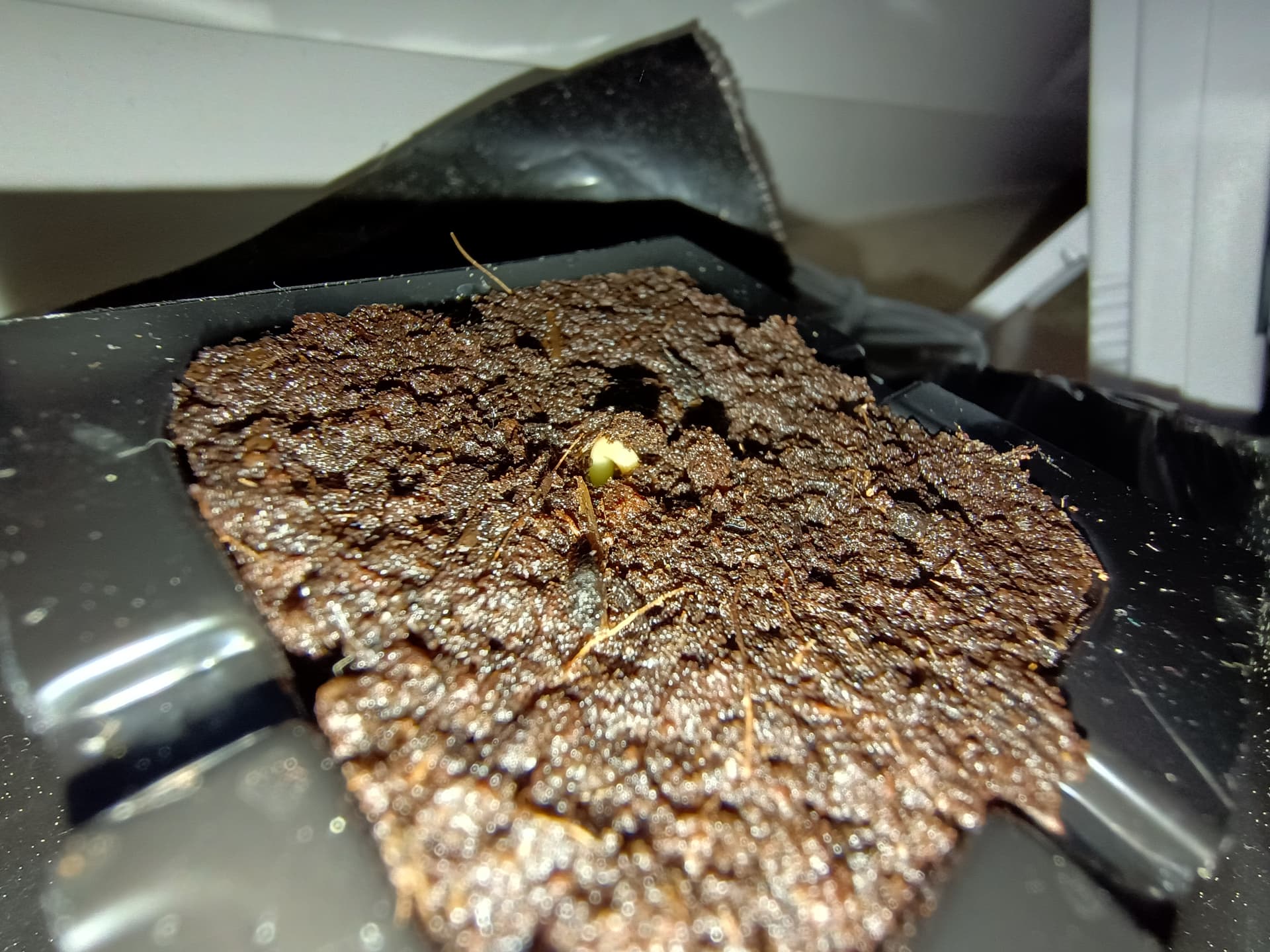 Black Jack schwächelt immer noch ein bisschen, will den Kopf irgendwie nicht weiter rausheben. Die Spitze der Wurzel schaut unten aber auch schon ganz leicht raus. Hab mit einem Zerstäuber den Würfel nochmal ganz leicht befeuchtet da er schon recht trocken war, habe den glaube ich beim Einplanzen nicht ordentlich getränkt wie die anderen beiden.