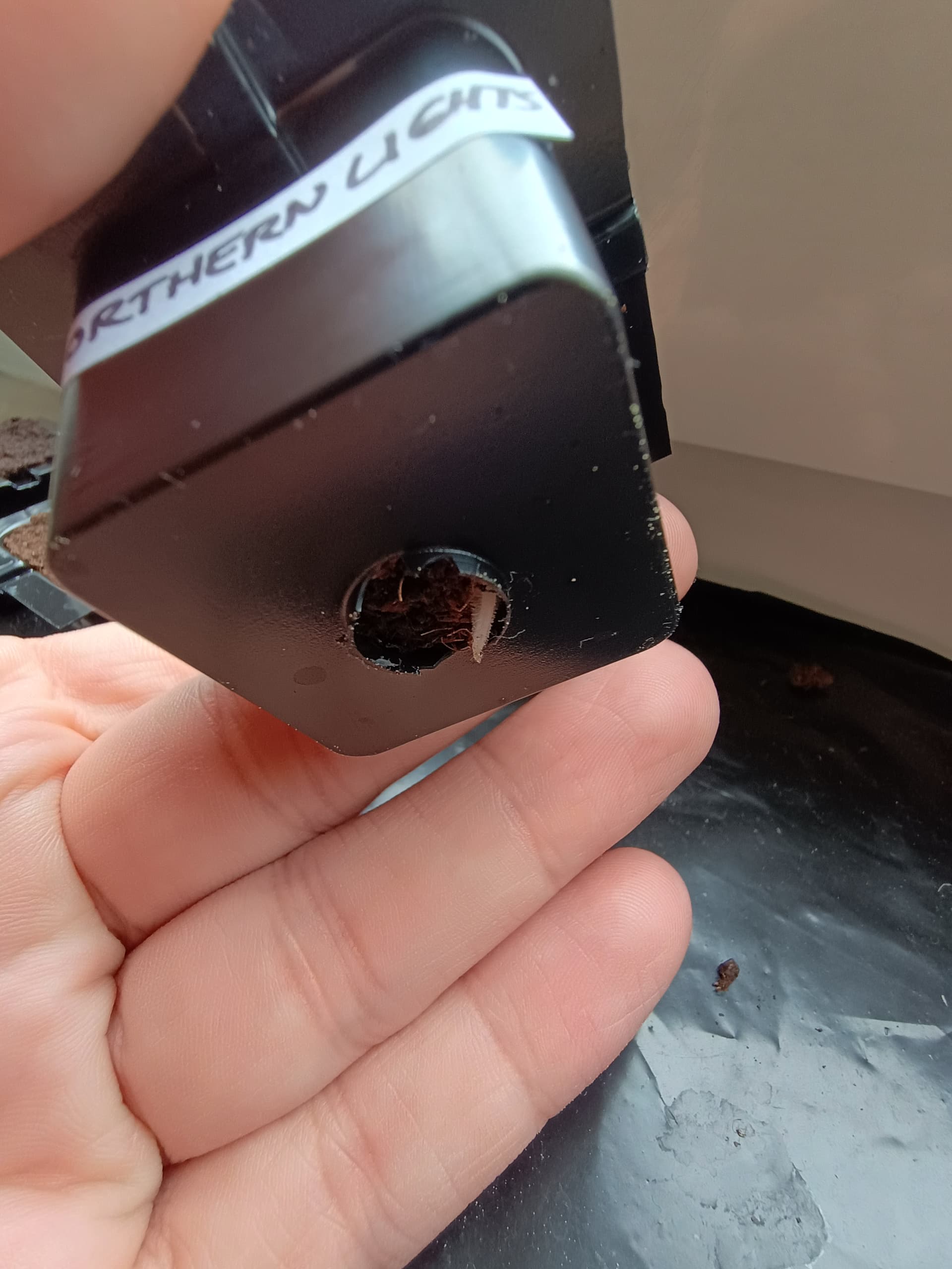 Northern Lights (der 1.50 Euro Billosamen) schon sehr deutlich sichtbar, der kommt heute sicherlich raus. Bei den anderen beiden sieht man unter der Erde auch schon die Wurzel rausleuchten wenn man genau hinschaut.