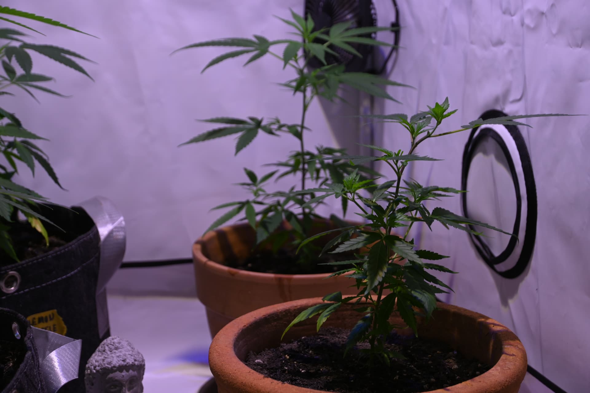 Ich muss zugeben, dass wir (höchstwahrscheinlich unfachmännisch) die Pflanzen getoppt haben. Dies hatte den Hintergrund, das brennende Interesse zu stillen, selbst zu erleben, was mit einer Pflanze passiert, wenn man ihr den Kopf abschneidet (oh). Leider ist bisher noch gar nichts passiert, und der Traum von einer schönen #BonsaiCannabispflanze liegt in weiter Ferne haha. Dennoch eine wertvolle Erfahrung, da Topping nicht gleich Topping ist. Die Pflanze ist ein Lebewesen und möchte liebevoll behandelt werden. Das haben wir jetzt schon gelernt. Ich bilde mir auch ein, dass die Pflanze hormonell bedingt ein wenig in die Breite geht. Die einzige Pflanze die nicht getoppt wurde, ist die Dame hinten rechts.