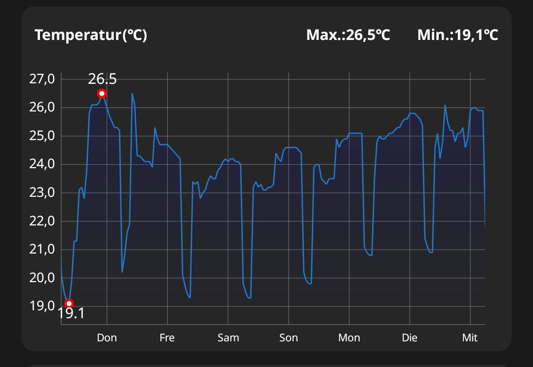Hier ist mein Temperatur Verlauf der letzten Woche. Zelt steht im Nebenraum. Dieser hat ca 20°
