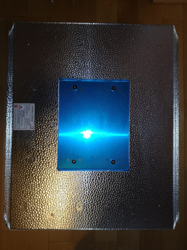 Allerdings wird der Bereich direkt unter der Lampe recht warm mit bis zu 55ºC. Der Aluminiumrahmen der Lampe erhitzt sich auf bis zu 53ºC bei 100% Leistung. Daher sollte man für eine gute Um- sowie Abluft sorgen, damit die Temperaturen im Zelt nicht zu sehr in die Höhe klettern.
