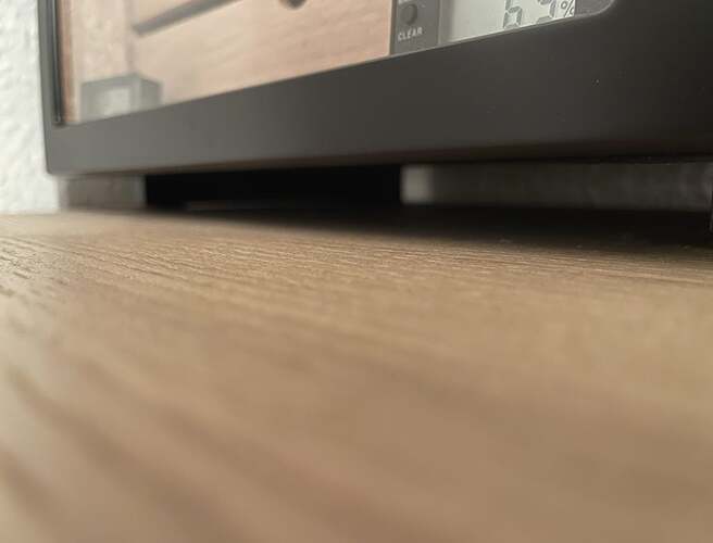 Die Tür hängt etwas und wurde von mir nachjustiert, ein Fuß musste mit einer Cent-Münze unterlegt werden und die Tür ist aus Plexiglas. Das Hygrometer schleppt 2 bis 3 Stunden hinterher, ist dann aber relativ genau.
