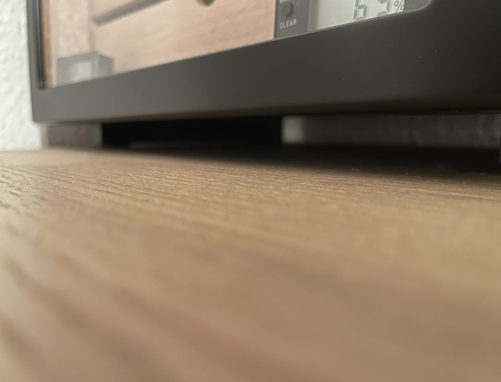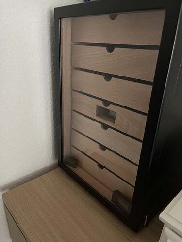 Anfangs habe ich die mitgelieferten Kristallbefeuchter nur übergangsweise eingelegt. Für das eigentliche Einfahren habe ich 2x 84% 320g Boveda Päckchen bestellt. Dann habe ich etwa drei Tage später bei jetzt schon 45% Luftfeuchtigkeit (RLF) die Kristallbefeuchter gegen die Bovedas ausgetauscht. Jetzt heißt es warten laut Bedienungsanleitung. Man soll 14 Tage lang den Schrank nicht öffnen, das habe ich auch getan.